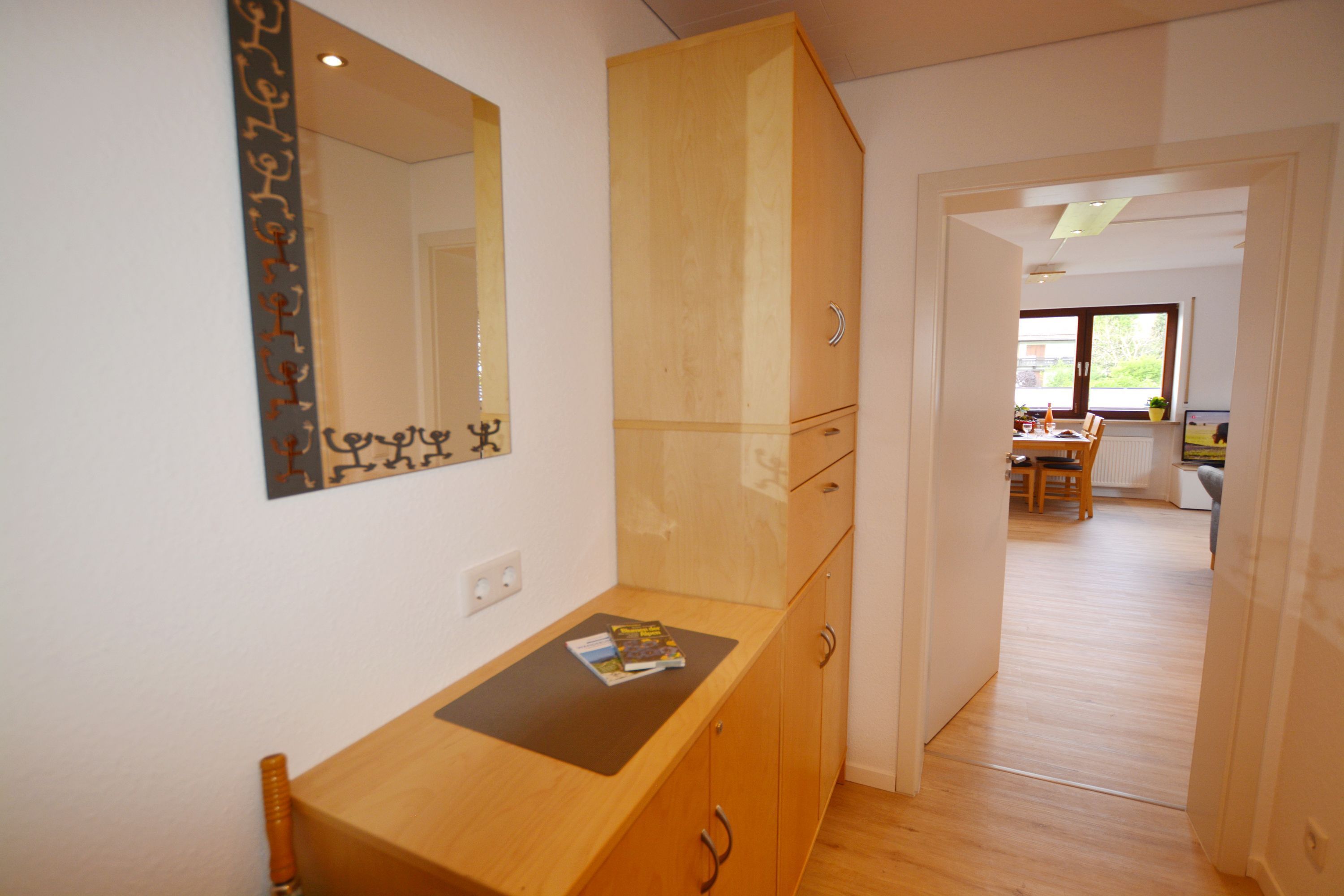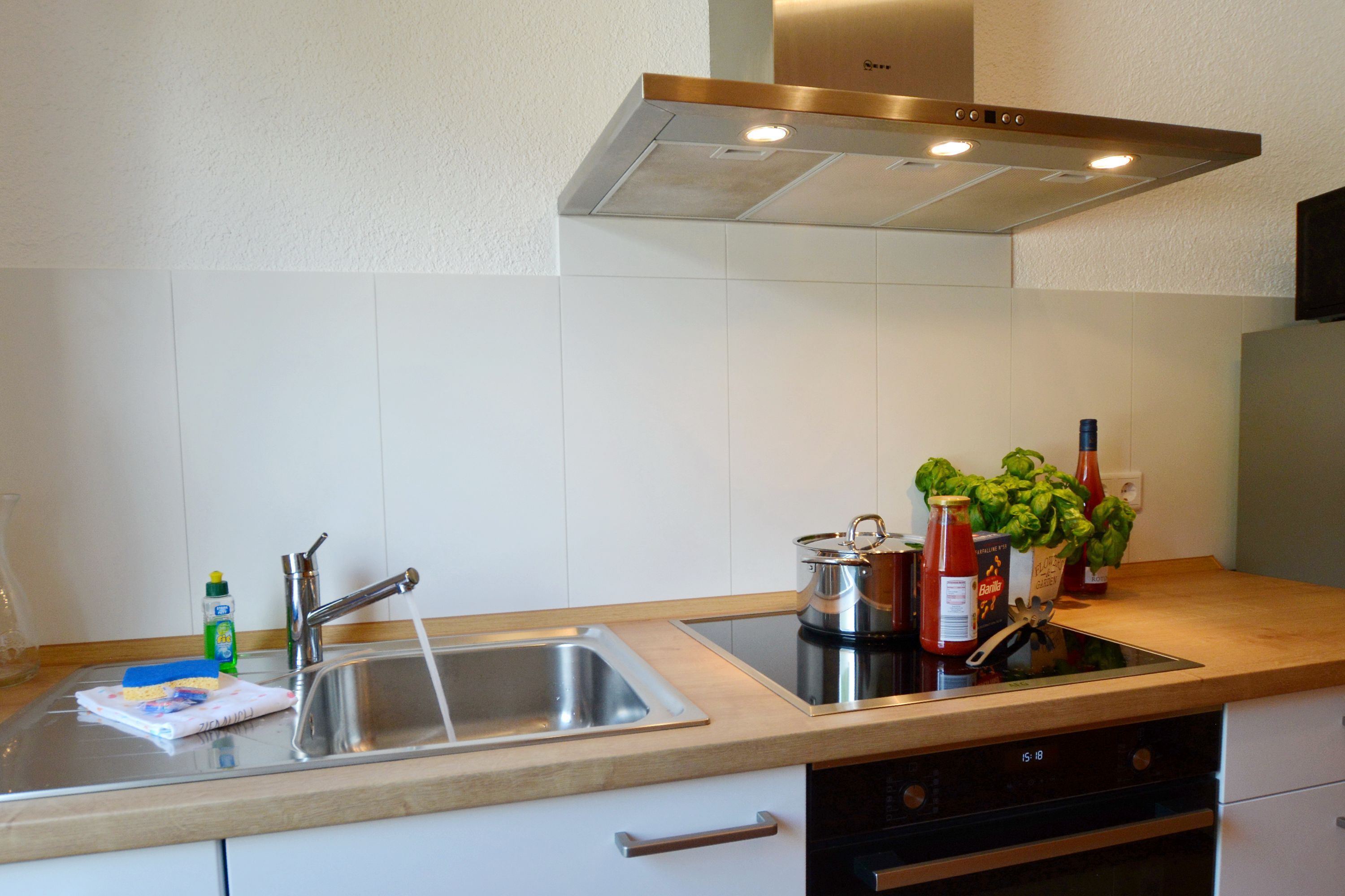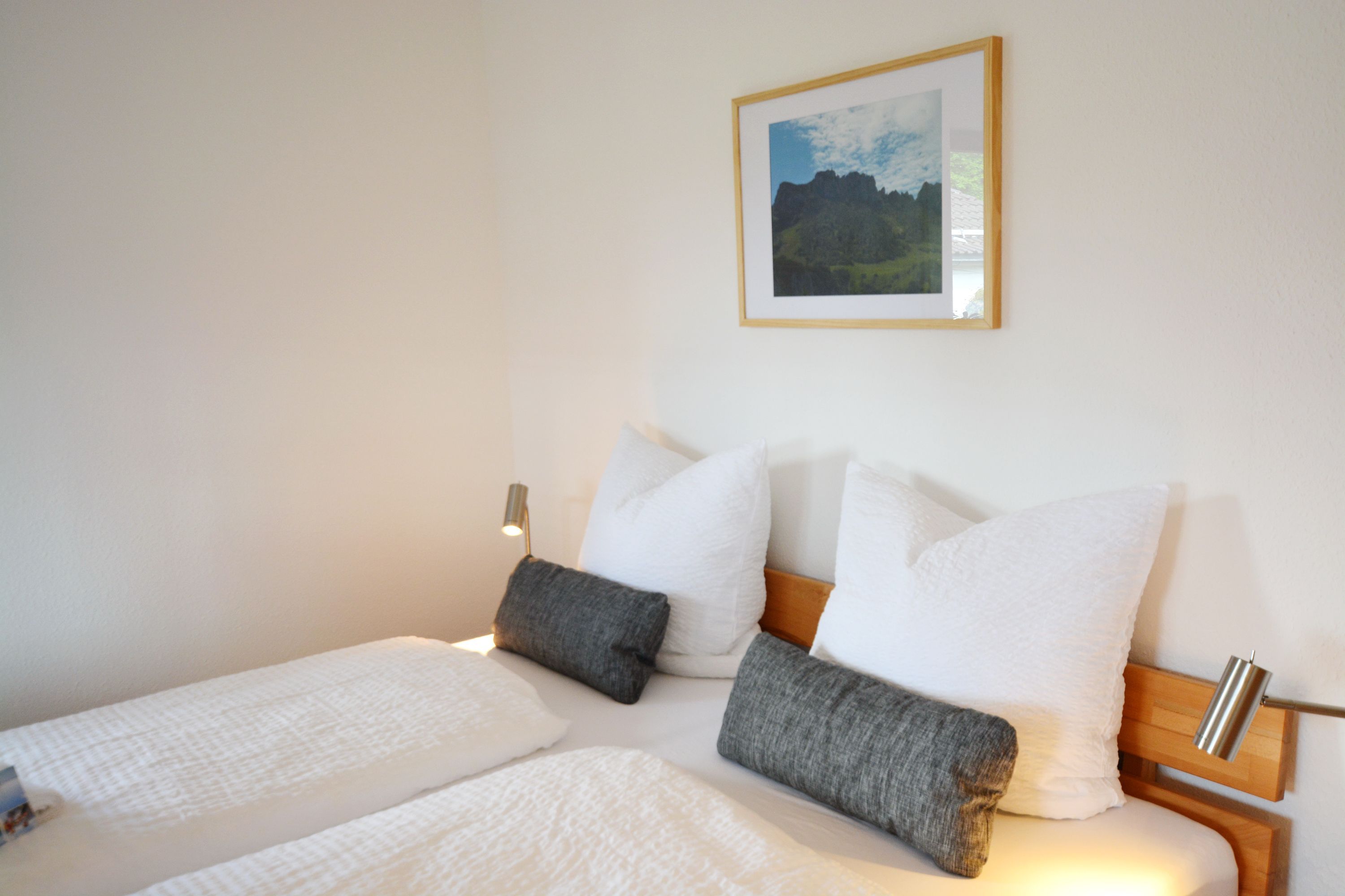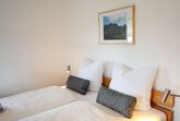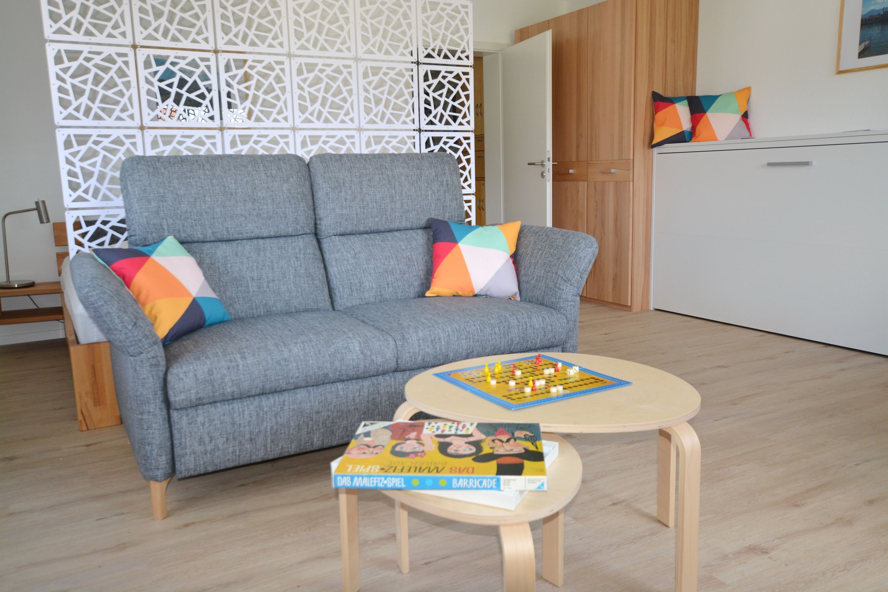 Geschickt durchdacht sind der Wohn- und Schlafbereich und dadurch ein gemütlicher Ort entstanden. Der Wohnbereich umfasst Essbereich, Sofa und Fernseher. Von hier aus gelangen Sie auf den Ostbalkon. Durch das platzsparende Raumteilerelement sind Wohn- und Schlafbereich in zwei Bereiche gegliedert und das Doppelbett so vom Sofa getrennt. Rollläden sind selbstverständlich. Über den Flur gelangen Sie in die voll ausgestattete Küche mit Spülmaschine, Induktionskochfeld, Backofen, Kühlschrank, Gefrierschrank, Kaffee- und Senseo-Maschine, Mikrowelle und vielem mehr. Ergänzt wird das Apartment durch das Badezimmer, welches mit Dusche und WC versehen ist.
