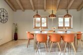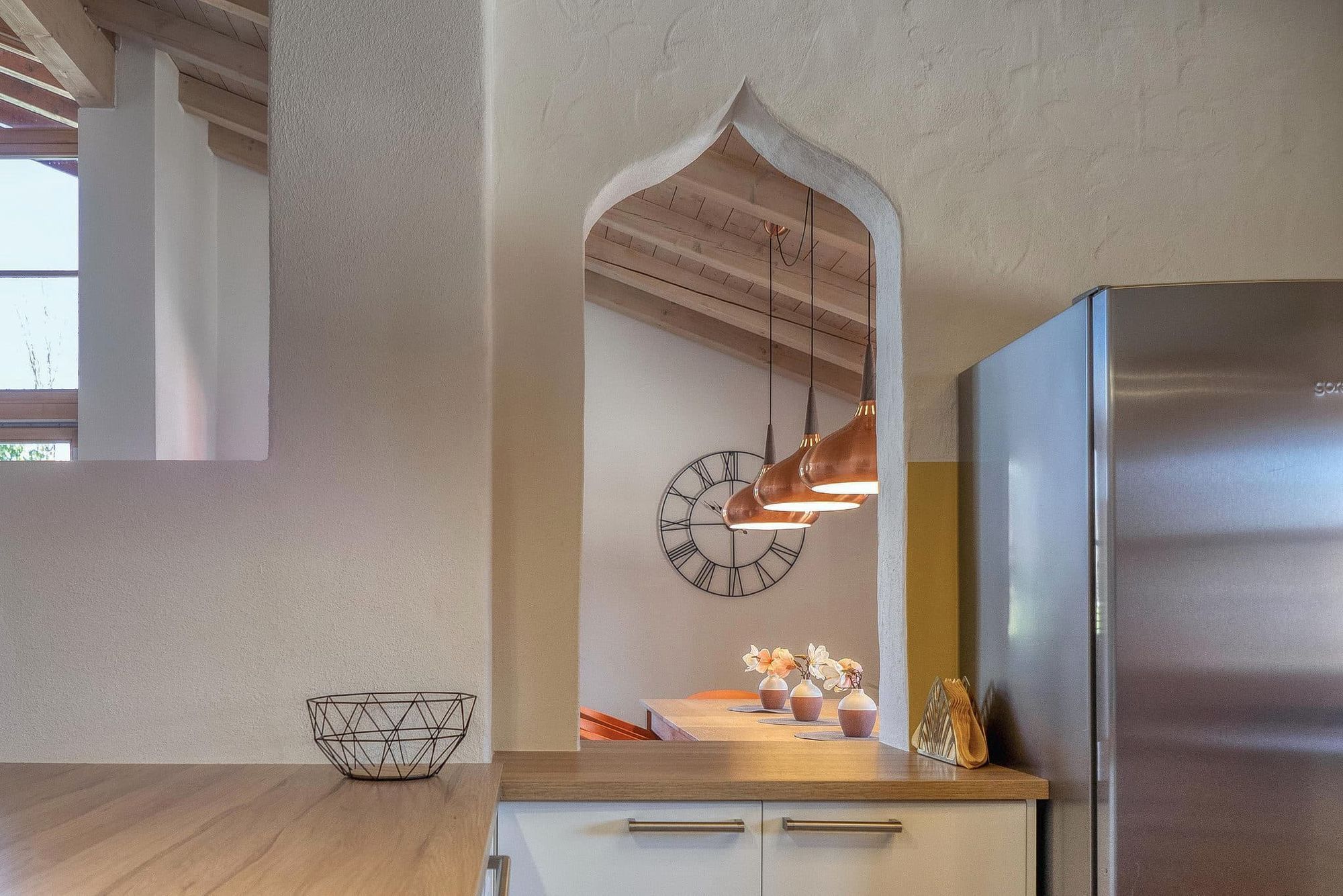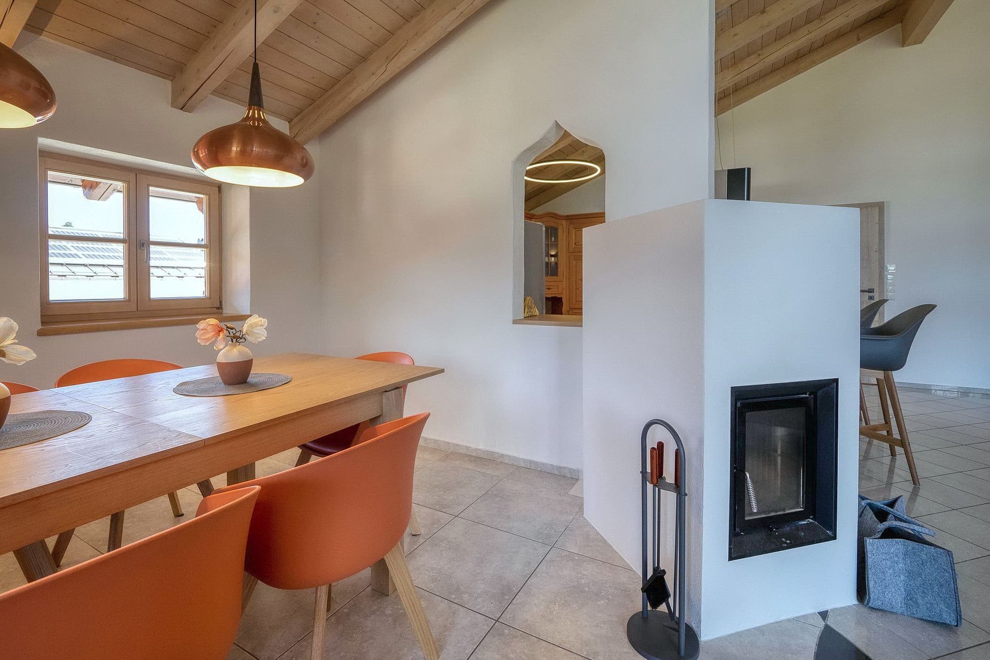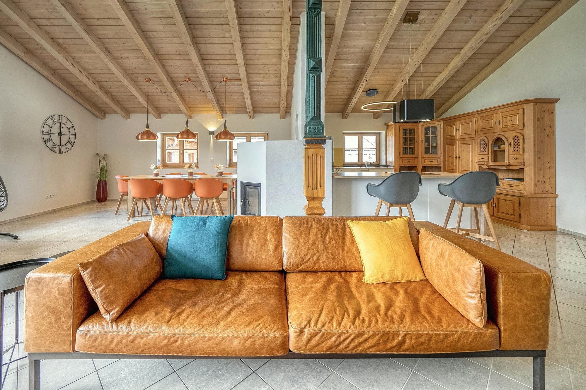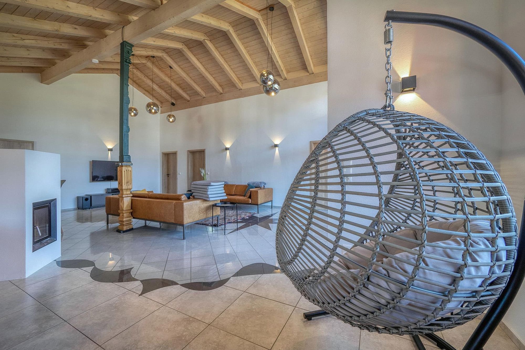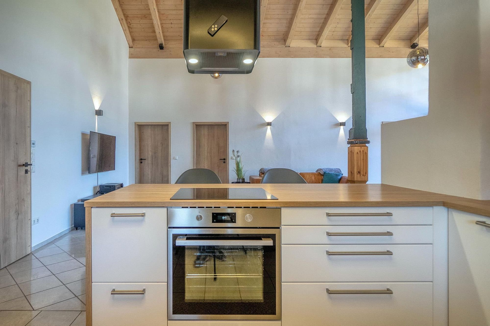 Der Wohnbereich mit 5 Meter hohem Sichtdachstuhl und komplett zu öffnender Glasfront auf die Terrasse lässt keine Wünsche offen. Im Wohnbereich integriert ist die offene voll ausgestattete Küche mit Kochinsel.