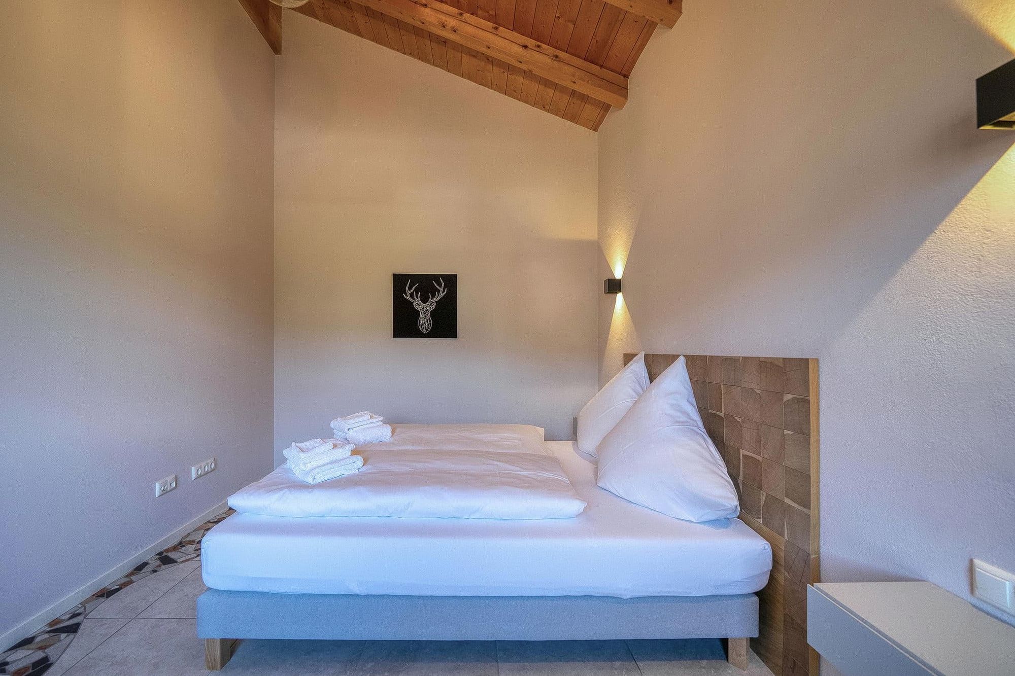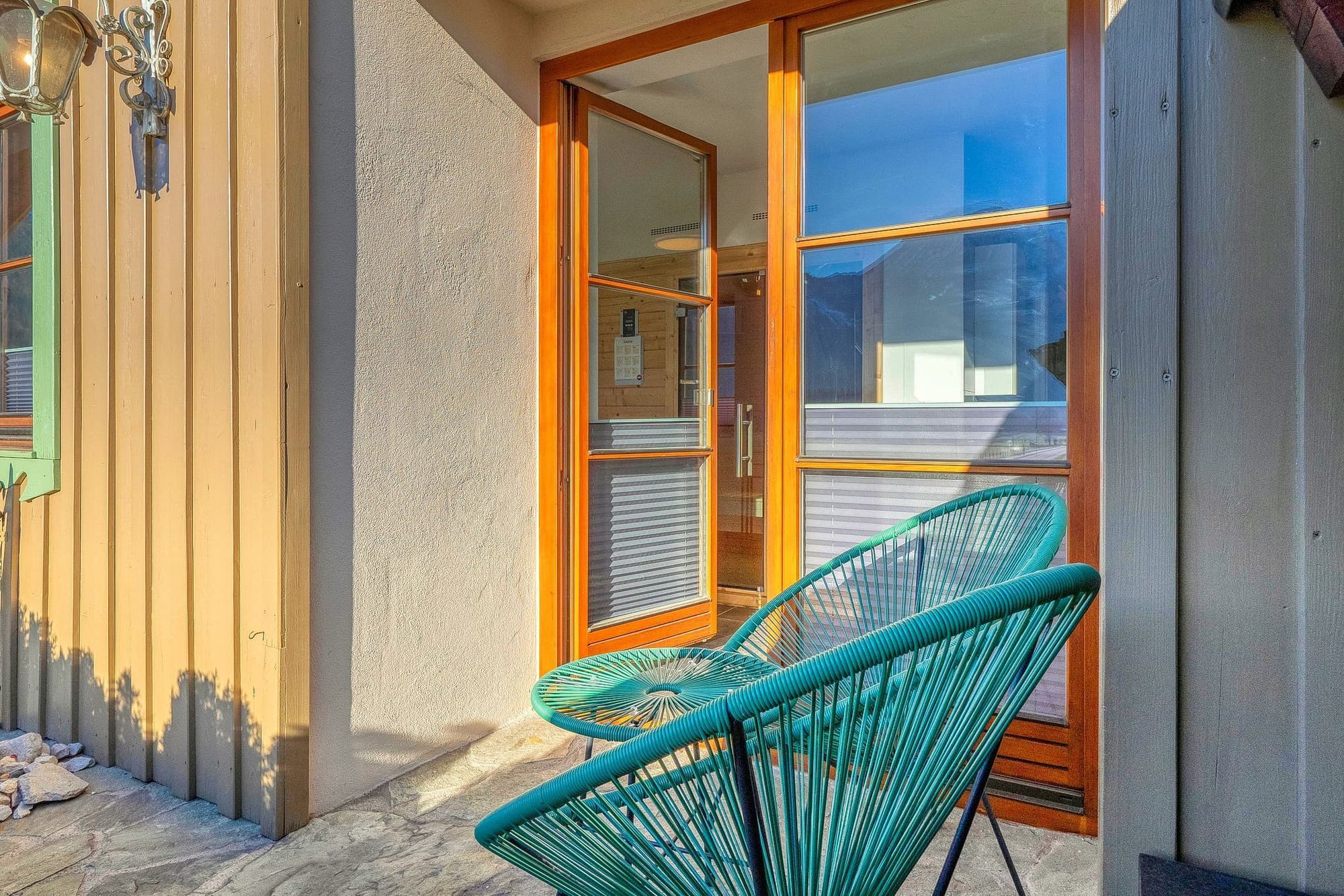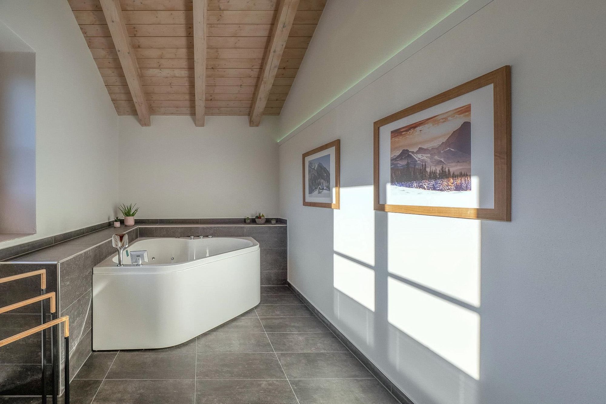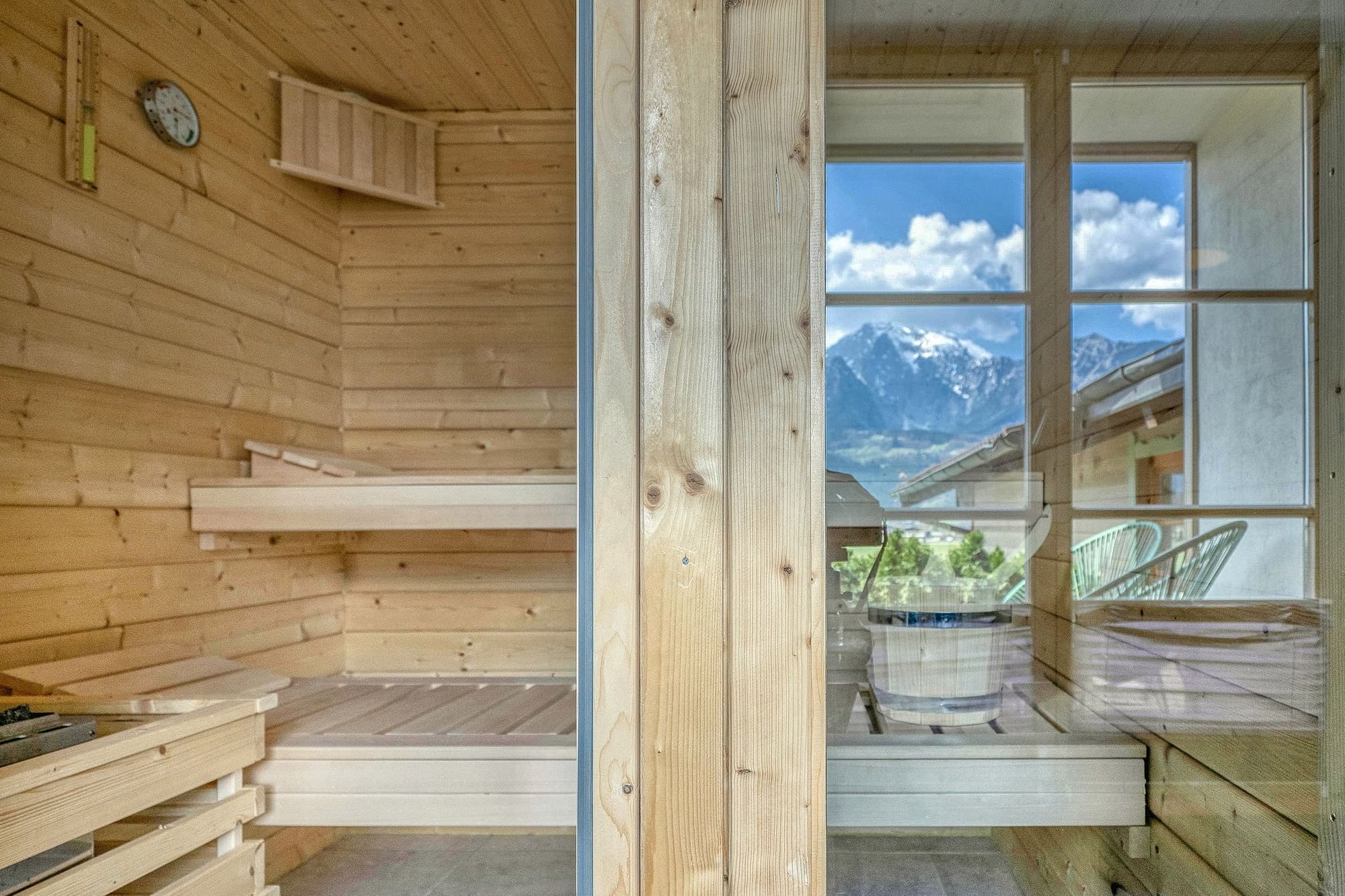 Die Wohnung verfügt über drei Schlafzimmer mit Doppelbett, ein Kinderzimmer mit Etagenbett, 2 Badezimmer und einen Wellnessbereich mit Sauna und Whirlpool. Der Whirlpool verfügt über etliche Düsen und Lichtstimmungen, gleich angrenzend befindet sich die Sauna für 4 Personen, von welcher Sie ebenfalls einen traumhaften Blick auf die Berglandschaft haben.
