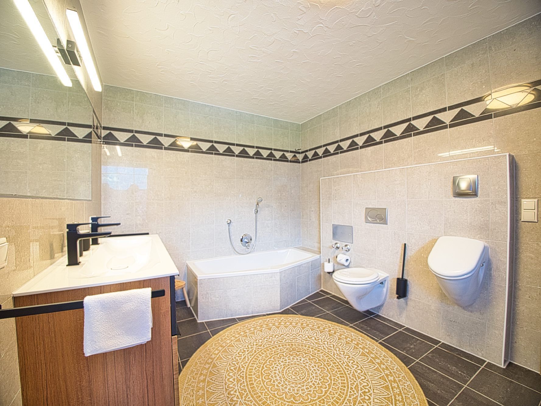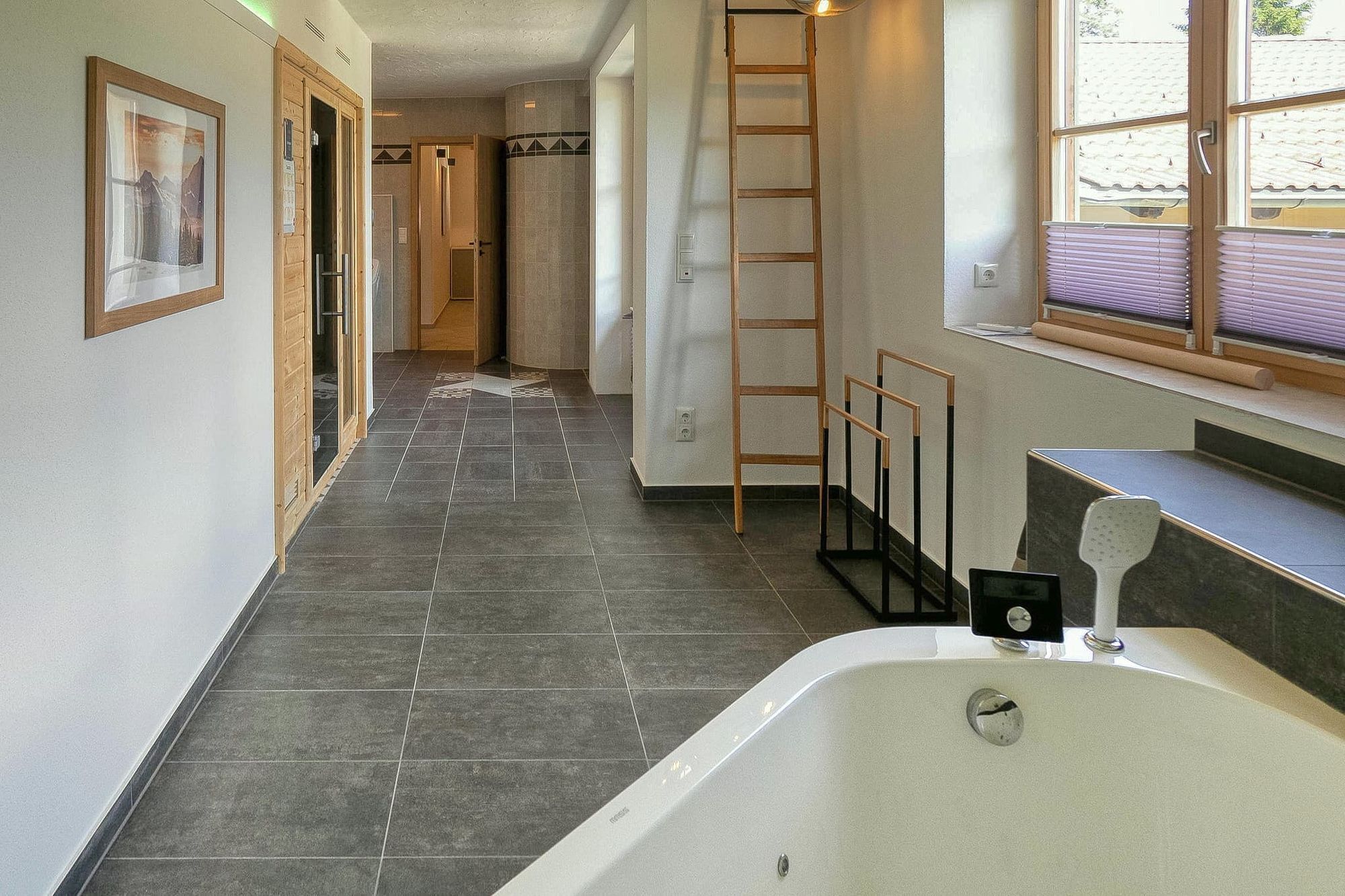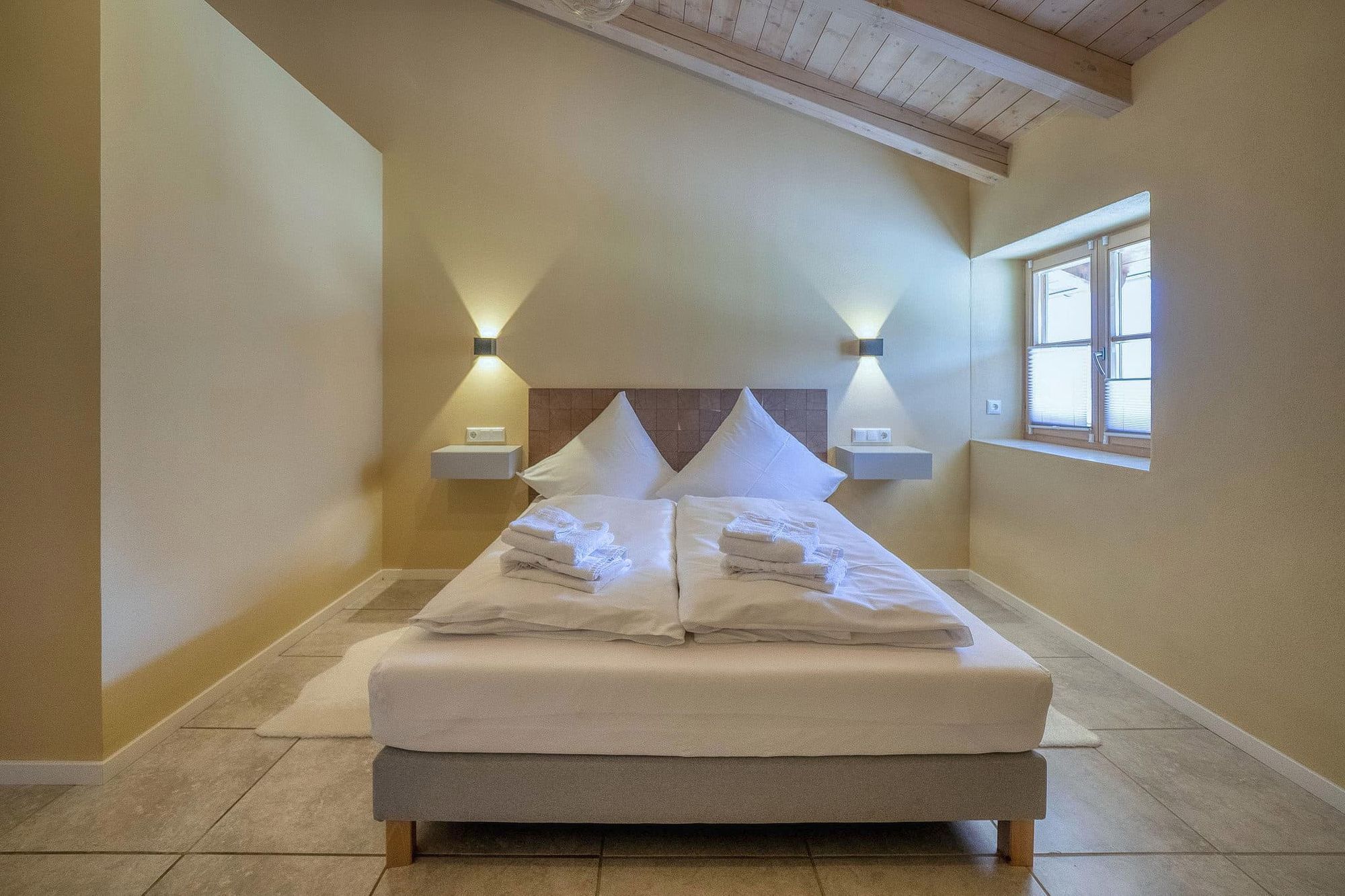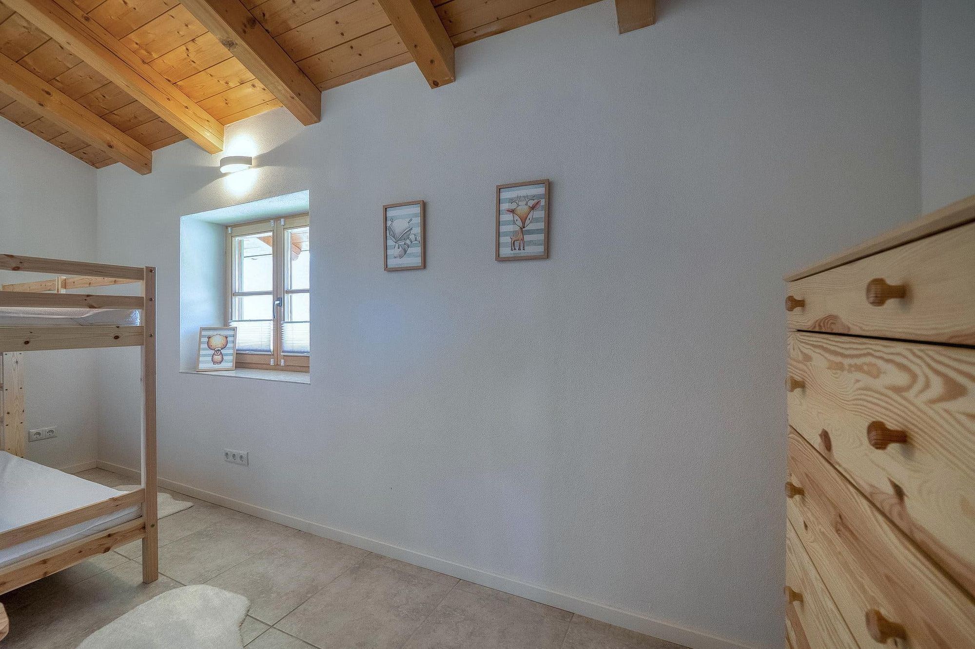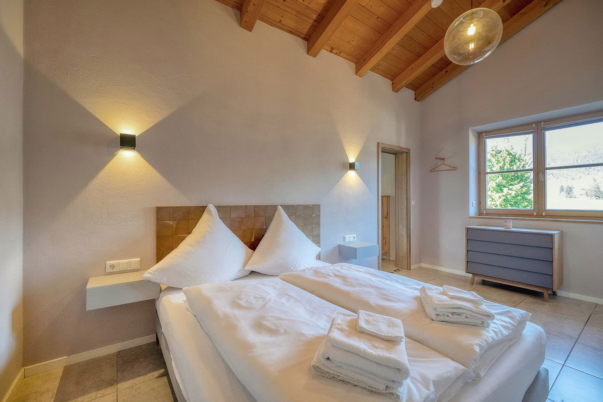 Die Wohnung verfügt über drei Schlafzimmer mit Doppelbett, ein Kinderzimmer mit Etagenbett, 2 Badezimmer und einen Wellnessbereich mit Sauna und Whirlpool. Der Whirlpool verfügt über etliche Düsen und Lichtstimmungen, gleich angrenzend befindet sich die Sauna für 4 Personen, von welcher Sie ebenfalls einen traumhaften Blick auf die Berglandschaft haben.
