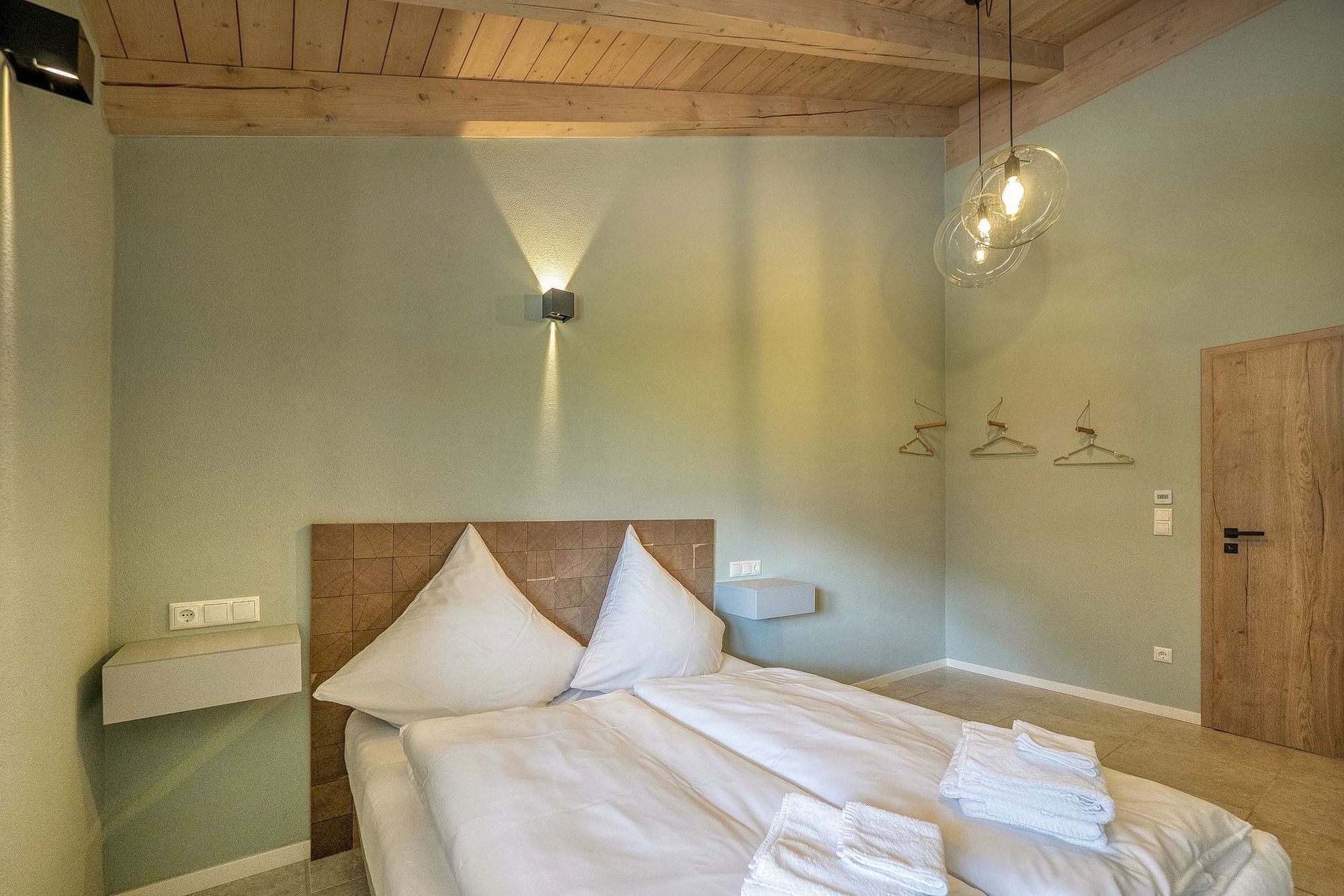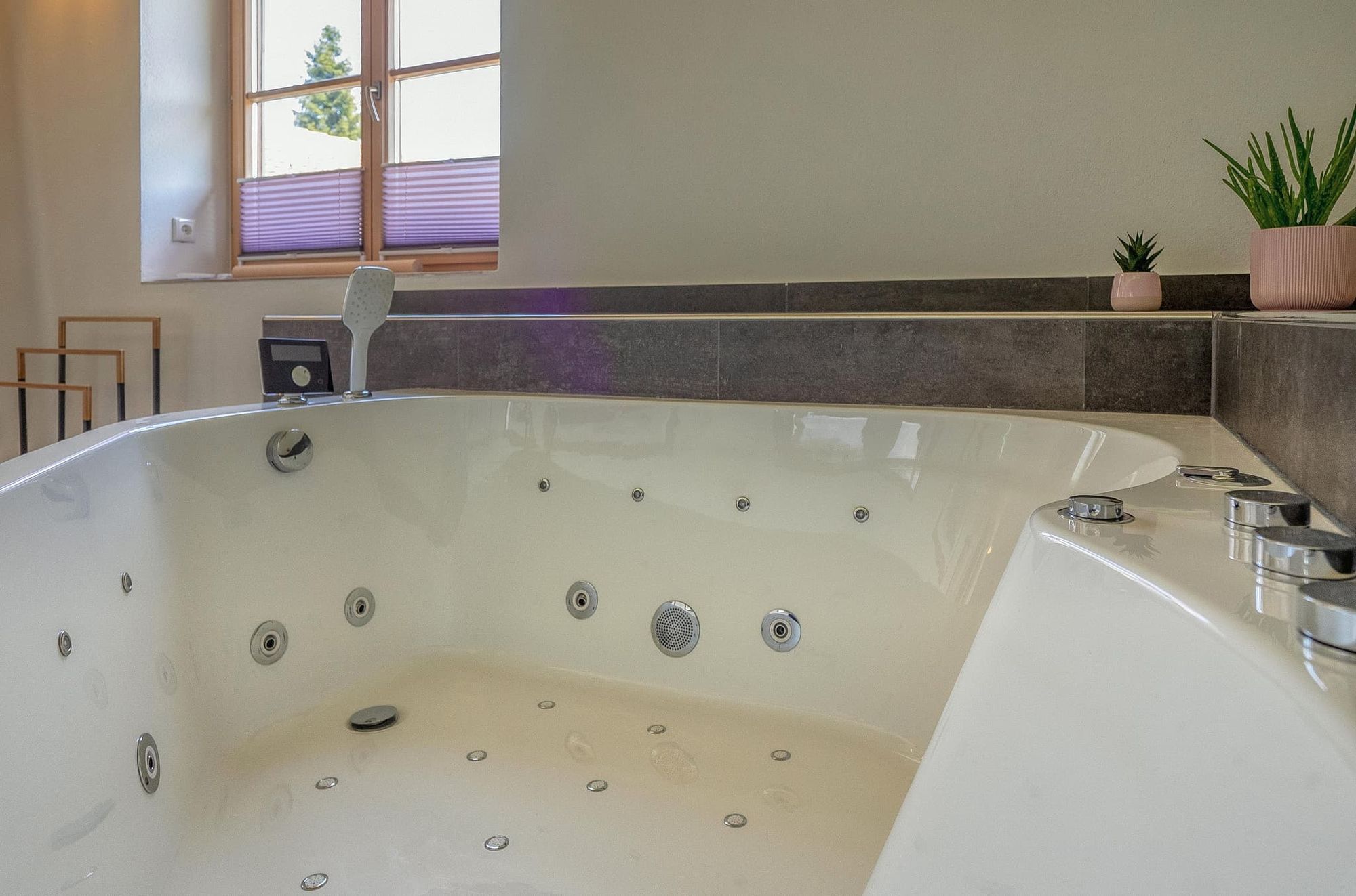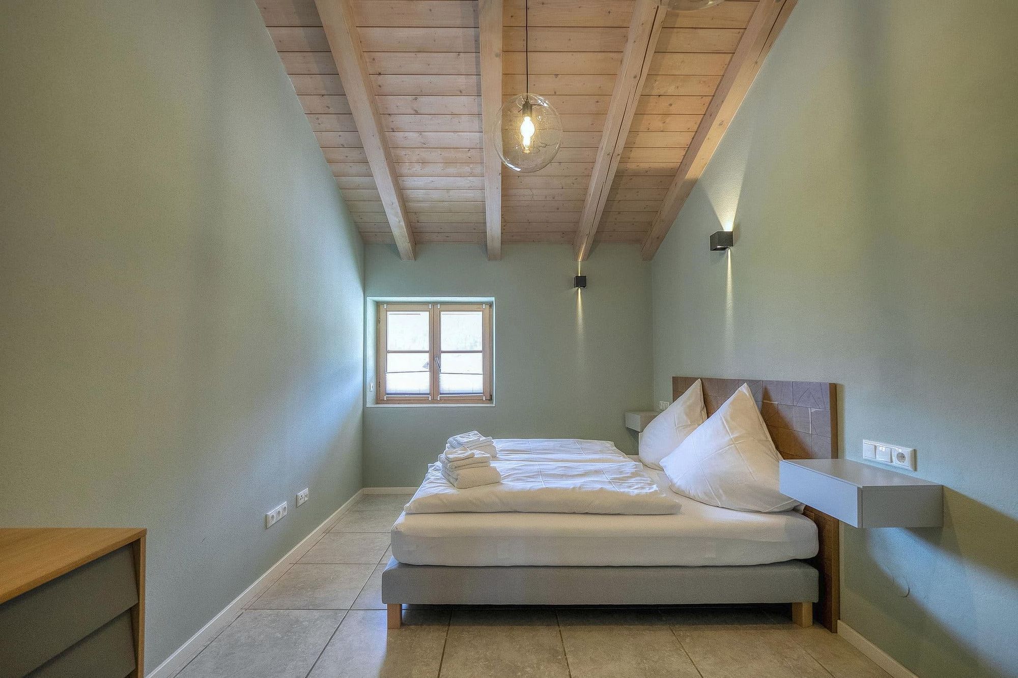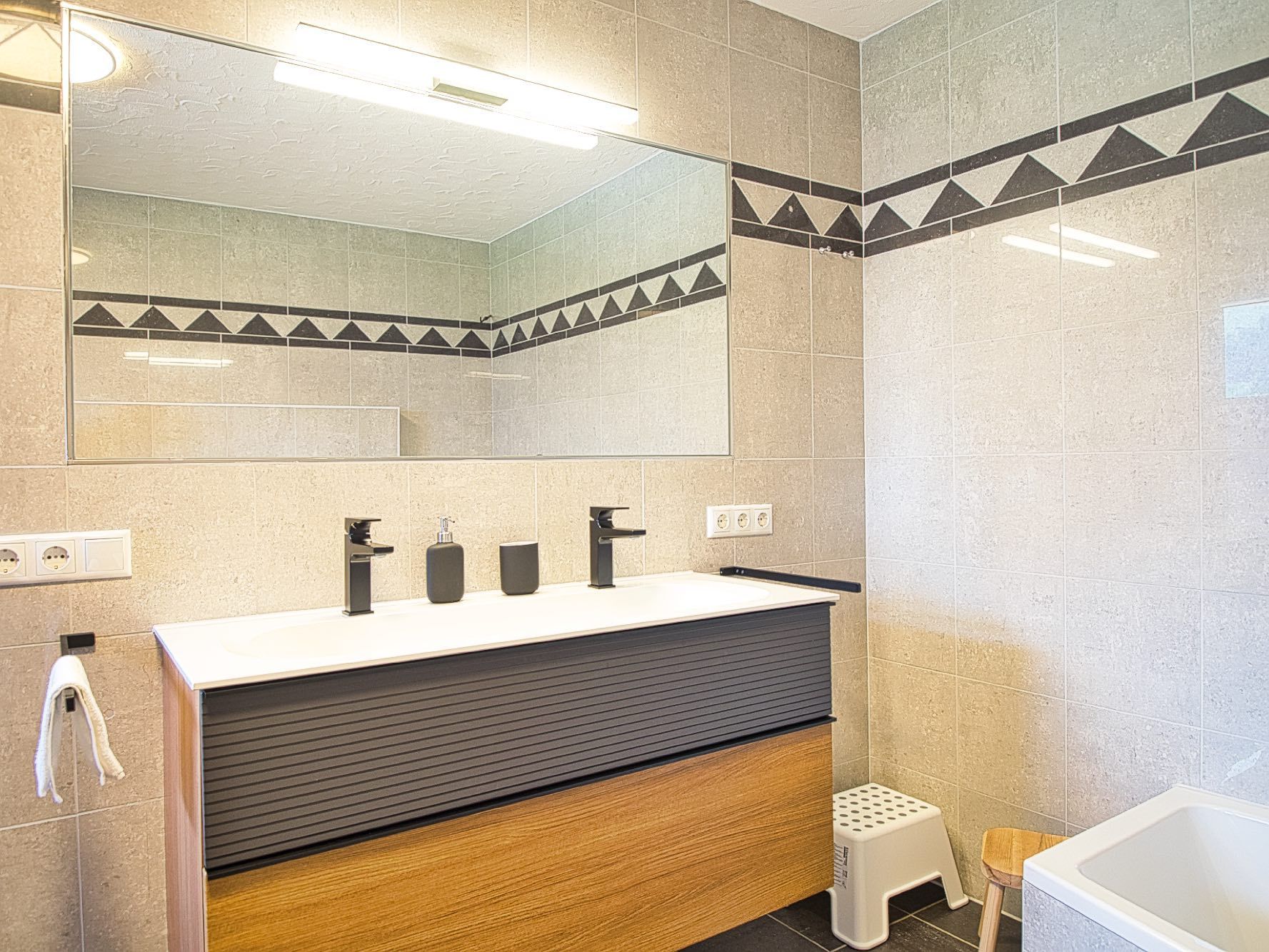 Die Wohnung verfügt über drei Schlafzimmer mit Doppelbett, ein Kinderzimmer mit Etagenbett, 2 Badezimmer und einen Wellnessbereich mit Sauna und Whirlpool. Der Whirlpool verfügt über etliche Düsen und Lichtstimmungen, gleich angrenzend befindet sich die Sauna für 4 Personen, von welcher Sie ebenfalls einen traumhaften Blick auf die Berglandschaft haben.