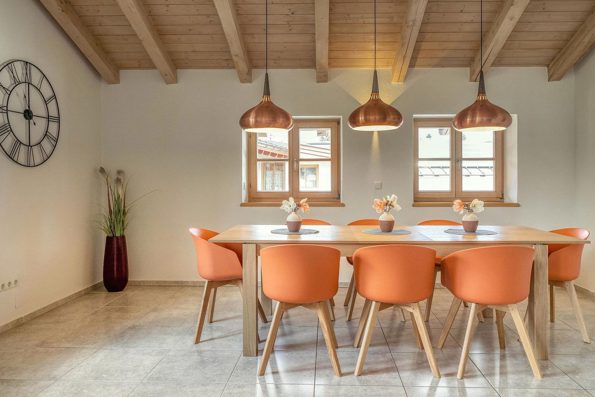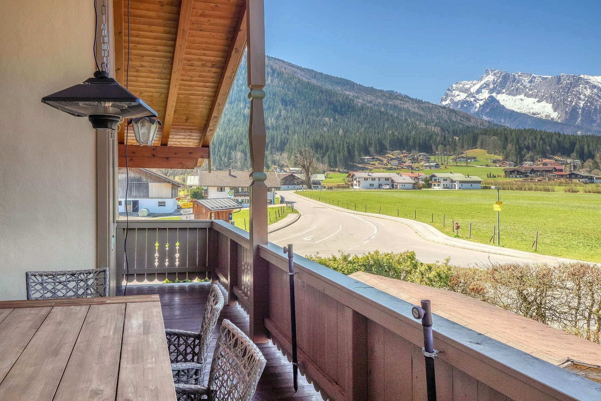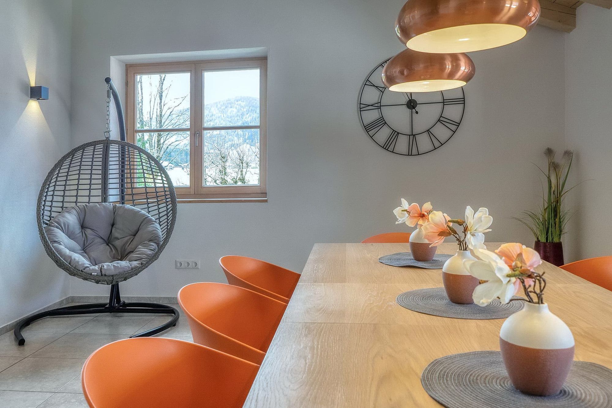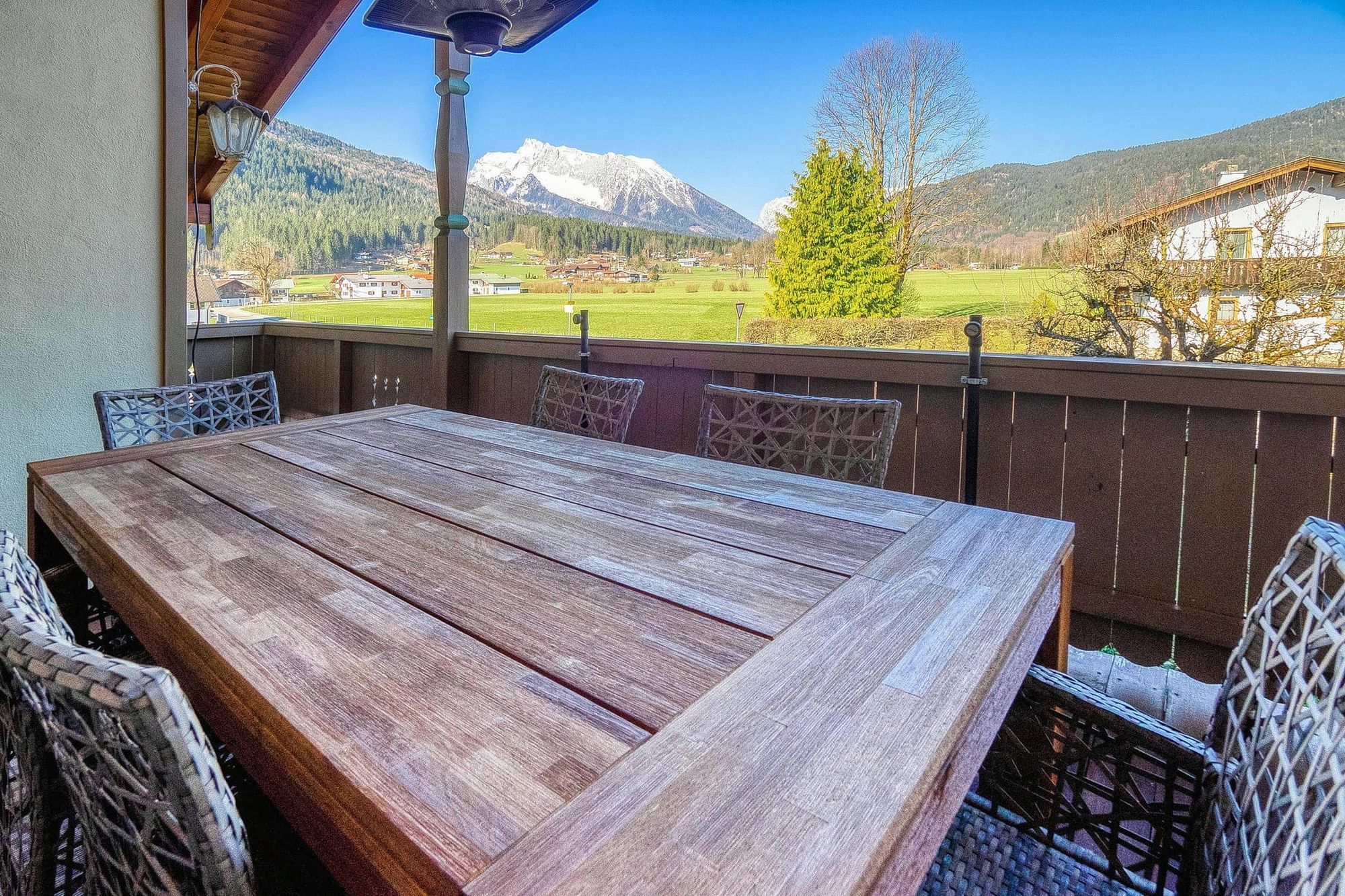 Ein Highlight nach einem schönen Tag ist die nach Westen ausgerichtete Terrasse mit großem Esstisch, um den Sonnenuntergang und die umliegenden Berglandschaft zu bewundern.