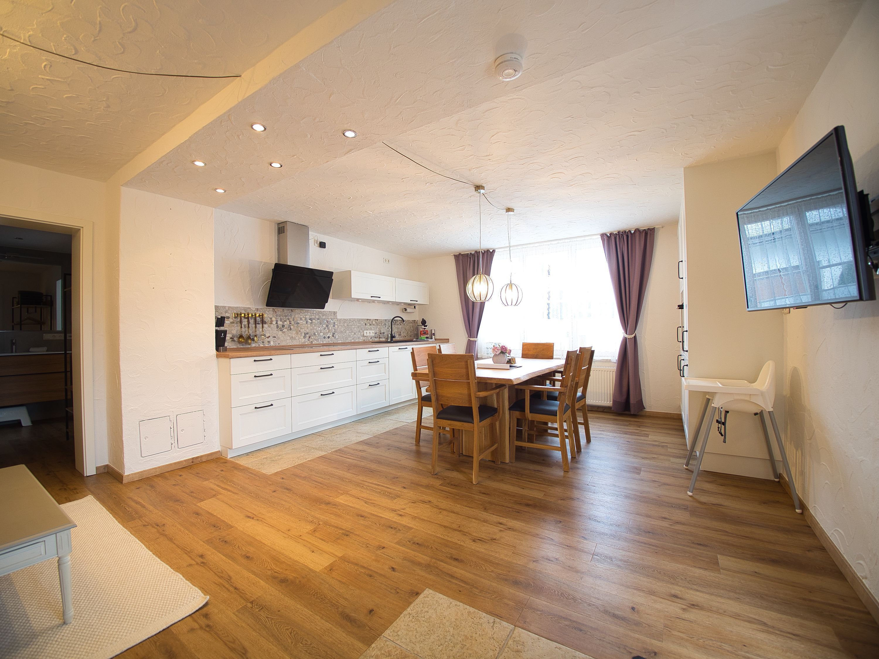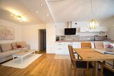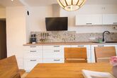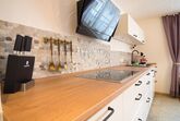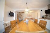 Im Erdgeschoss befindet sich der offene Wohn/ und Essbereich. Der Wohnbereich bietet ein gemütliches Sofa, Fernseher & Radio. Die Küche ist bis ins kleinste Detail ausgestattet. Der Essbereich bietet genügend Platz für 6 Personen. Ebenfalls im Erdgeschoss befindet sich ein Schlafzimmer mit eigenem Badezimmer und Toilette.