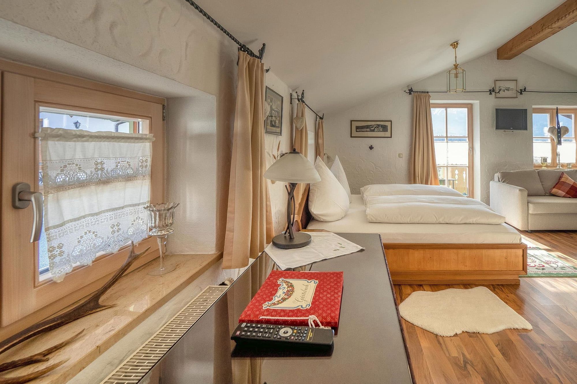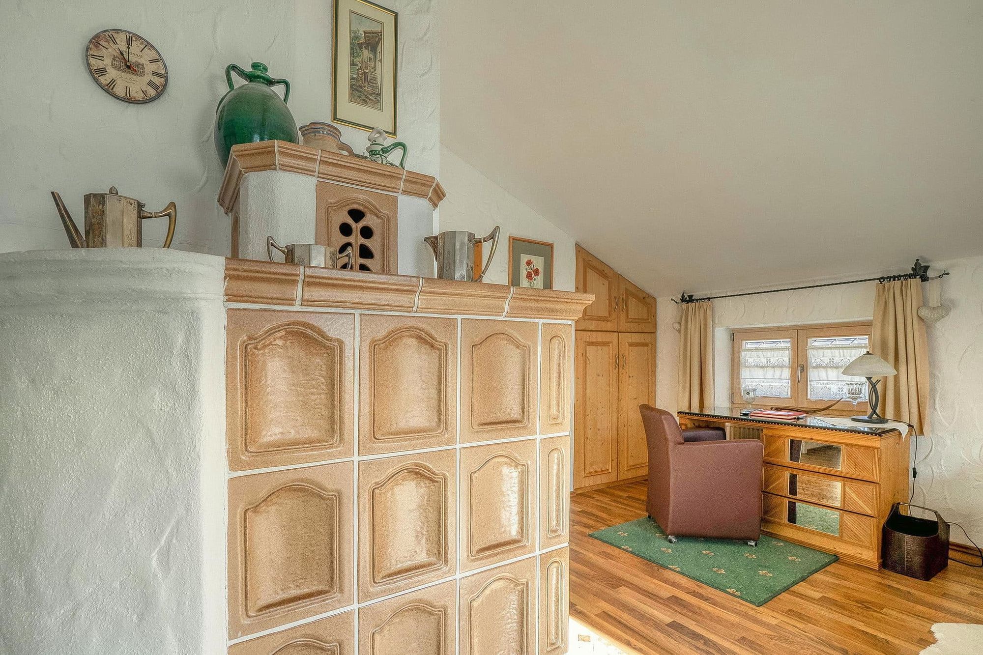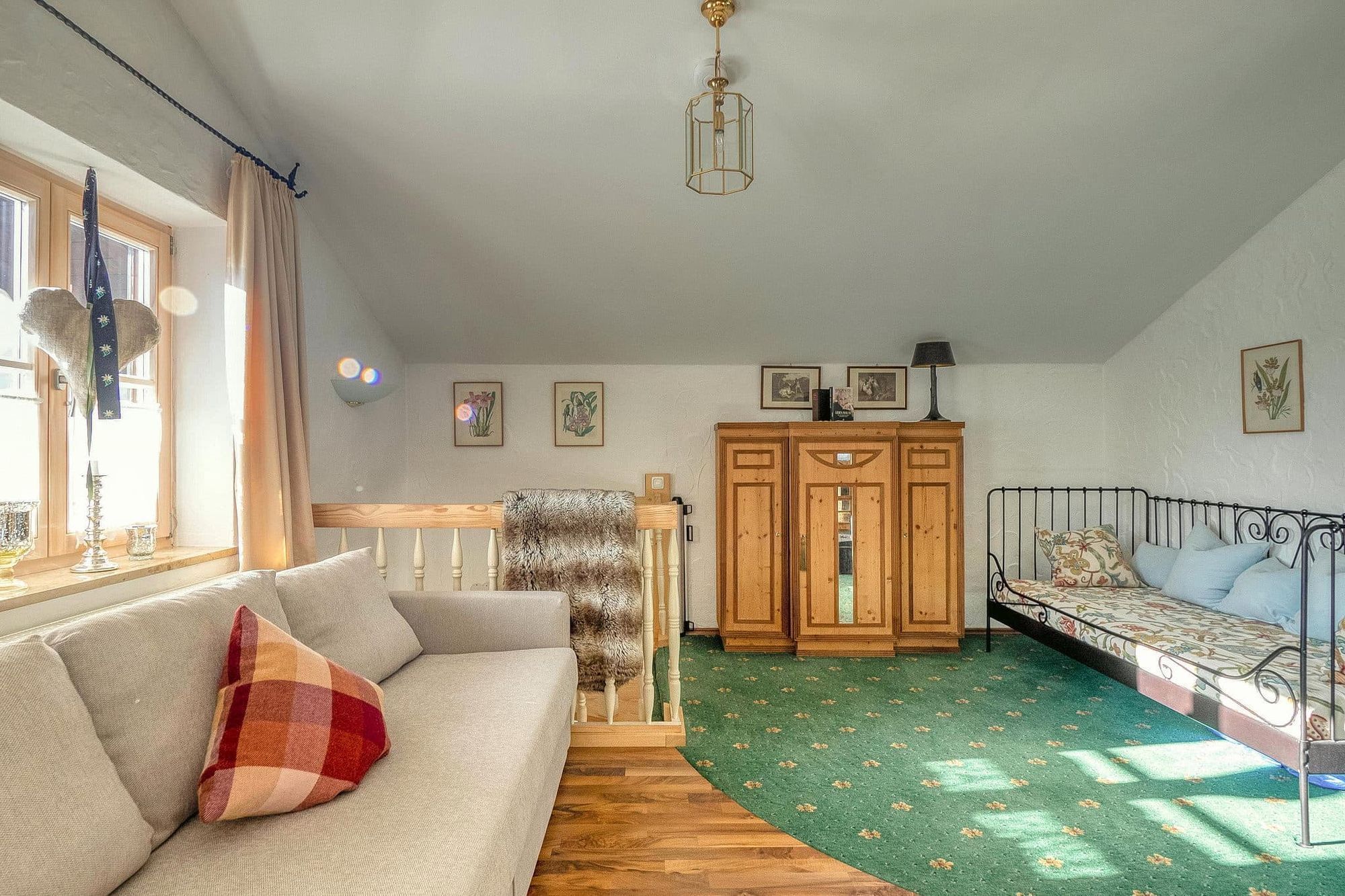 Vom Erdgeschoss gelangen Sie mit einer Echtholzwendeltreppe in das offen gestaltete Obergeschoss. Hier befindet sich das Schlafzimmer mit großzügigem Doppelbett, Einzelbett und ausziehbarem Schlafsofa und Fernseher, Schreibtisch und Echtholzeinbauschränke. Als Raumtrenner für das Gästebett sorgt ein Paravent. Zu den Highlights gehören der Balkon mit traumhaftem Bergblick, sowie der Kachelofen, der an kalten Tagen für eine gemütliche Atmosphäre sorgt.