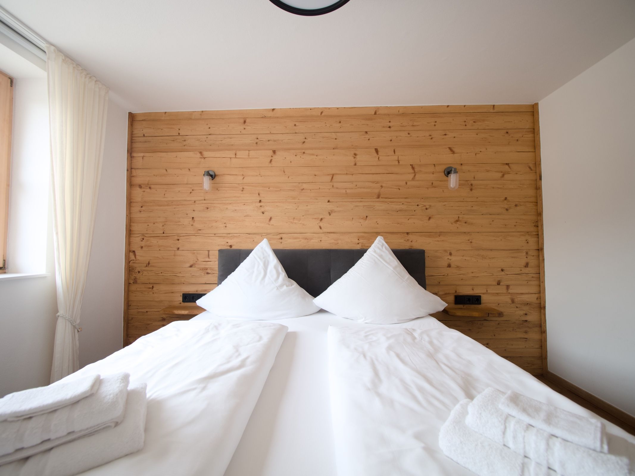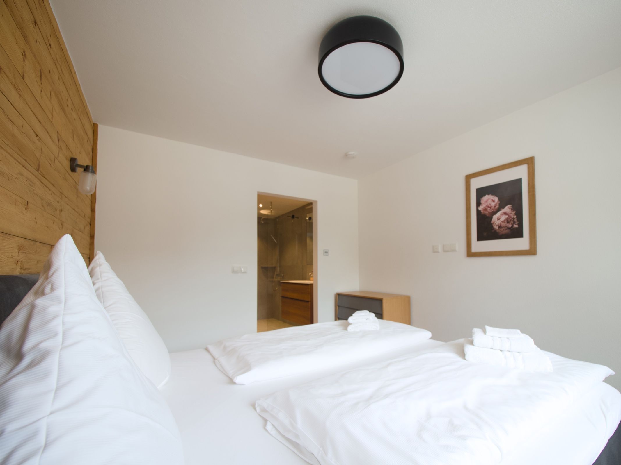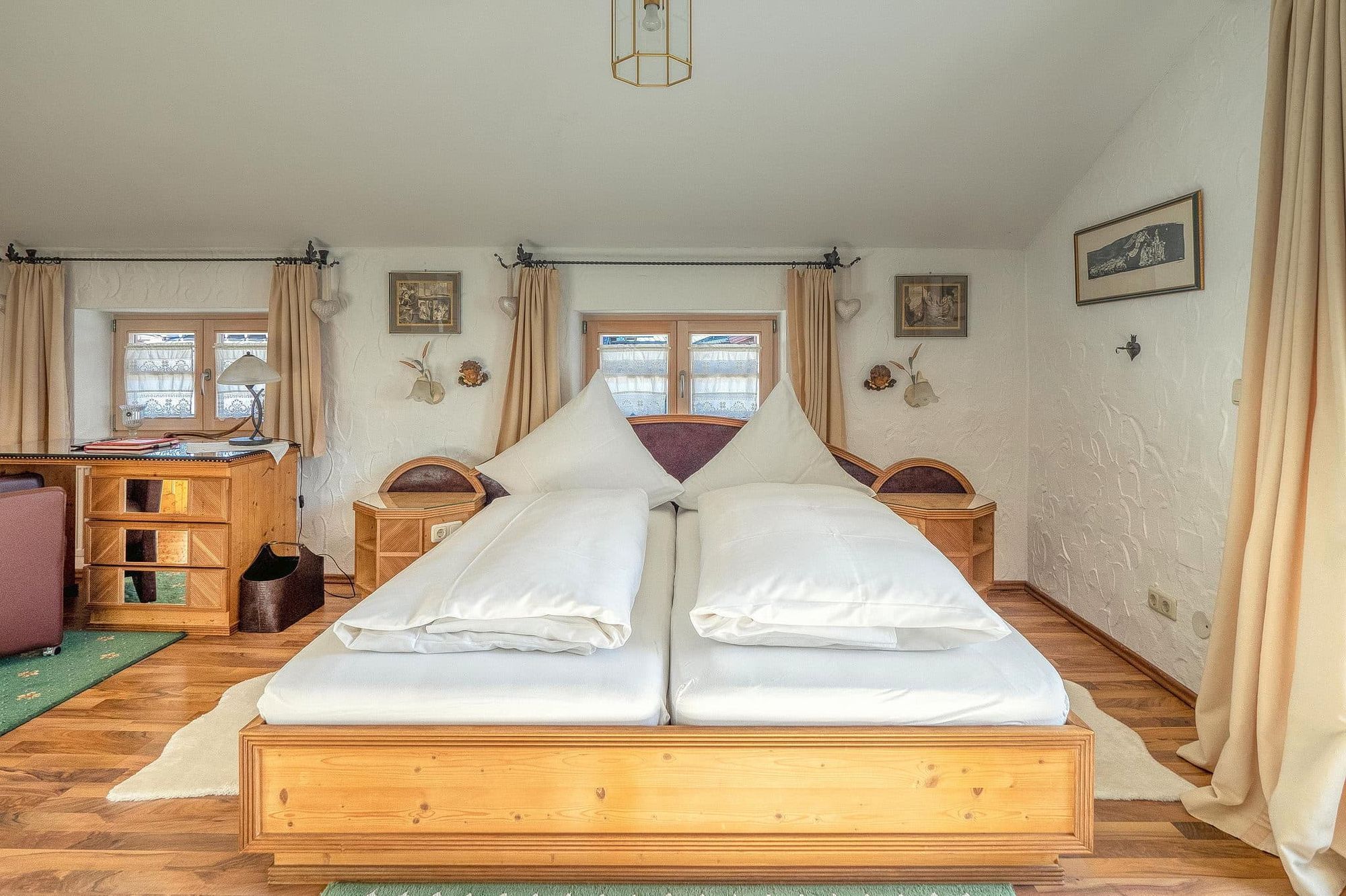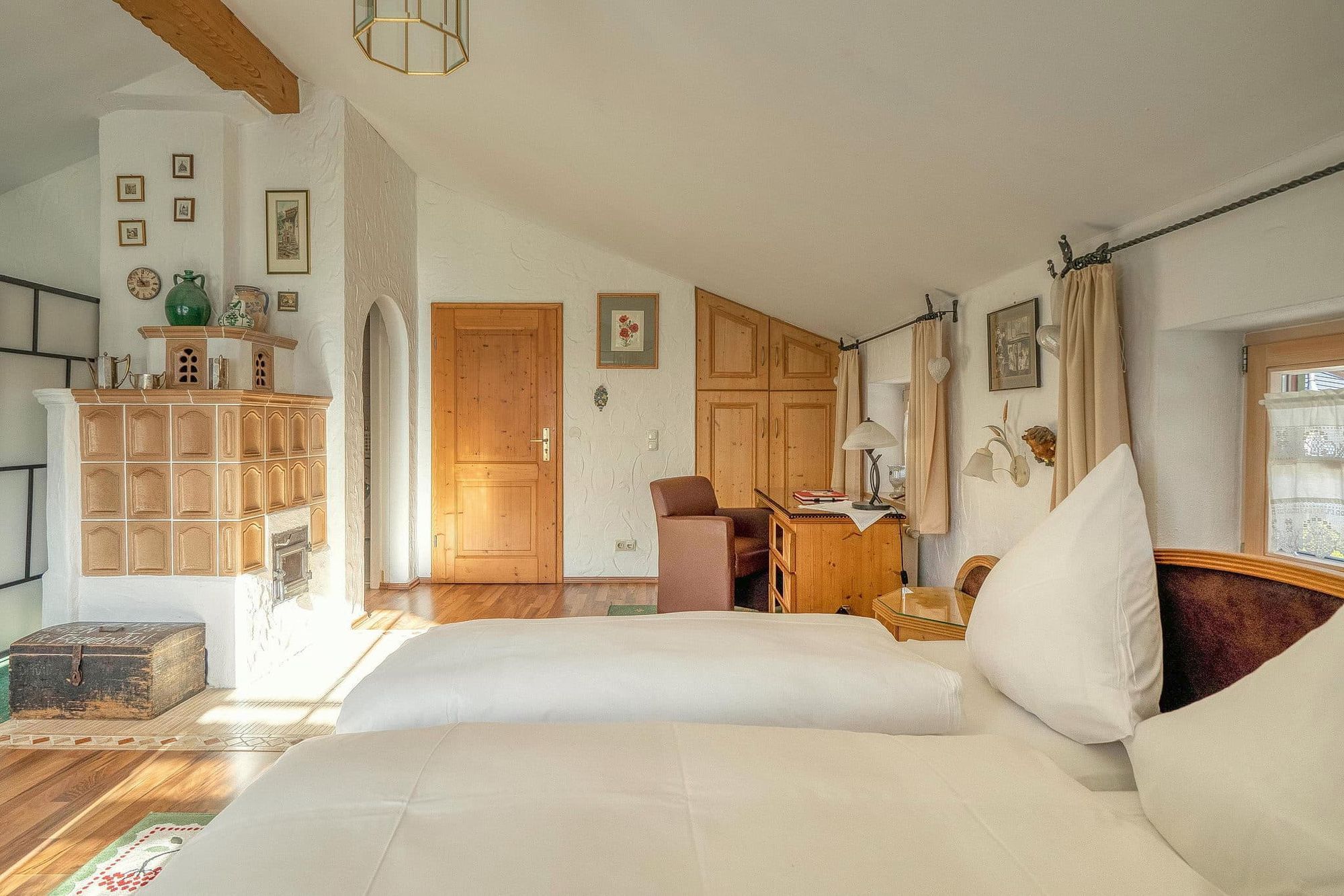 Vom Erdgeschoss gelangen Sie mit einer Echtholzwendeltreppe in das offen gestaltete Obergeschoss. Hier befindet sich das Schlafzimmer mit großzügigem Doppelbett, Einzelbett und ausziehbarem Schlafsofa und Fernseher, Schreibtisch und Echtholzeinbauschränke. Als Raumtrenner für das Gästebett sorgt ein Paravent. Zu den Highlights gehören der Balkon mit traumhaftem Bergblick, sowie der Kachelofen, der an kalten Tagen für eine gemütliche Atmosphäre sorgt.