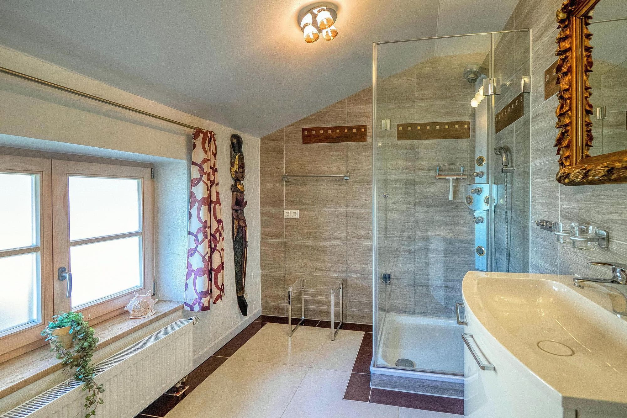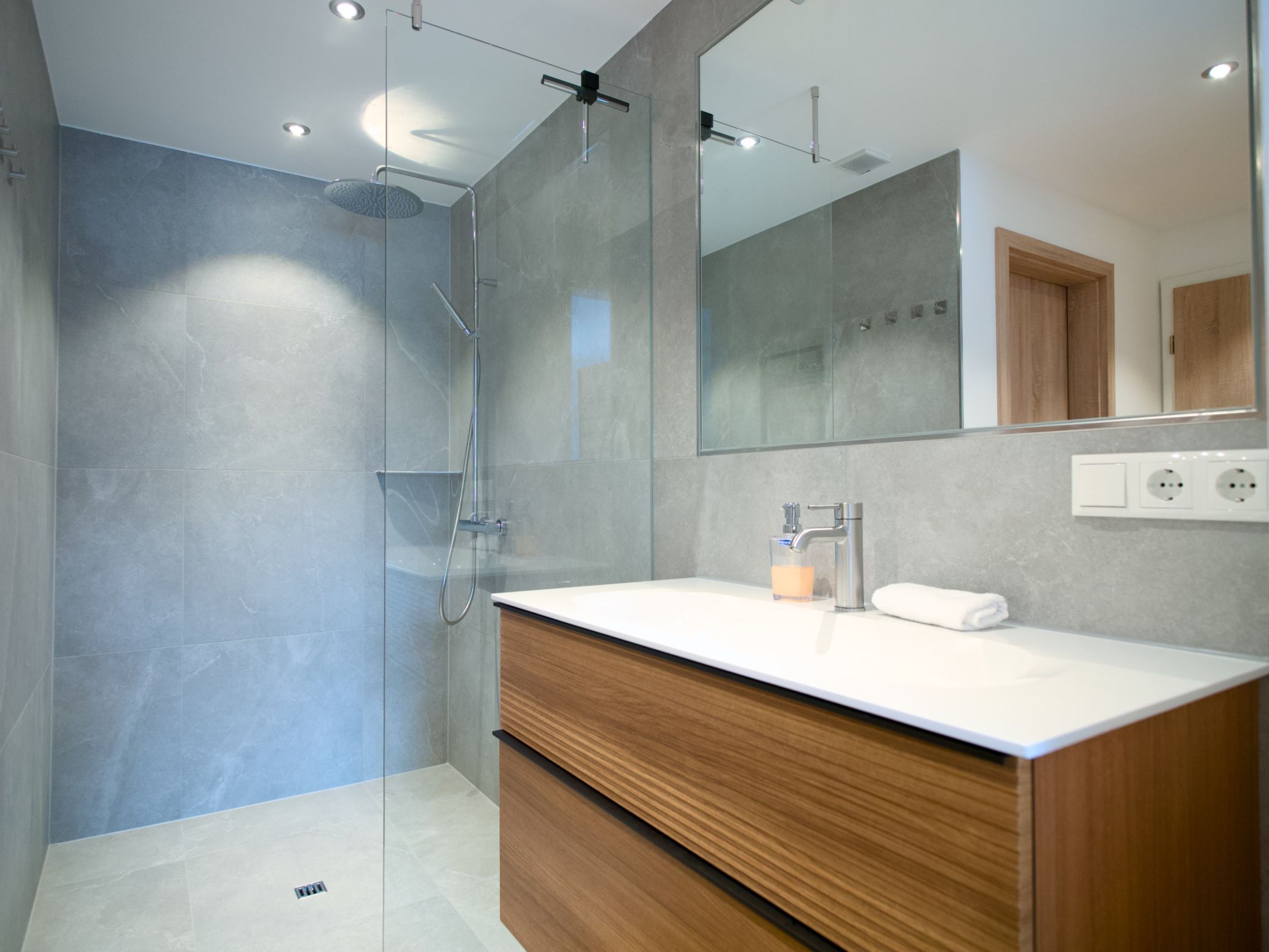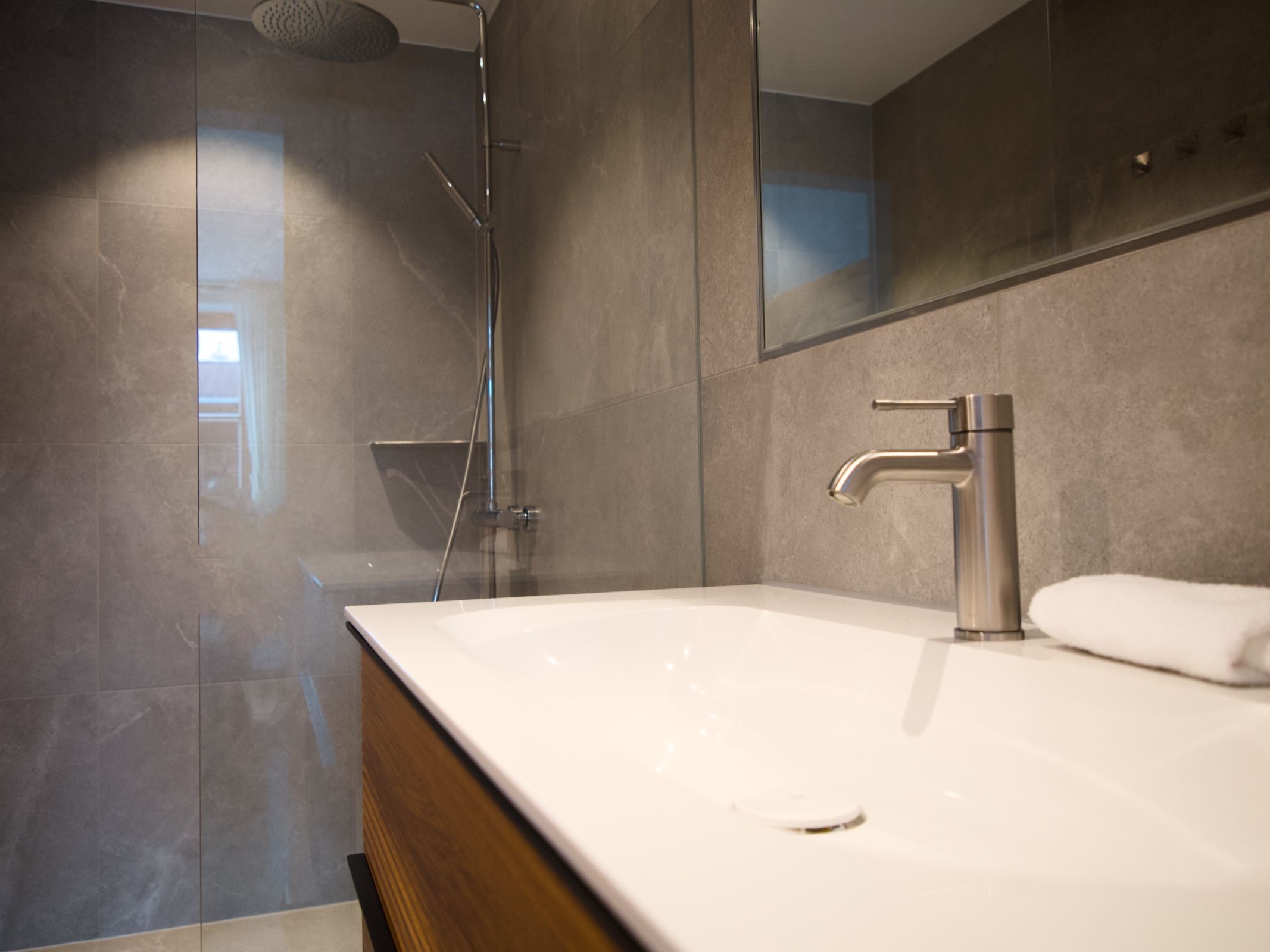 Das Tageslichtbad im Obergeschoss bietet eine Echtglasduschkabine mit Duschpanel und geräumigen Waschtisch mit ausreichender Staufläche. Die Toilette ist mit einem kleinem Waschtisch, Handtuchtrockner, und einer Waschmaschine ausgestattet.