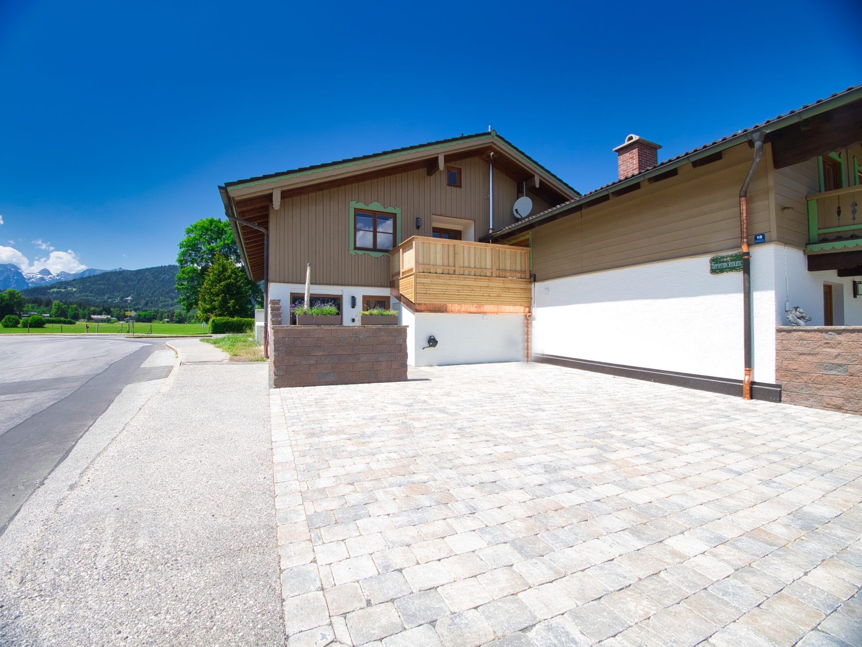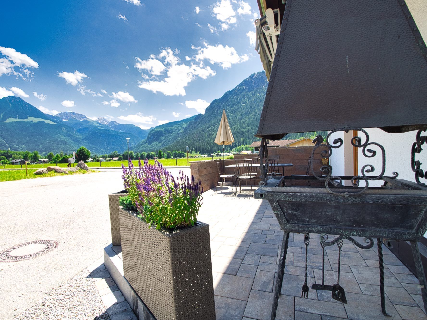 Der Außenbereich, welcher einen grandiosen Ausblick auf Kehlsteinhaus, Hoher Göll, Hohes Brett, Jenner mit Skiabfahrt bietet, steht voll und ganz zu Ihrer Verfügung. Dieser bietet sich zum Grillen an unserem Holzkohlegrill, oder einfach nur zum verweilen an.