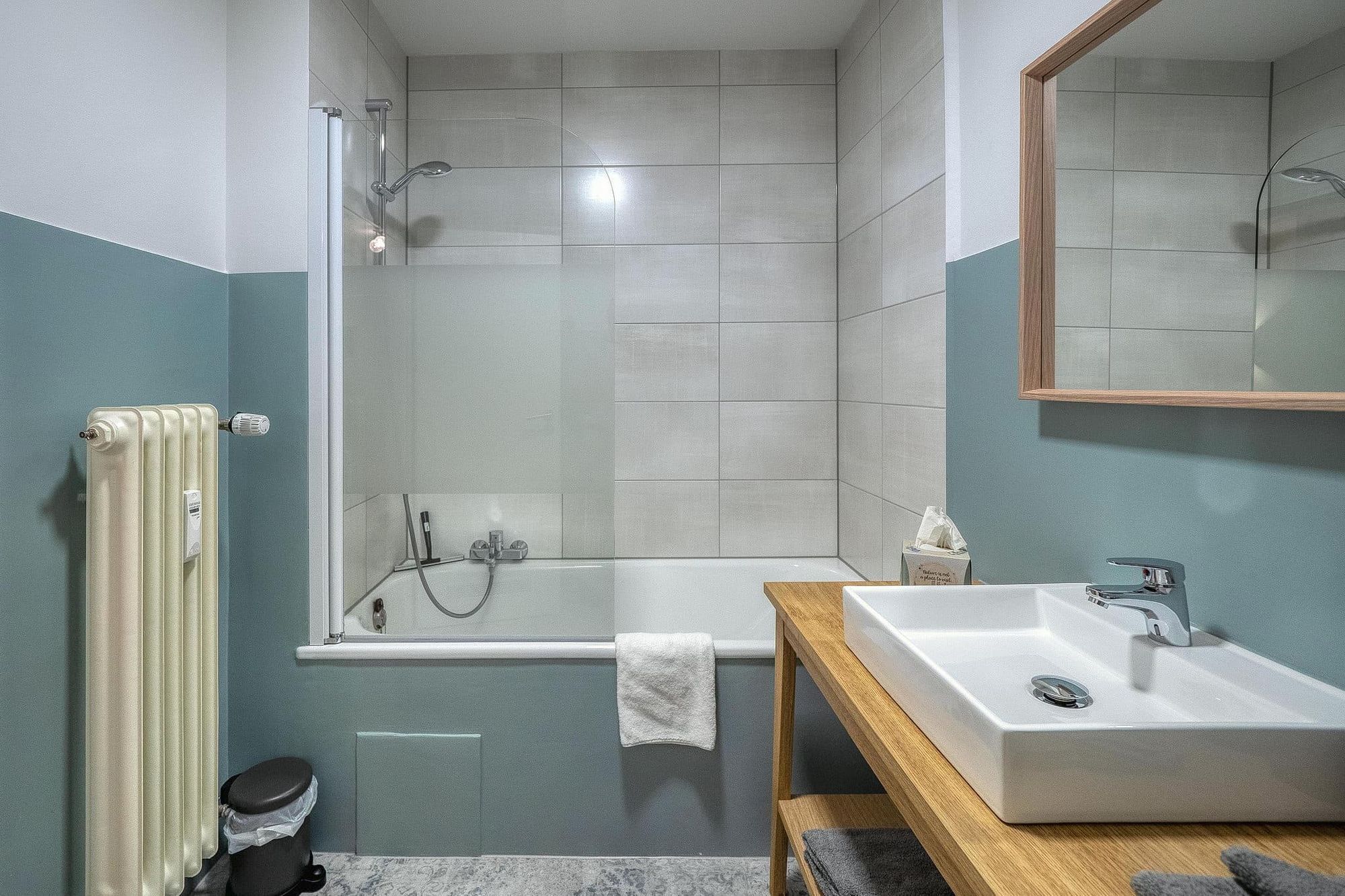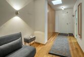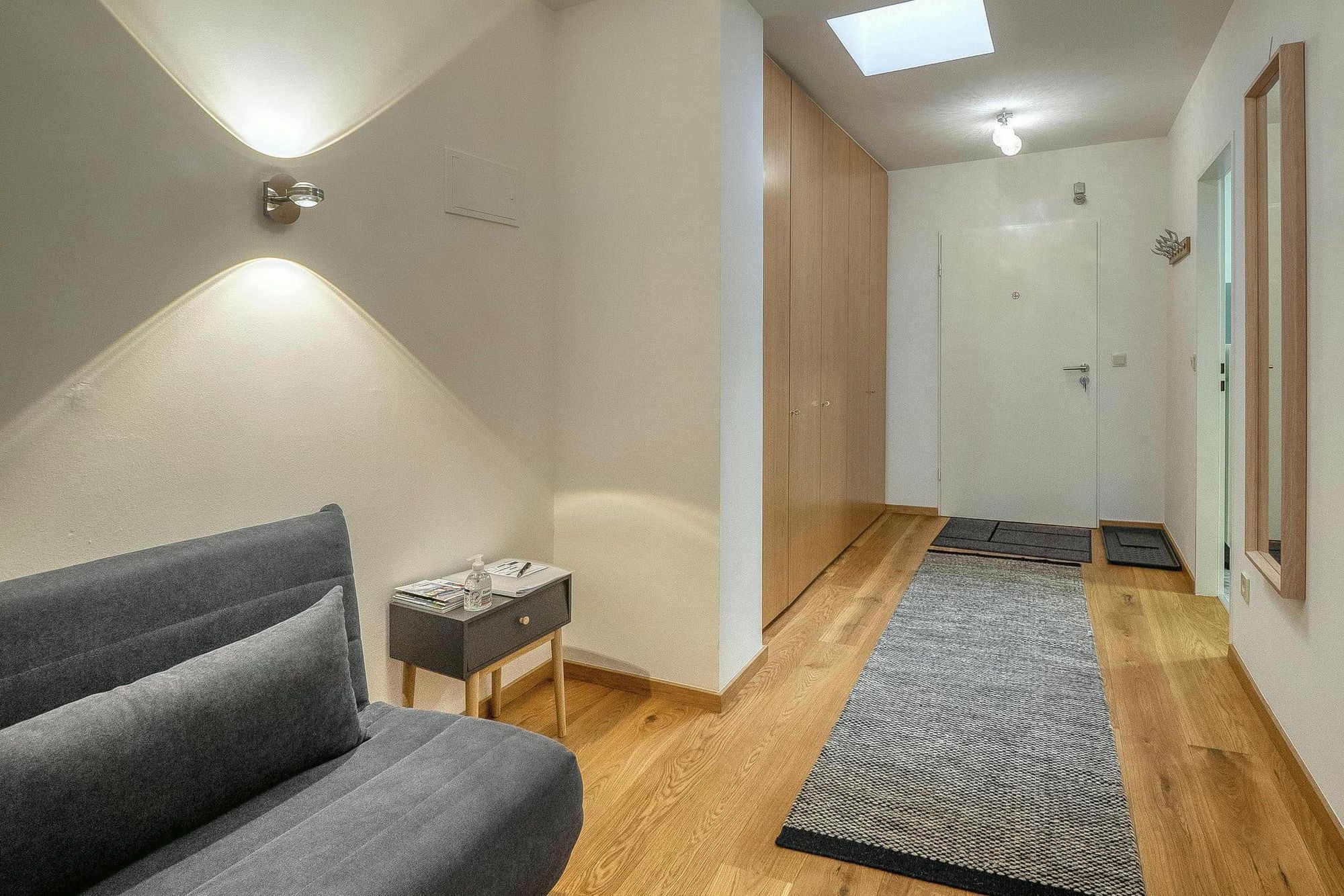 Das Badezimmer verfügt über eine Badewanne mit Duschkopf und Föhn. Im Eingangsbereich befindet sich ein Kleiderschrank mit genügend Platz für Ihrer persönlichen Gegenstände. Der Fußboden ist mit einem Echtholz Landhausdielenparkett ausgelegt.