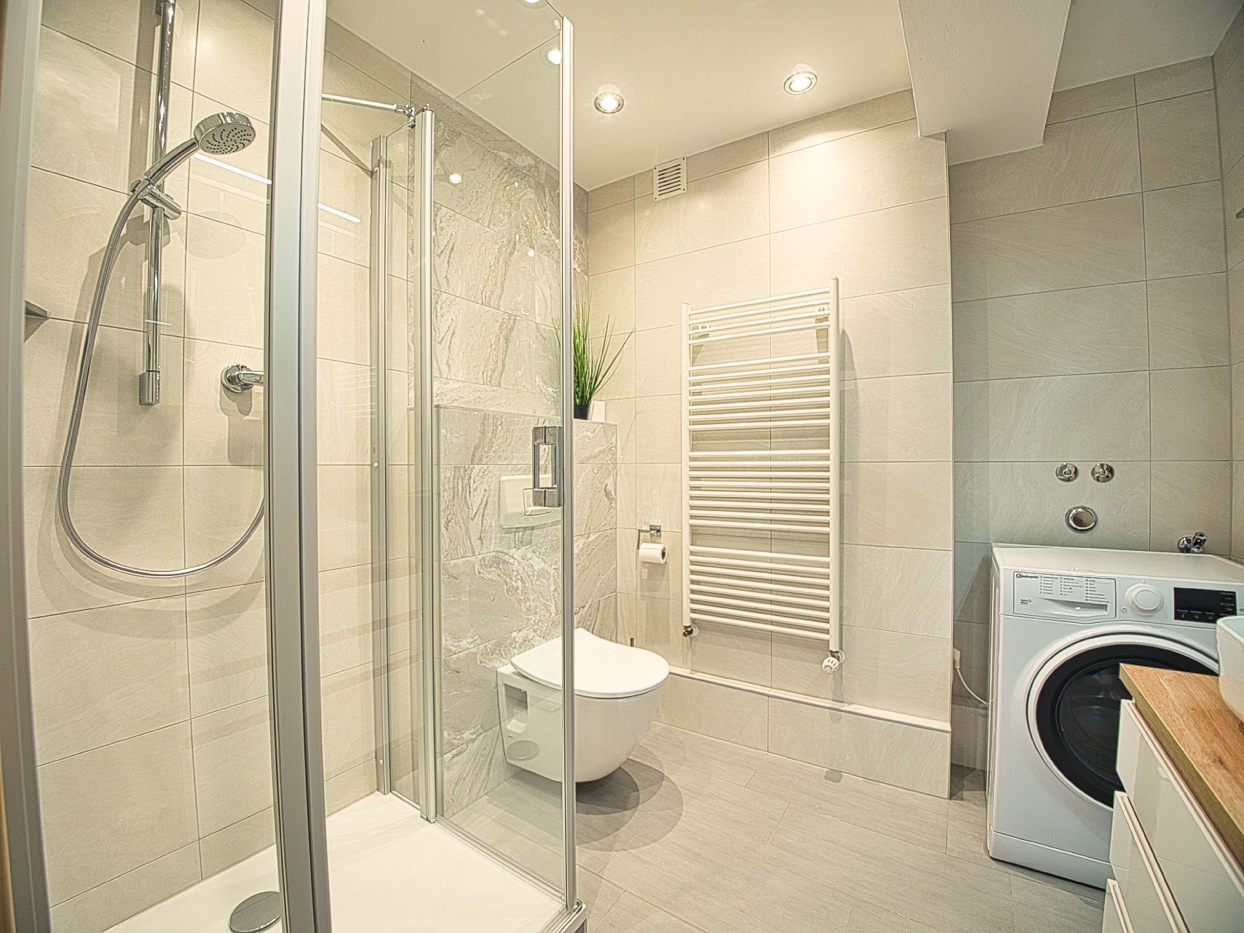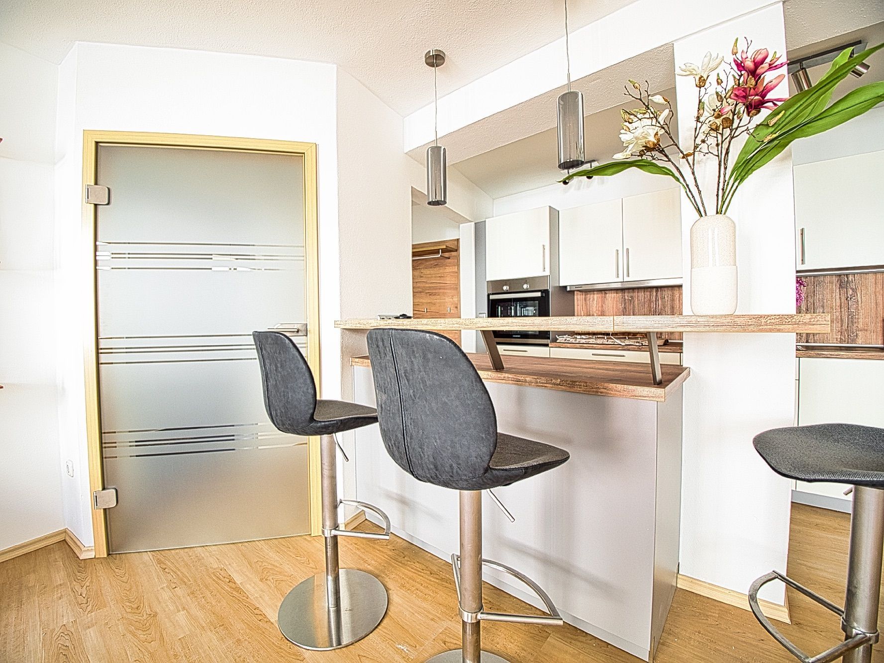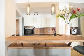 Die Wohnung unterteilt sich auf Ihren 55 m2 in Eingangsbereich mit angrenzender Küche und großer Bar, den gemütlichen Wohnbereich mit ausziehbarem Schlafsofa inkl. komfortabler Matratze, ein Schlafzimmer mit großem, Doppelbett und einen Kleiderschrank und das Badezimmer mit großer Dusche, Waschmaschine und Trockner.