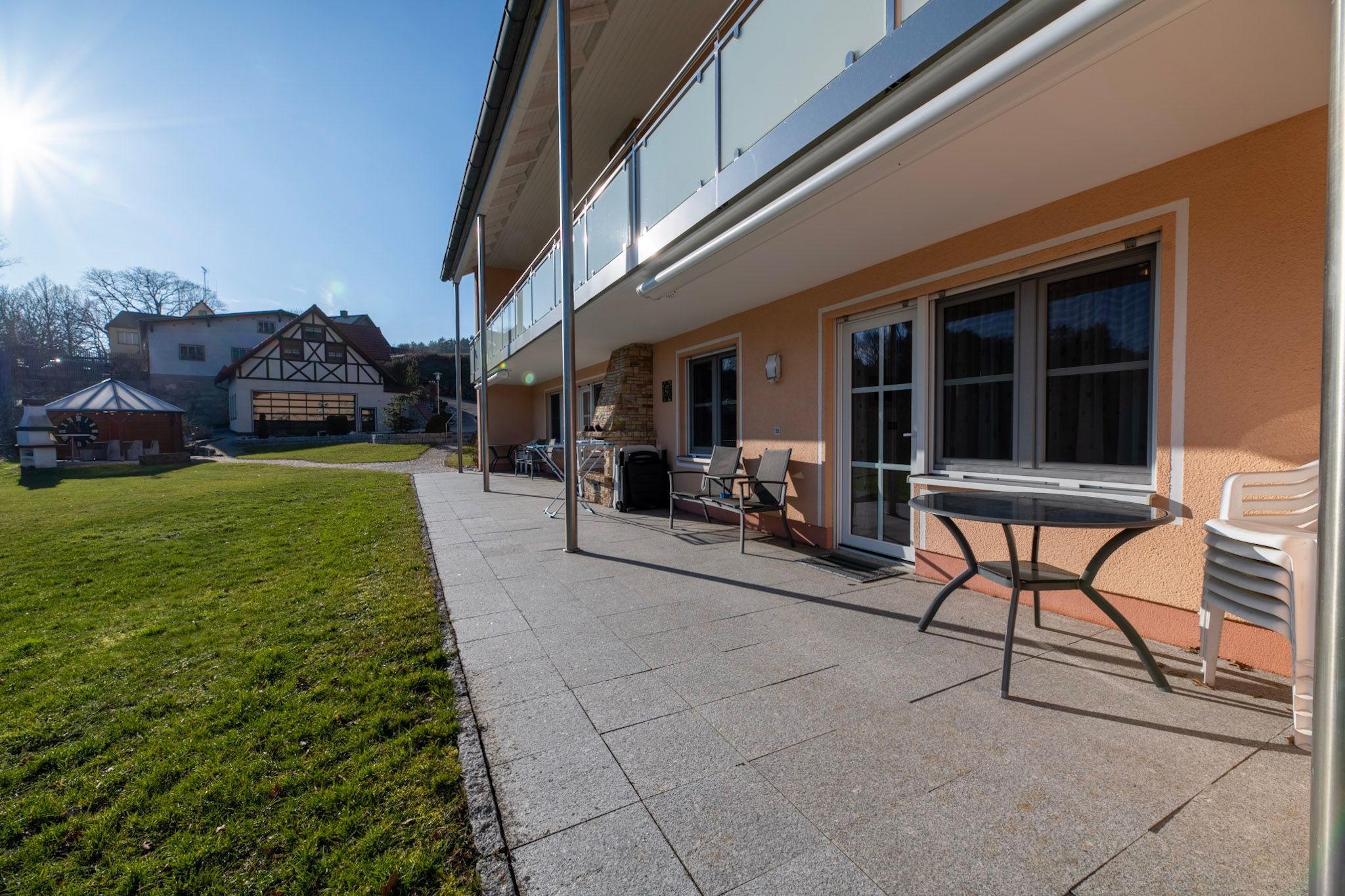 Großzügig eingerichtete Ferienwohnungen mit gehobener Ausstattung und angrenzender Sonnenterrasse mit Grillplatz laden zum Verweilen und Ausruhen ein.