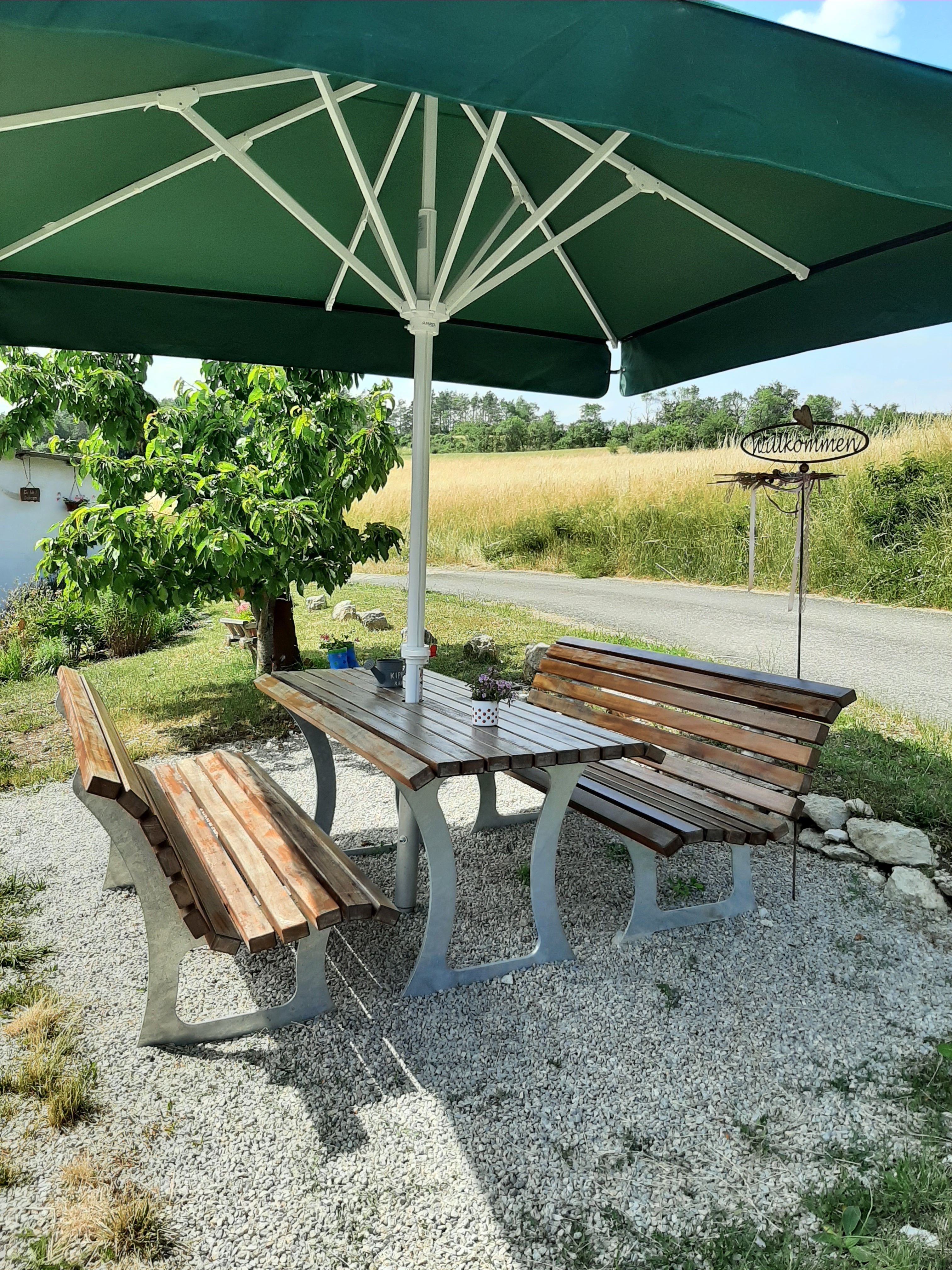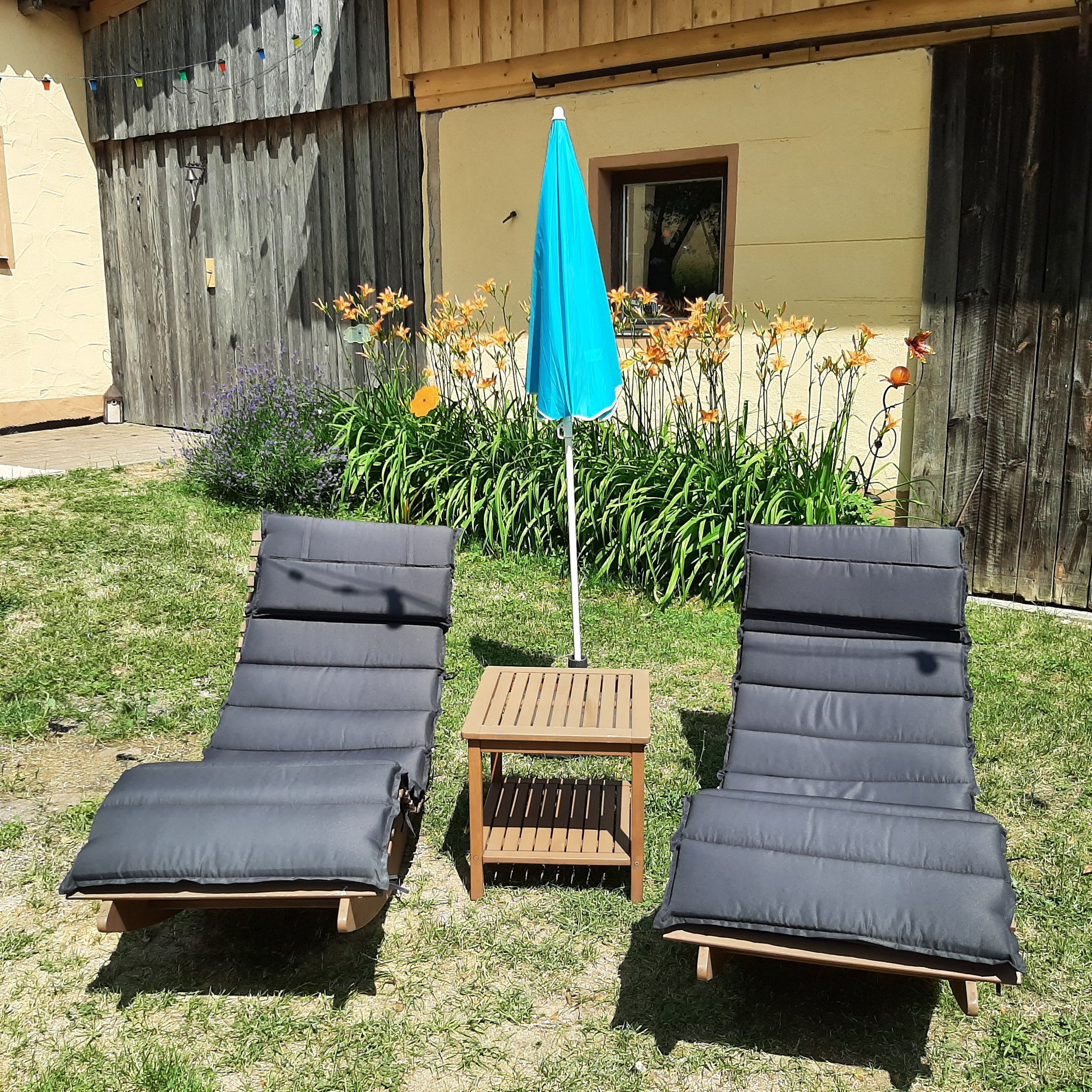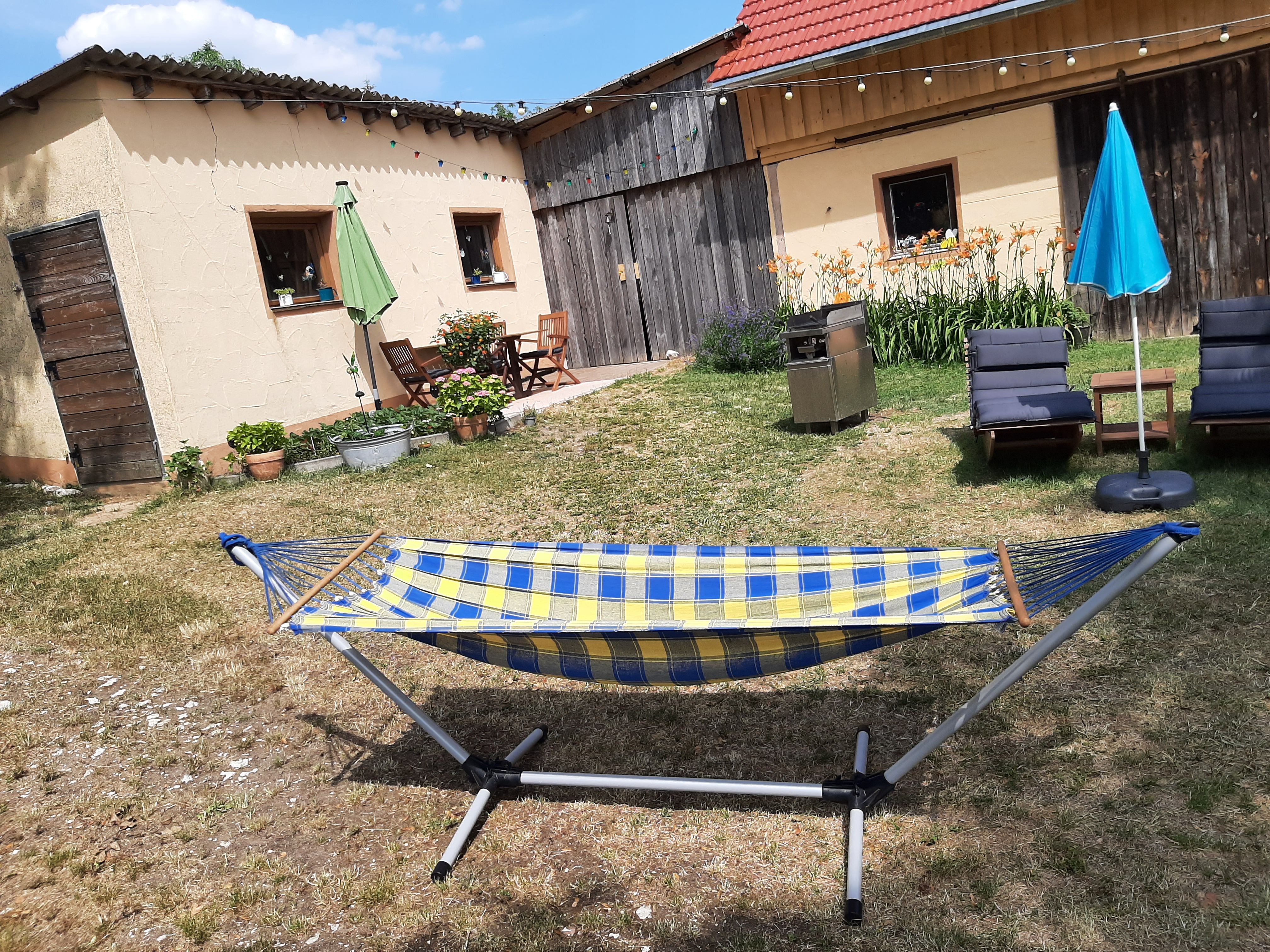 Die großzügige Außenanlage (Garten- und Hofbereich) mit verschiedenen Sitzgelegenheiten, einem überdachten Freisitz, sowie einer großen Spiel- und Liegewiese verwandeln das Anwesen in eine Wohlfühloase und steht allen Gästen des Ferienhauses zur Verfügung.