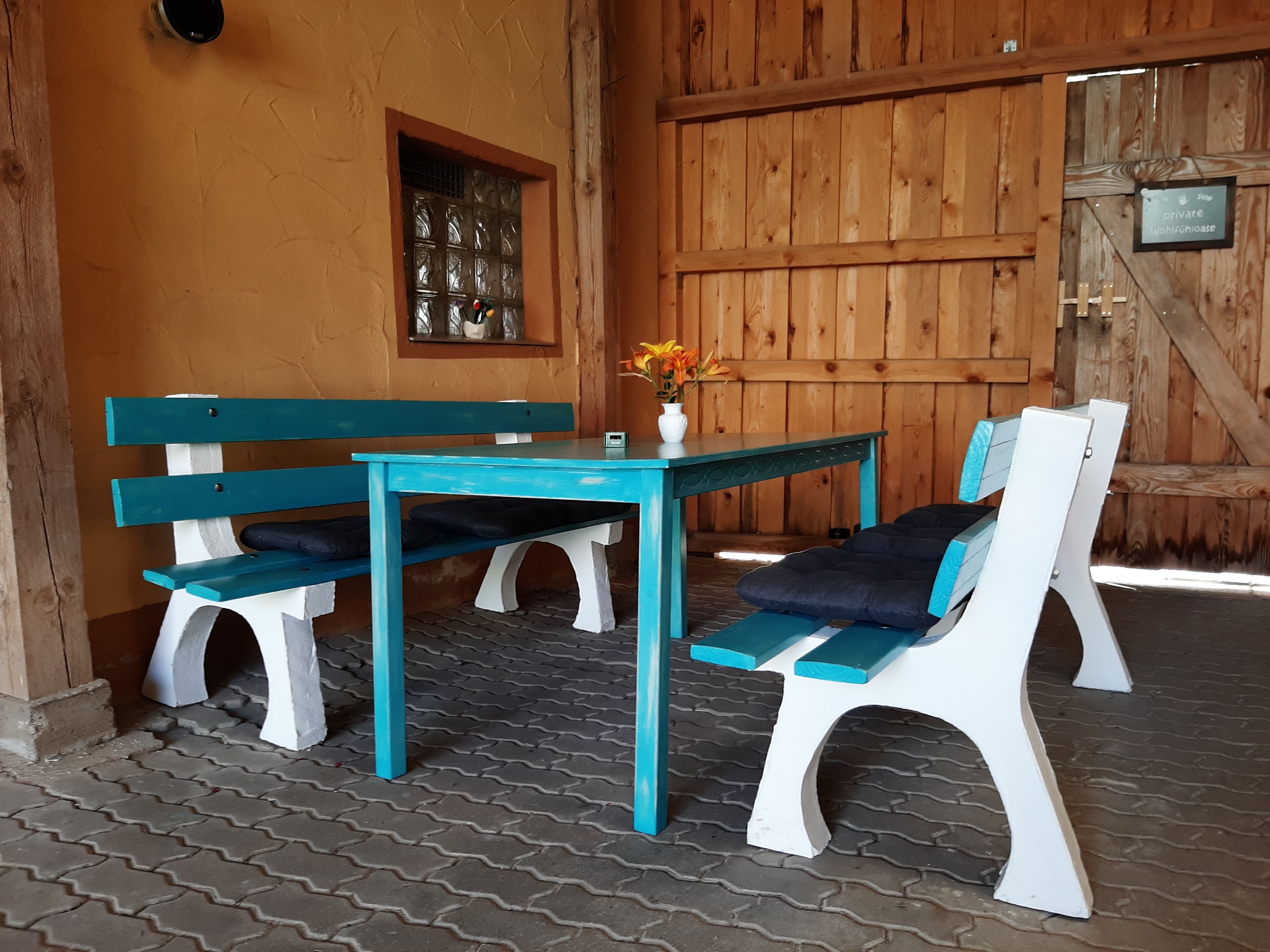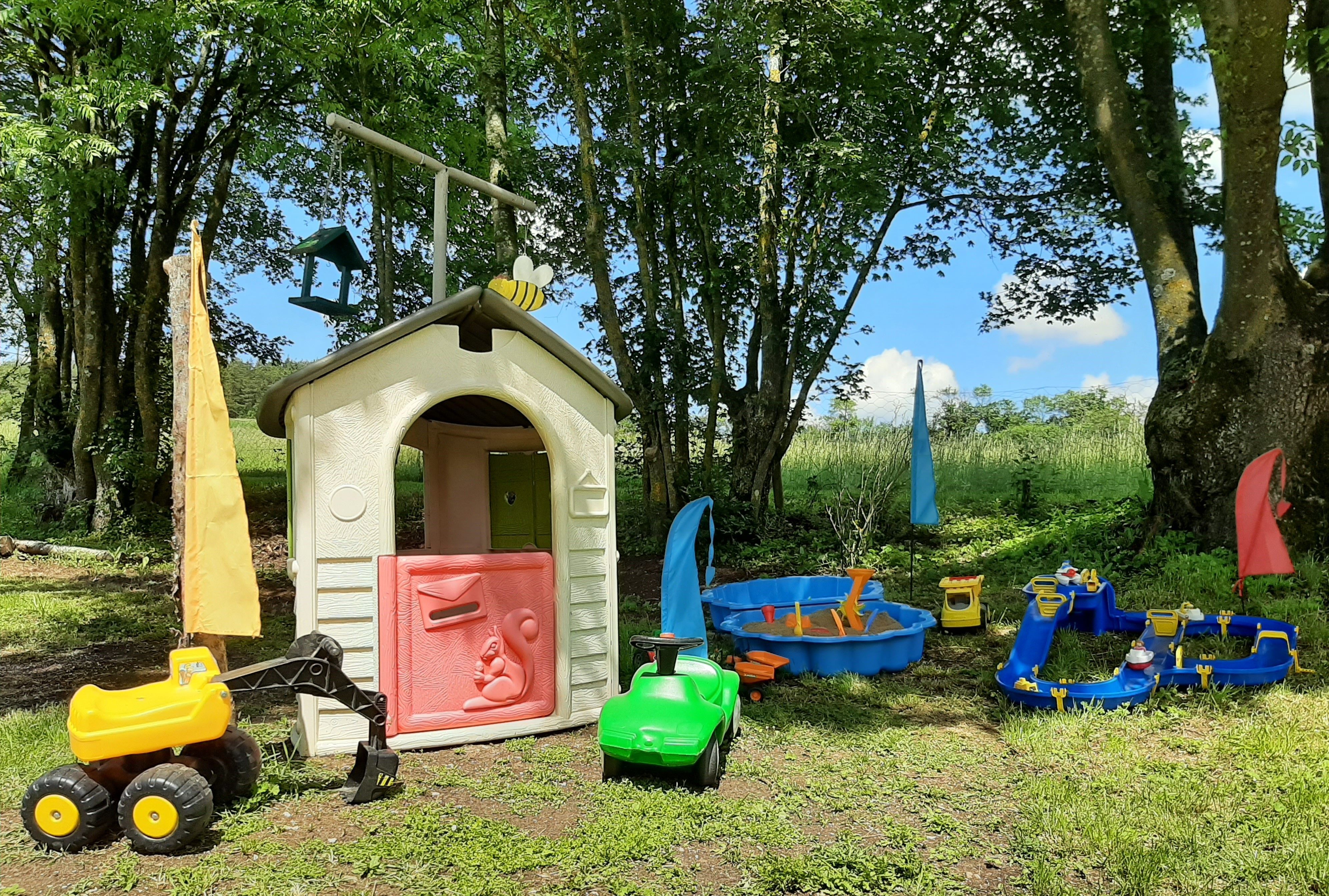 Die großzügige Außenanlage (Garten- und Hofbereich) mit verschiedenen Sitzgelegenheiten, einem überdachten Freisitz, sowie einer großen Spiel- und Liegewiese verwandeln das Anwesen in eine Wohlfühloase und steht allen Gästen des Ferienhauses zur Verfügung.