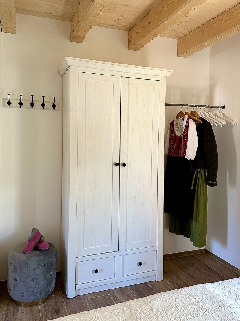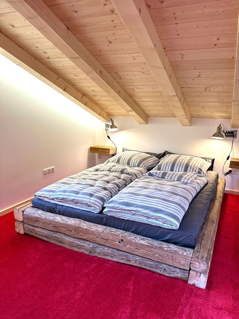 S' Große hat eine Belegungskapazität von 4 Personen (zuzügl. einem Babyreisebett bis 5 Personen). Ein Boxspringbett befindet sich im Schlafzimmer im Erdgeschoss, das weitere Doppelbett oben auf der Galerie. Nach Absprache ist die Mitnahme von bis zu 2 Hunden möglich.