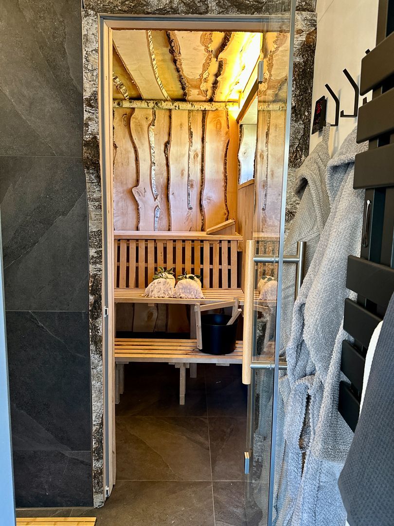 Birkensauna im Bad mit Outdoordusche