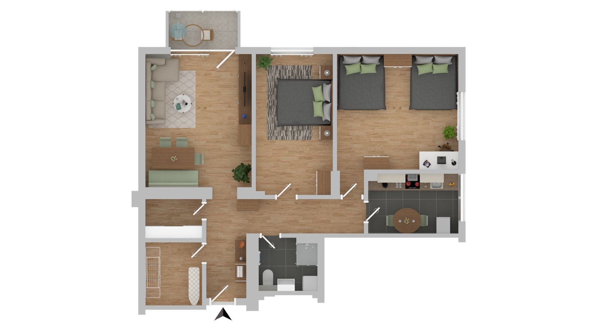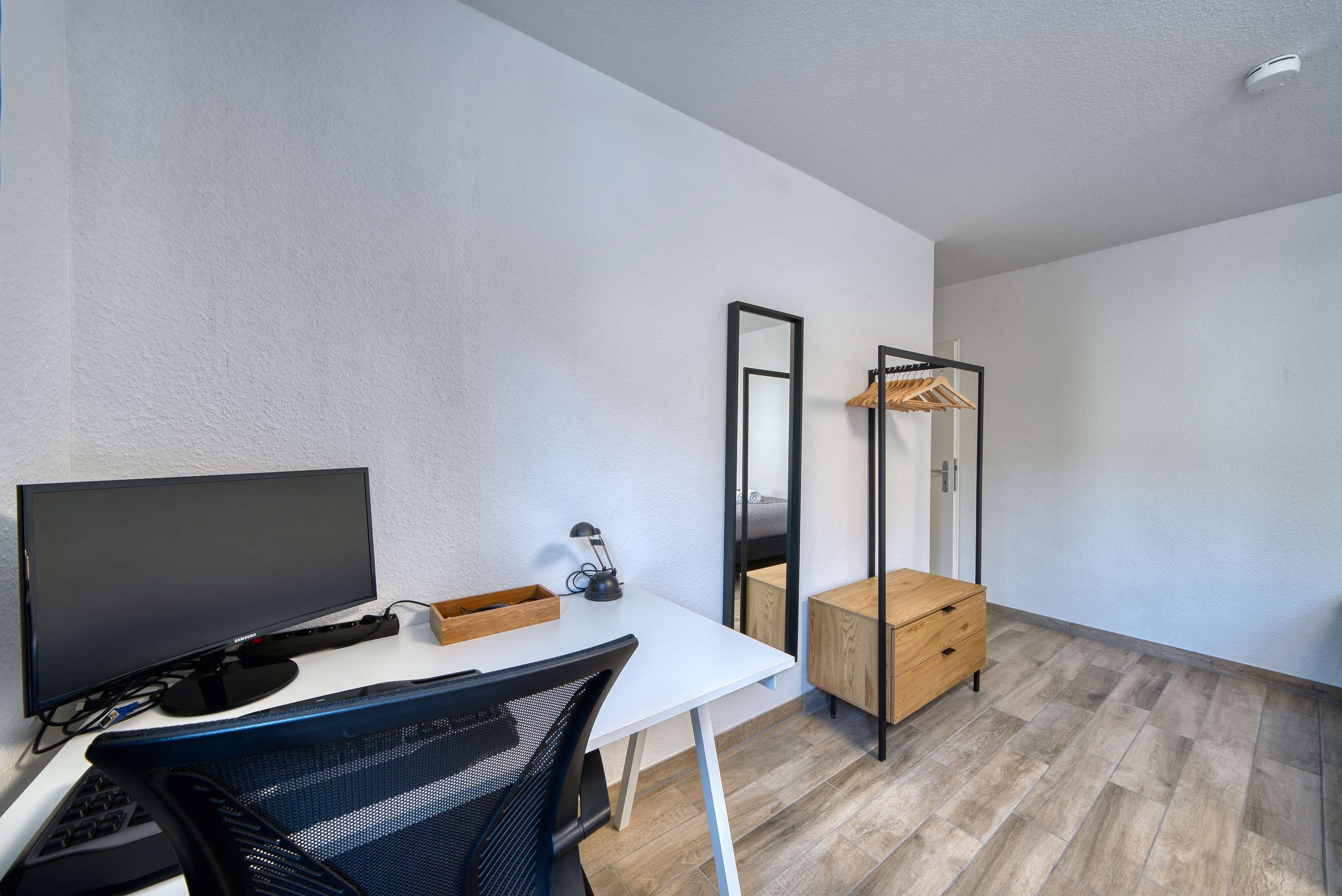 - 2 Schlafzimmer: 2x Queensize Doppelbetten, Spiegel, Kleiderschrank, Handy Ladekabel, Schreibtisch mit Stuhl, Bildschirm, Tastatur und Maus
