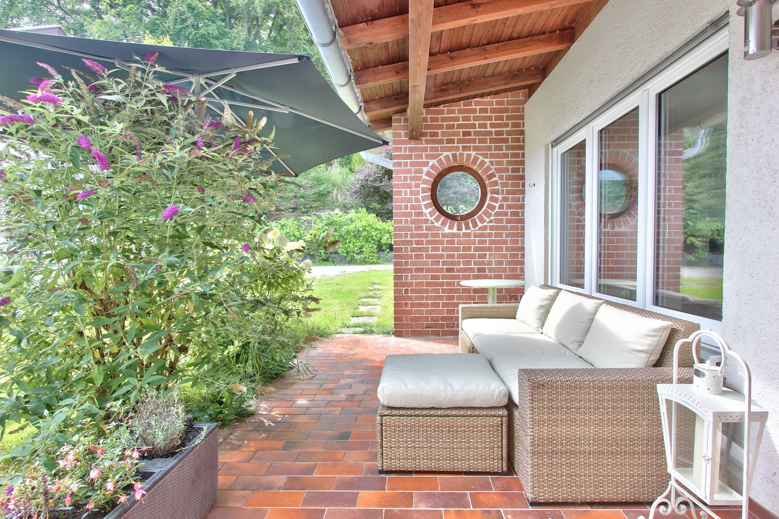 Es hat eine nach Süden ausgerichtete möblierte Terrasse mit Garten.