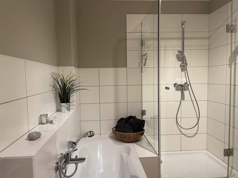 Bad mit Badewanne/Dusche, 2 Waschschüsseln