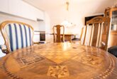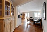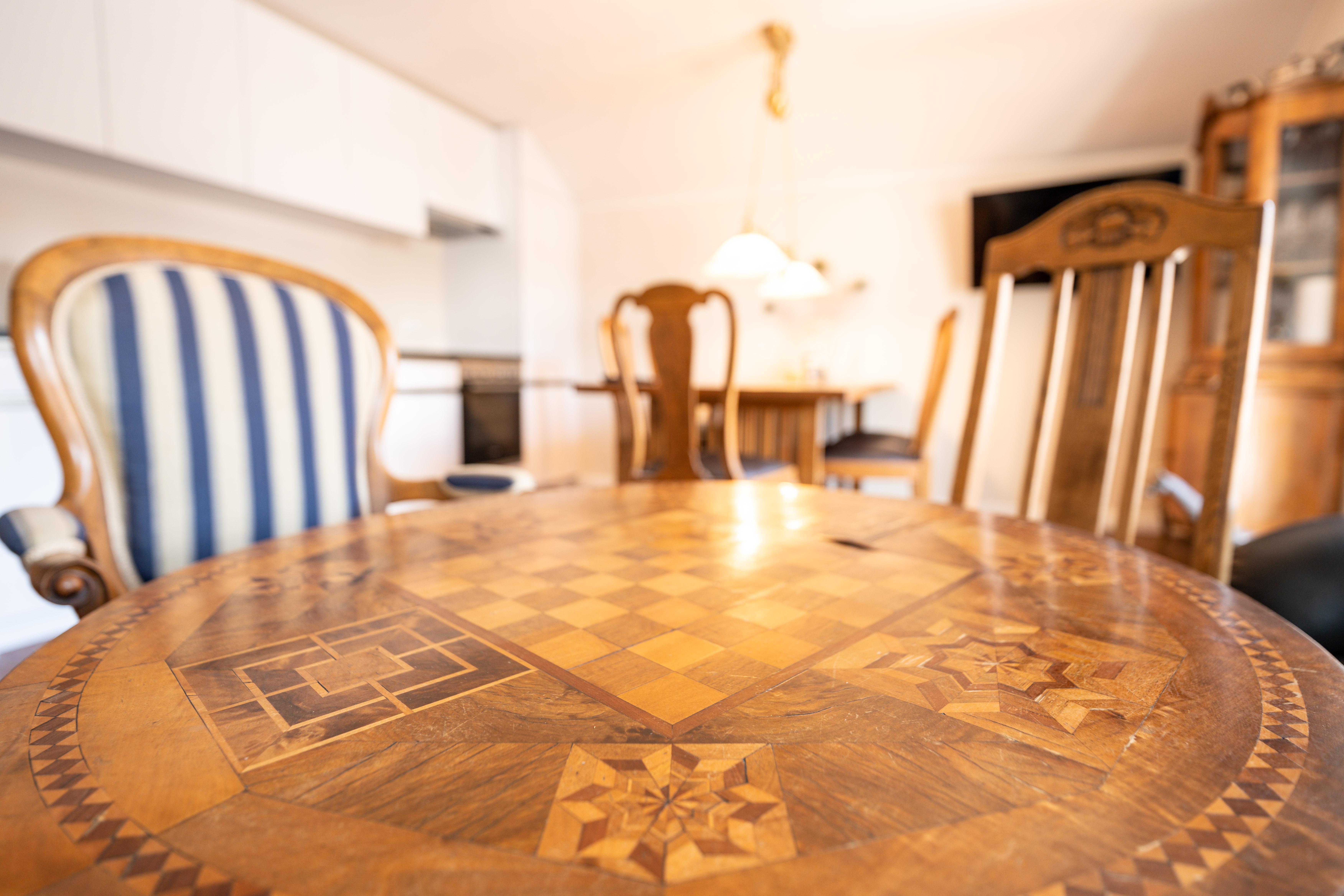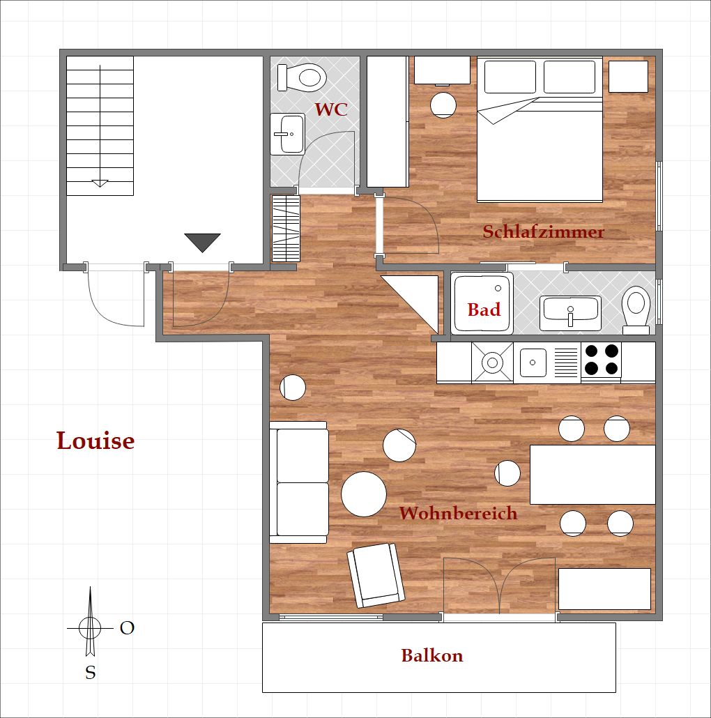 Unser geräumiges 2-Zimmer-Appartement Louise (47 m2) bietet großzügig Platz für bis zu zwei Personen. Die Räume bestechen durch eine warme Atmosphäre, erzeugt durch gepflegtes Parkett und Massivholzmobiliar. Wenn Sie es sich im Wohnbereich auf den gepolsterten Stühlen im Stil des französischen Barock bequem machen, dürfen Sie sich ein bisschen wie ein König oder eine Königin fühlen und sich im Laissez-faire und Savoir-vivre üben. Echte Blickfänge sind der Schrank im Eingangsbereich sowie der antike Spieltisch in der Sitzecke mit Ledergarnitur. Dort und am großen Esstisch können Sie auch in größerer Runde zusammensitzen. Die moderne, voll ausgestattete weiß lackierte Küchenzeile bietet einen stimmigen, leichten Kontrast.