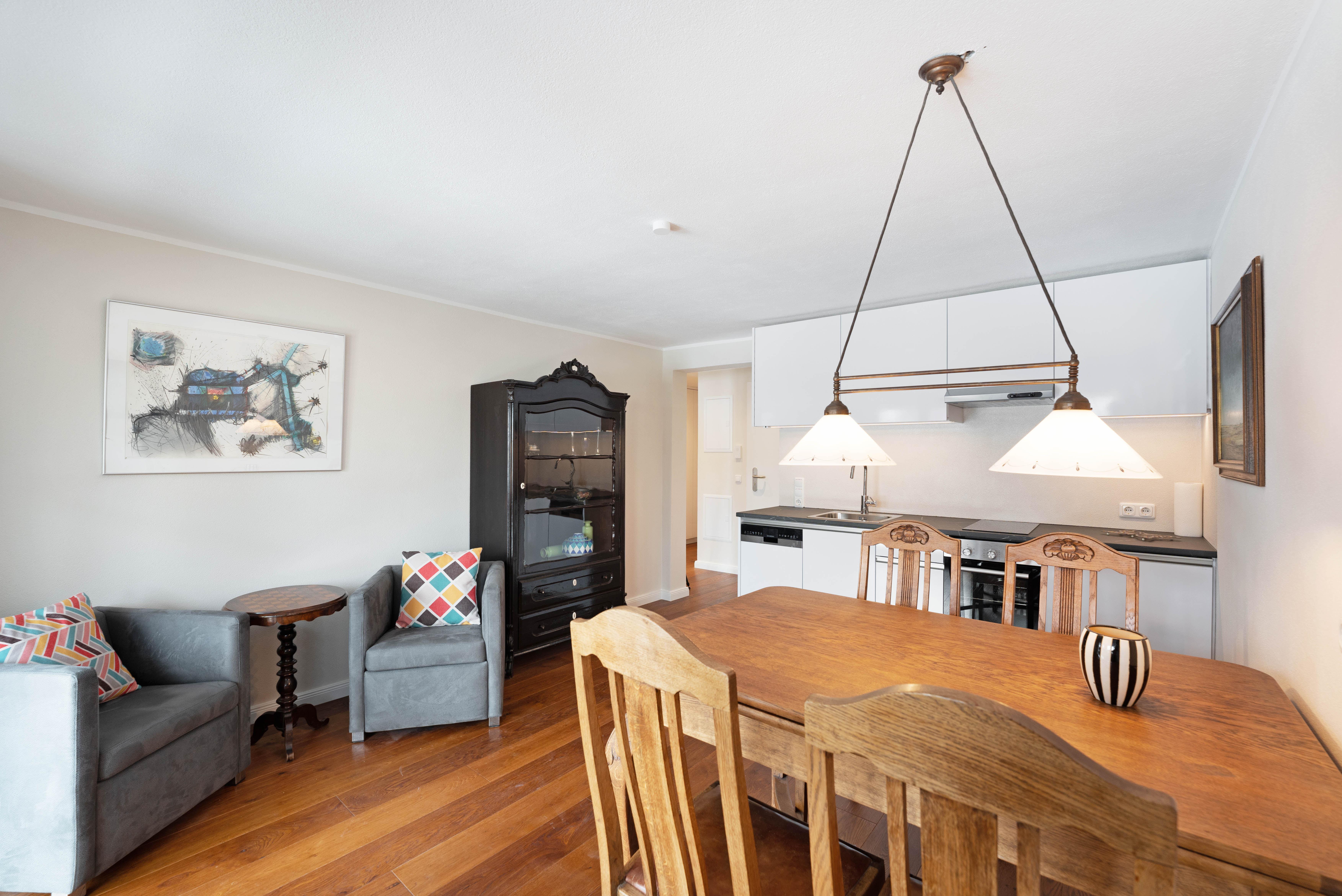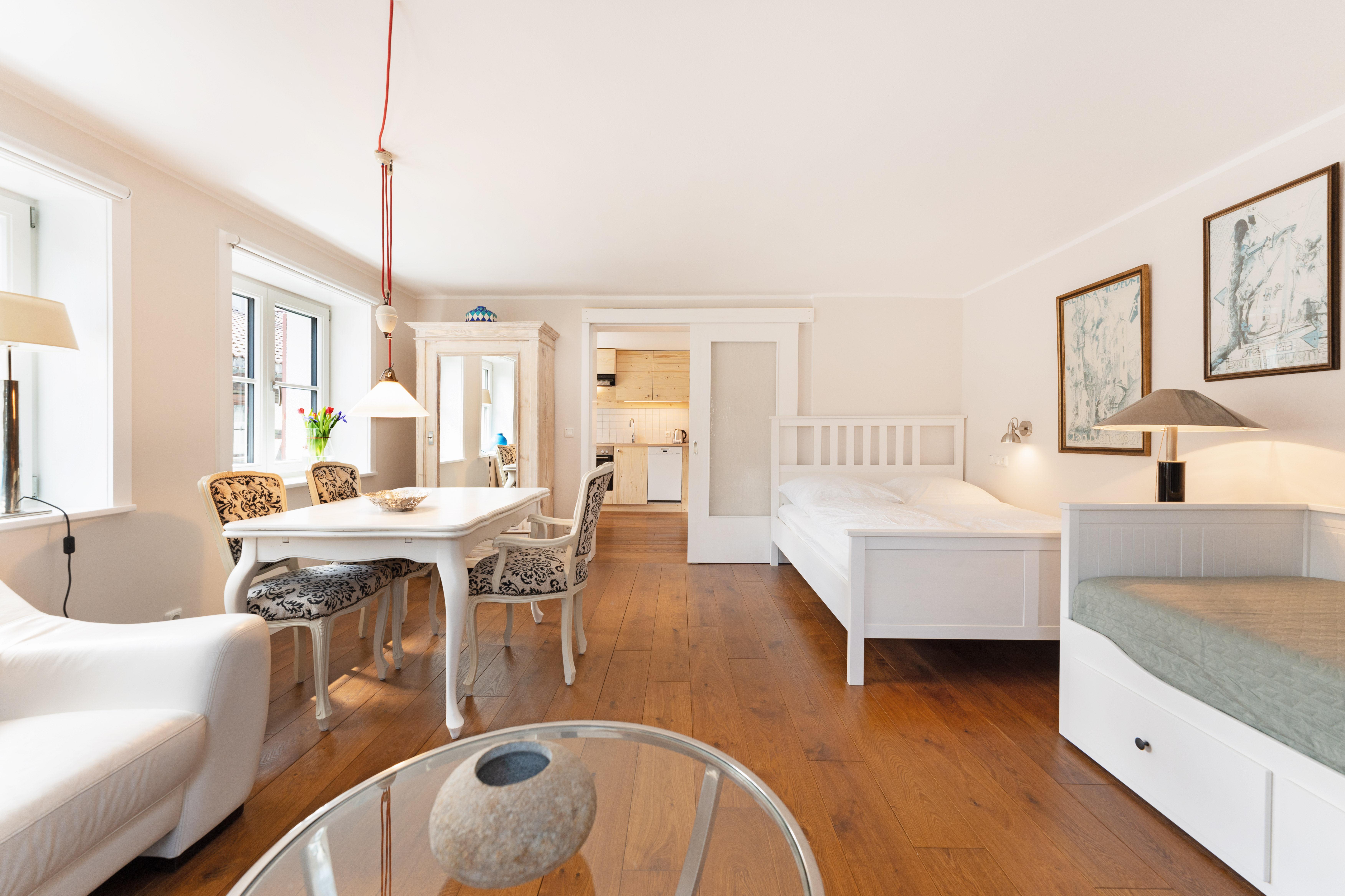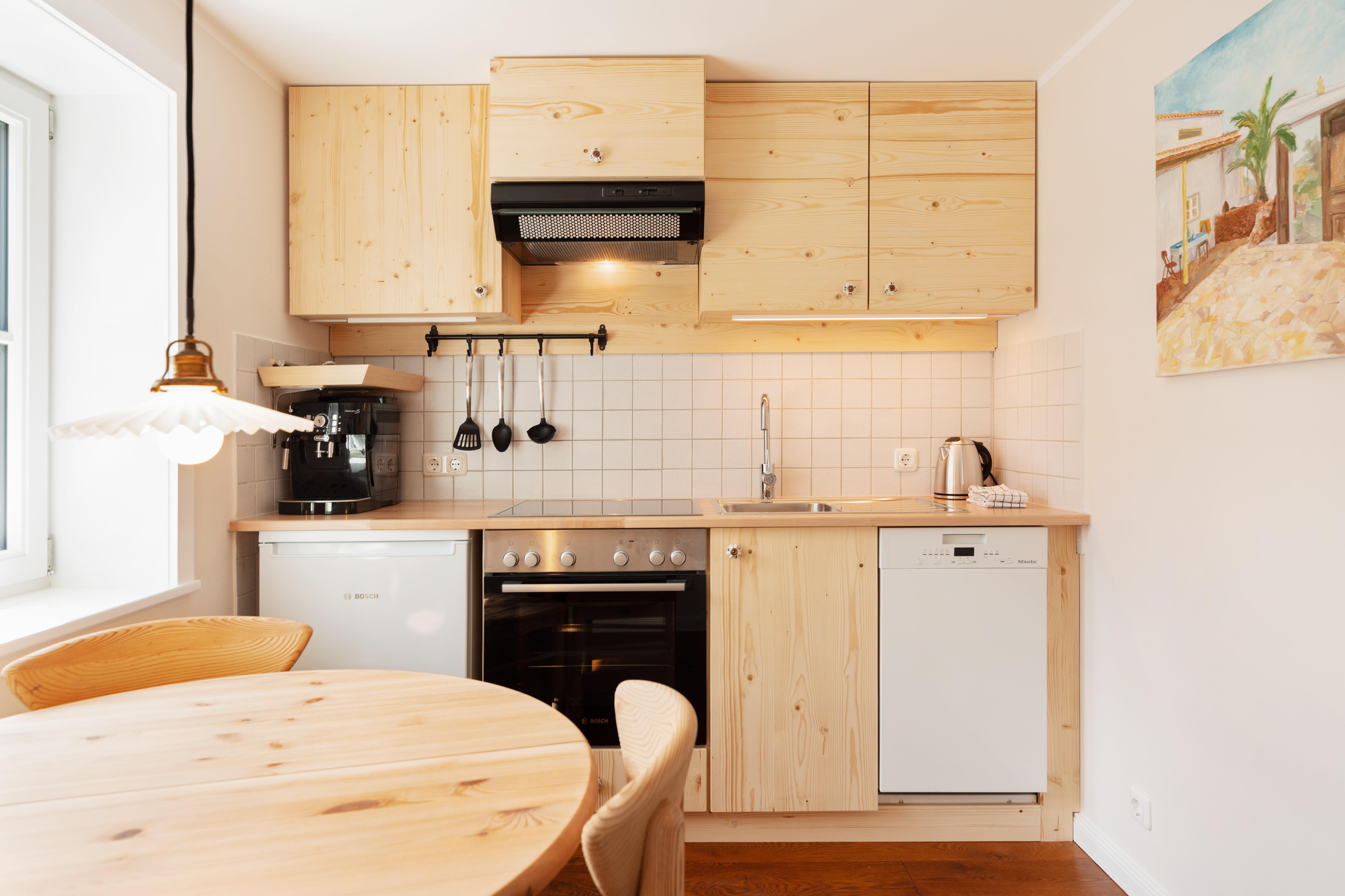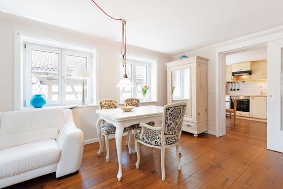 Der integrierte Wohn- und Schlafraum kombiniert unkonventionell schöne antike mit zweckmäßigen modernen Möbeln, die miteinander harmonieren. Hier findet jeder seinen Lieblingsplatz, z.B. die Ledercouch zum Lesen und Fernsehen oder das Sofabett zum Dösen nach einer Radtour. Am Tisch können Sie Wanderkarten studieren, sich die Zeit mit Gesellschaftsspielen vertreiben und gemeinsam essen. Neben einem Doppelbett (1,40 x 2,00 m) verfügt der Raum über ein Sofabett (0,80 x 2,00 m), das durch Ausziehen verdoppelt werden kann. So eignet sich das Appartement auch für Familien mit bis zu zwei Kindern. Die neu eingebaute Schreinerküche aus warmen Fichtenholz ist voll ausgestattet und bietet Platz zum Frühstücken und gemütlichen Verweilen.