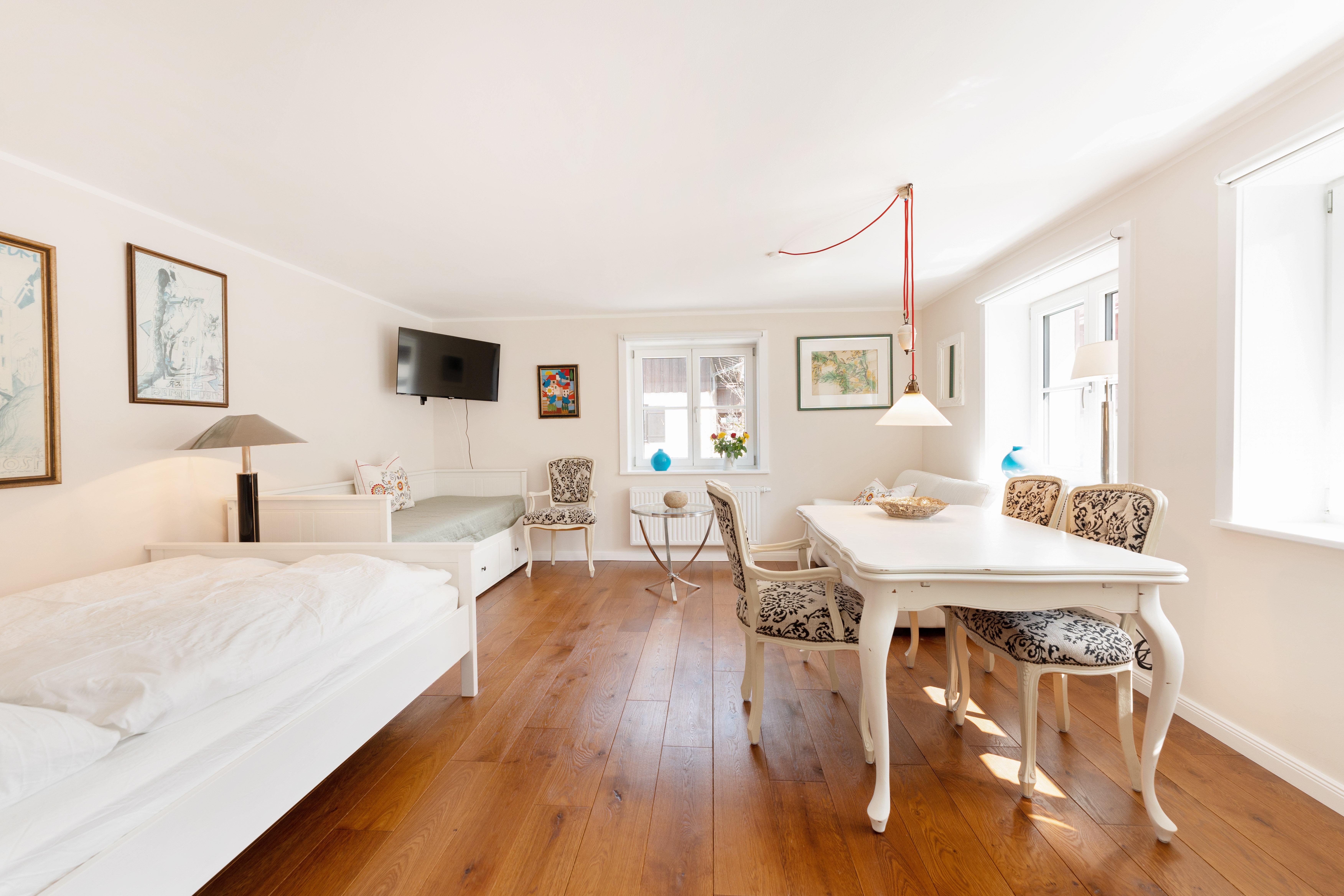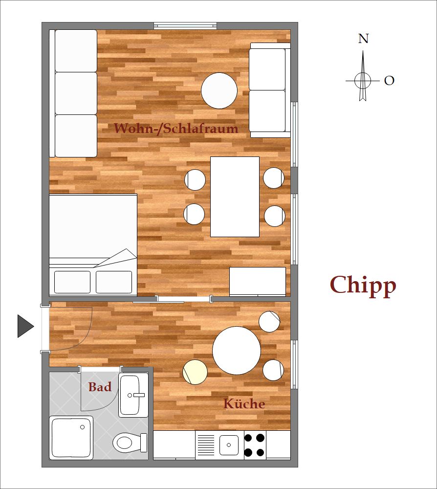 In unserem freundlich-hellen Appartement Chipp (34 m2) werden Sie von der Morgensonne geweckt. Und wir wünschen uns gerne recht häufig fröhliches Kinderlachen dazu.