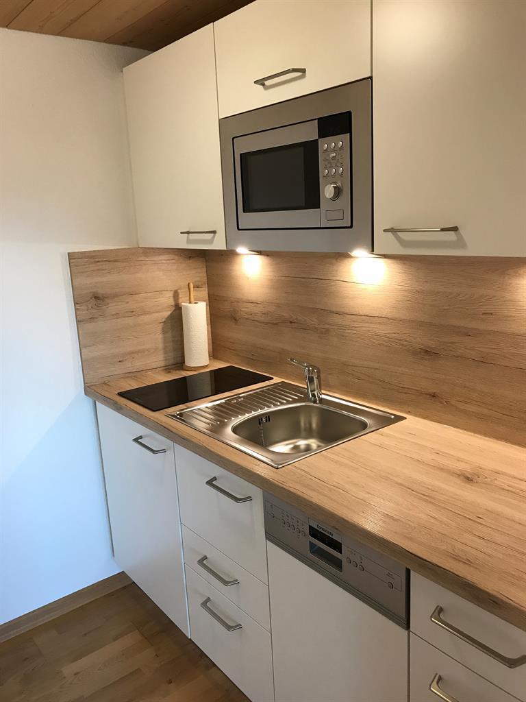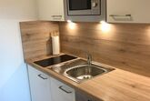 Komplett eingerichtete Kochnische mit Geschirrspüler, Kaffeemaschine, Eierkocher, Mikrowelle mit Grill, Toaster, Wasserkocher, 2 Platten Cerankochfeld.