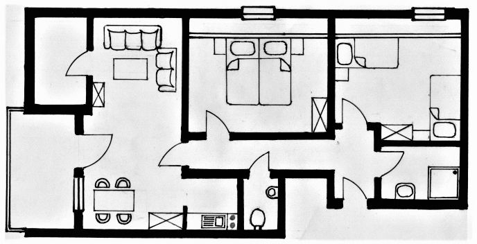 Zwei Schlafzimmer, Duschbad - WC (getrennt). Großer überdachter Balkon zur Südwestseite.