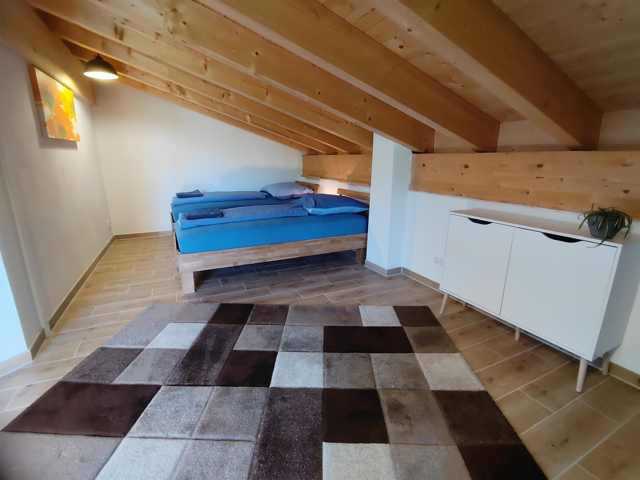 Im Giebel angekommen, erwartet Sie ein Schmuckstück mit einem Panorama Blick. Im Sternenstaub soll Ihnen an nichts fehlen. Die Wohnung ist von Grund auf aufwendig erneuert worden und verfügt über zwei Schlafzimmer (Doppelbett 140 cm und zwei Einzelbetten mit Balkonausgang;Doppelbett 180 cm und ein Einzelbett), zwei Bäder mit Dusche und WC, großer Wohn/Essbereich mit moderner Küche inklusive Spülmaschine, Balkon für herrliche Panoramasicht auf die Bergkette.