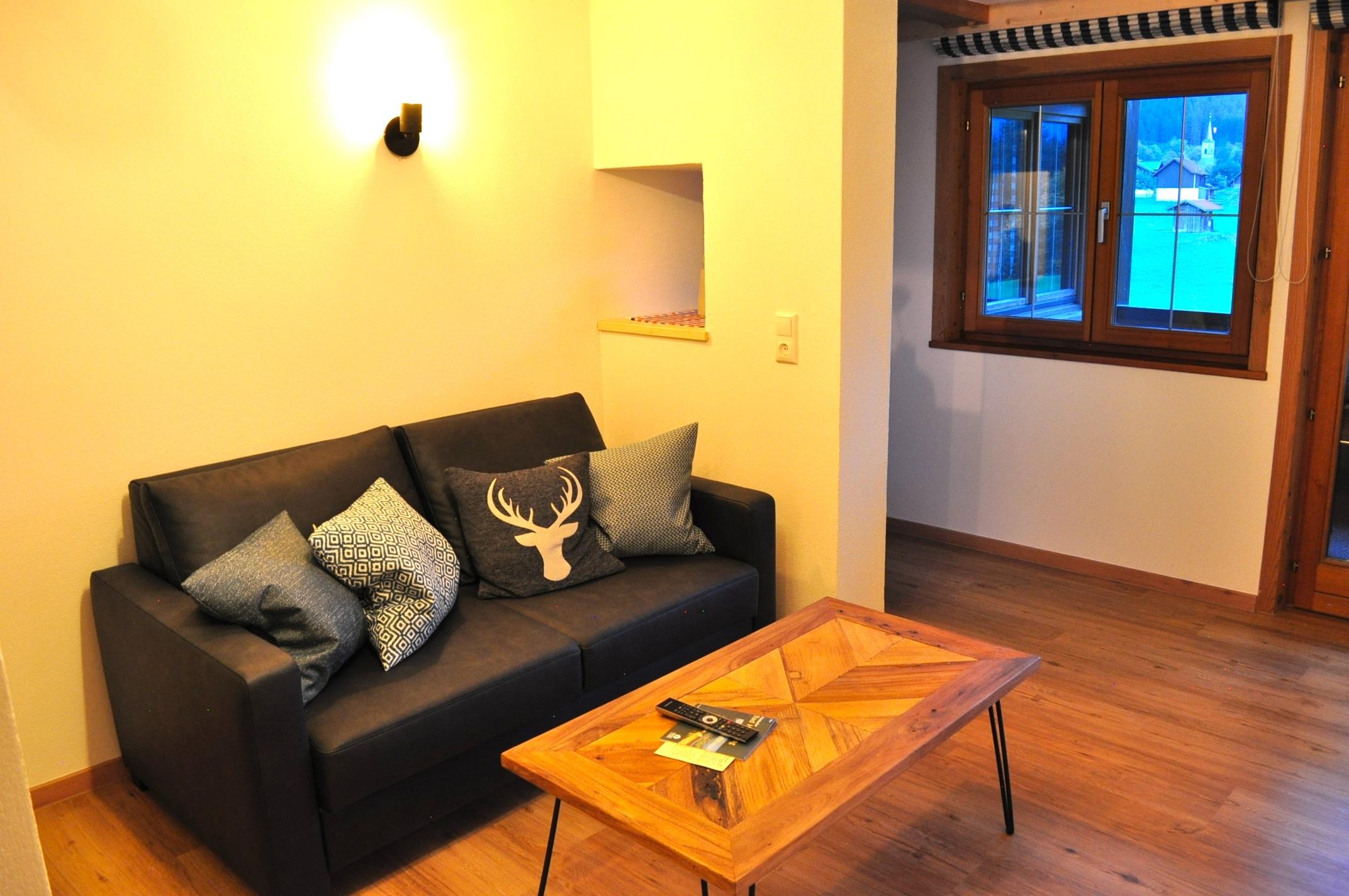 Neu renovierte Ferienwohnung im 1. Stock mit Ost-Balkon. Freier Ausblick auf das Bergdorf Hinterstein und die Allgäuer Hochalpen. Moderne Küche, sep. Schlafzimmer, Badezimmer mit Dusche/WC.