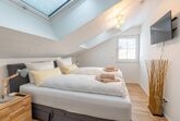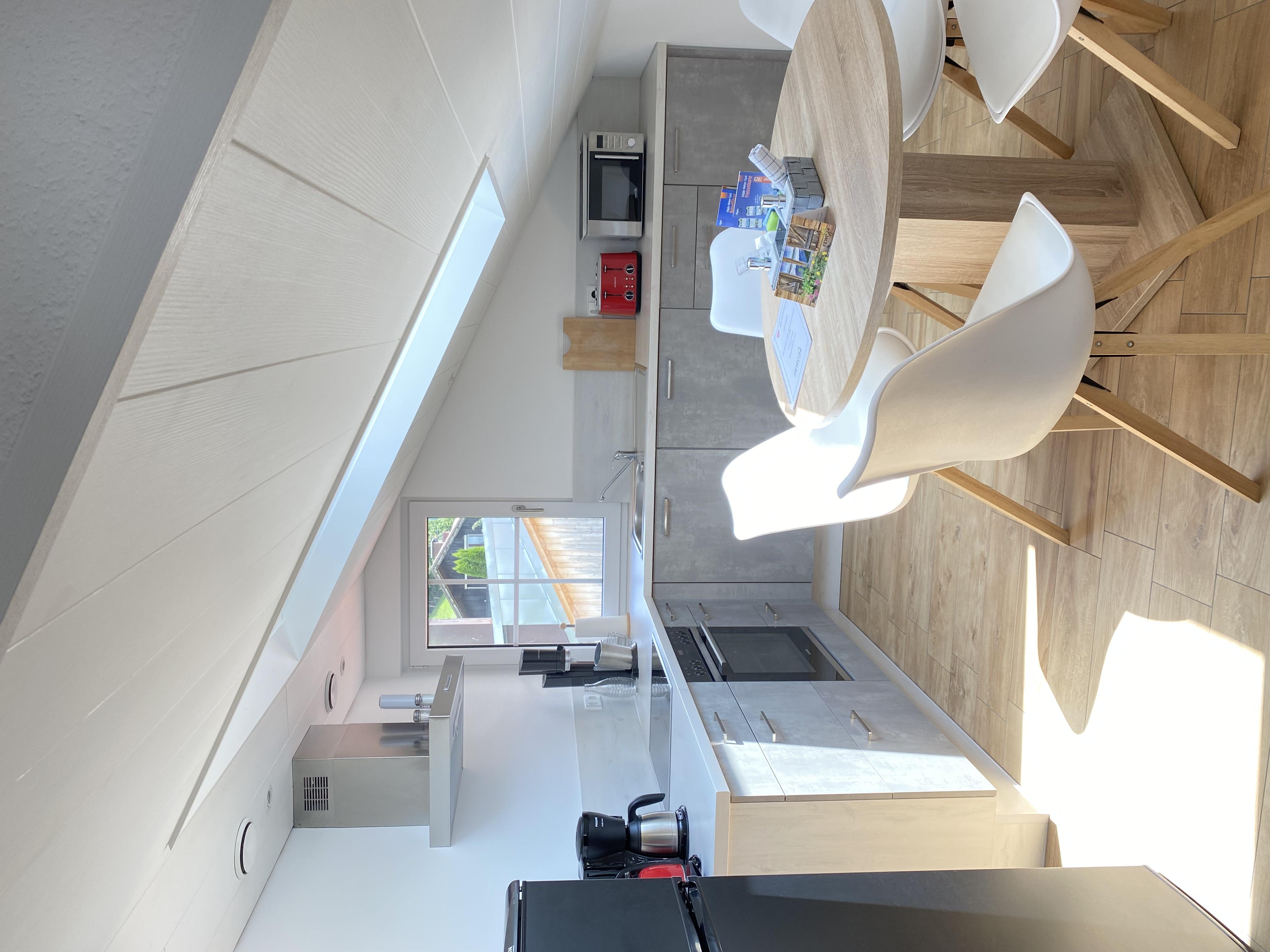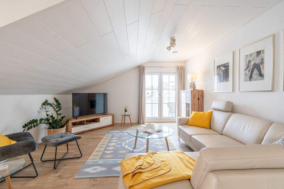Ferienwohnung im Dachgeschoss mit Süd- und Westbalkon, 2 sep. Schlafzimmer, wobei eines auch als Lesezimmer oder Büro genutzt werden kann. Komplett ausgestattete Küche mit Essplatz, Wohnzimmer mit gemütlicher Couchgarnitur. Badezimmer mit Dusche/WC, zweites sep. WC. Haustiere nur auf Anfrage erlaubt (15 Euro / Nacht)