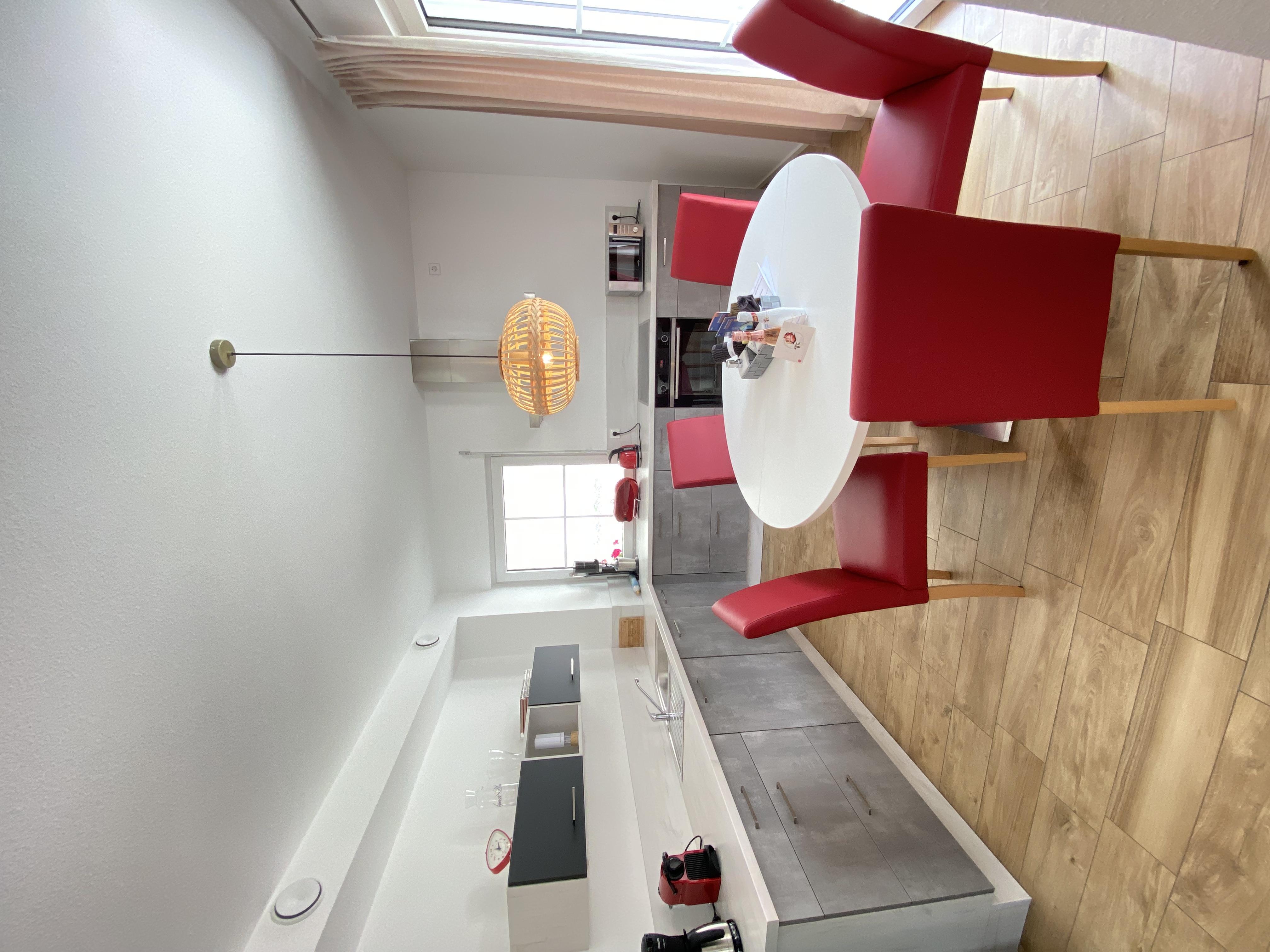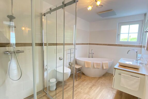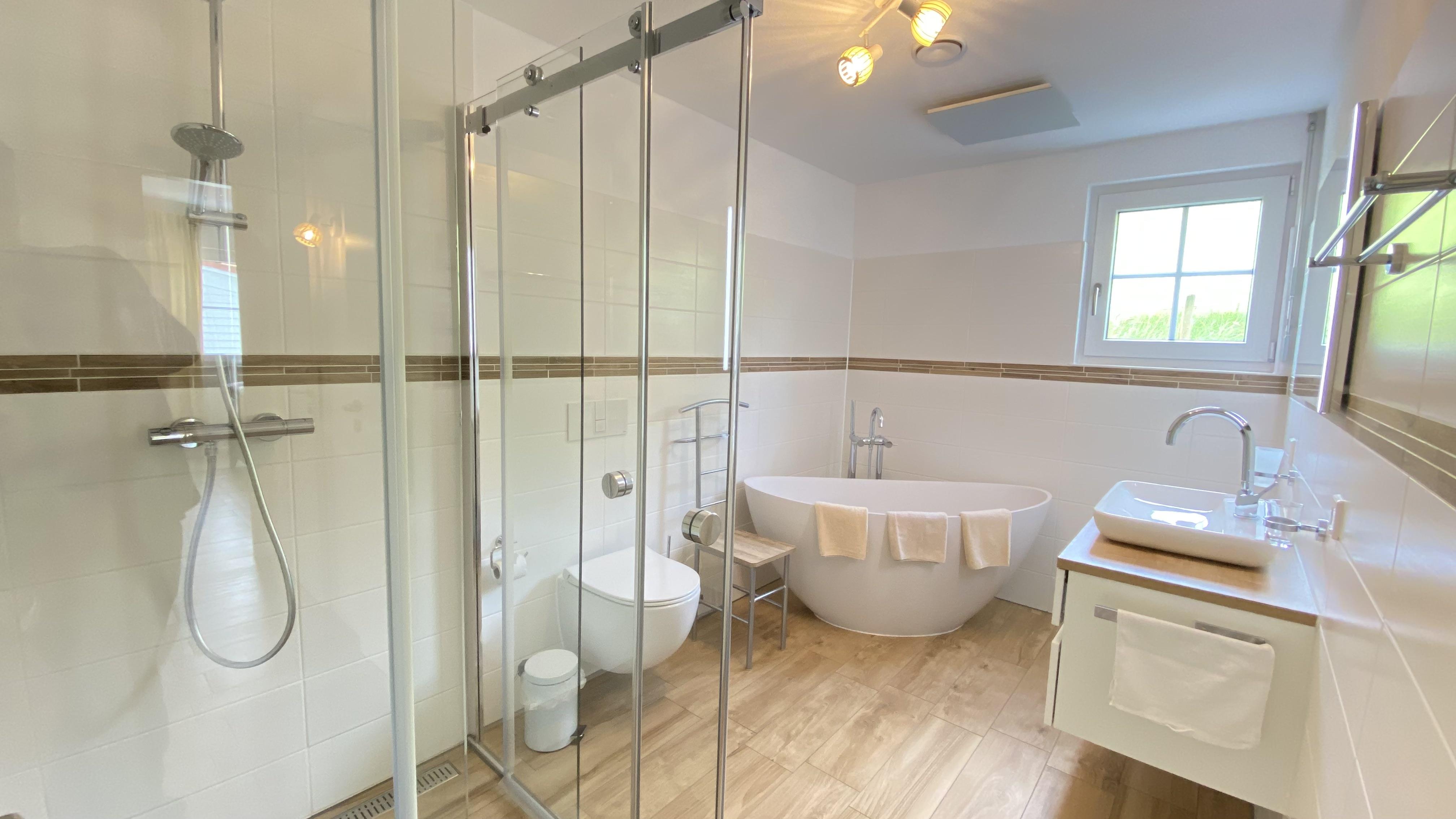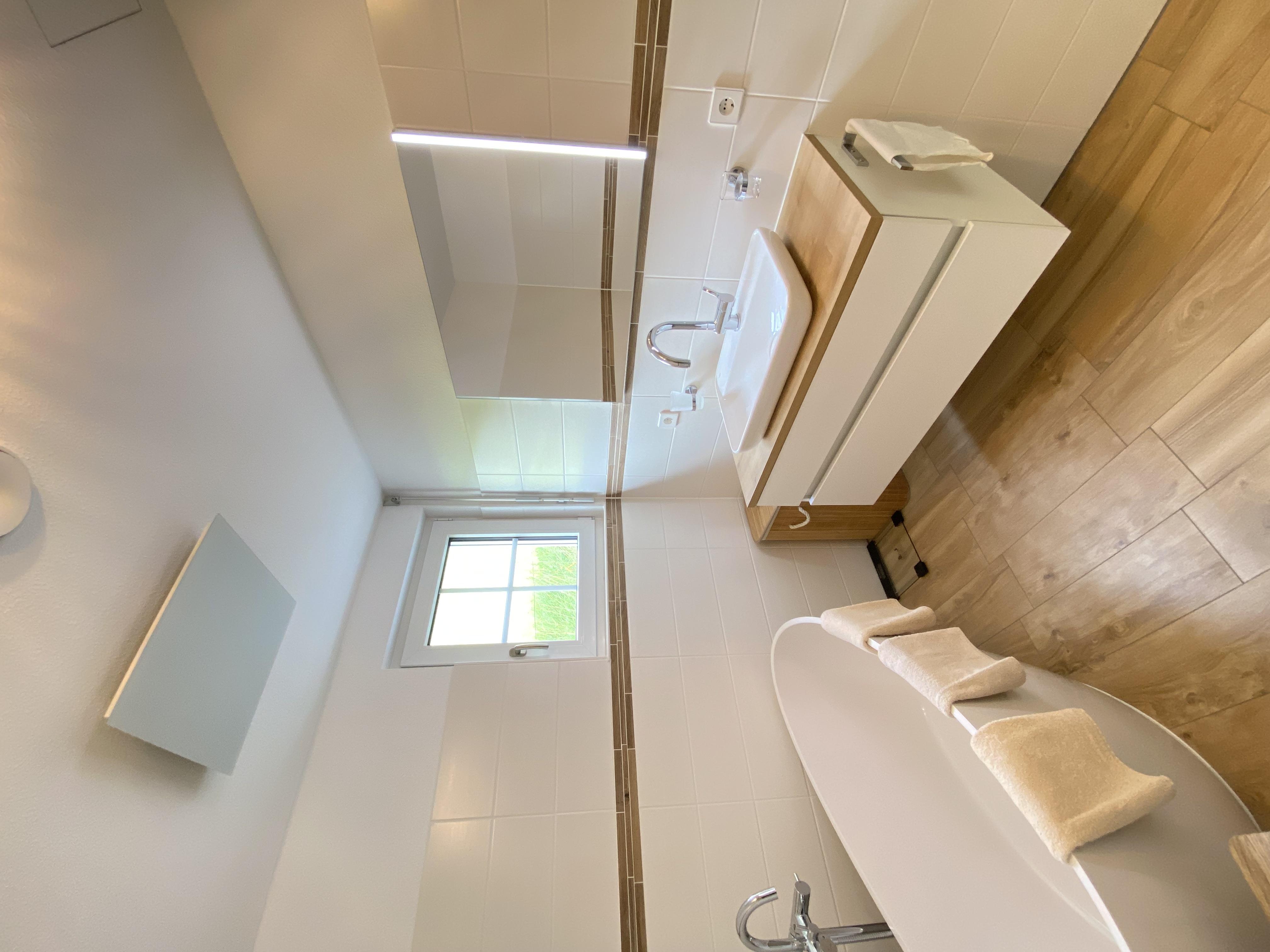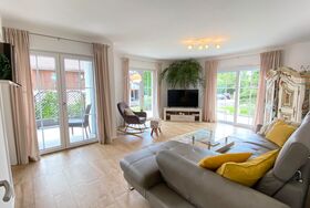 Ferienwohnung im Erdgeschoss mit Terrasse, 2 sep. Schlafzimmer, wobei eines auch als Lesezimmer oder Büro genutzt werden kann. Komplett ausgestattete Küche mit Essplatz, Wohnzimmer mit gemütlicher Couchgarnitur. Badezimmer mit Dusche/Badewanne/WC, zweites sep. WC. Behindertengerecht eingerichtet auch für Rollstuhlfahrer möglich.