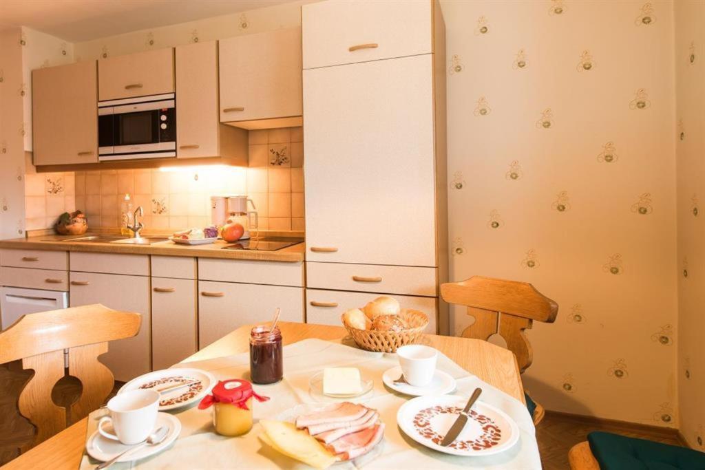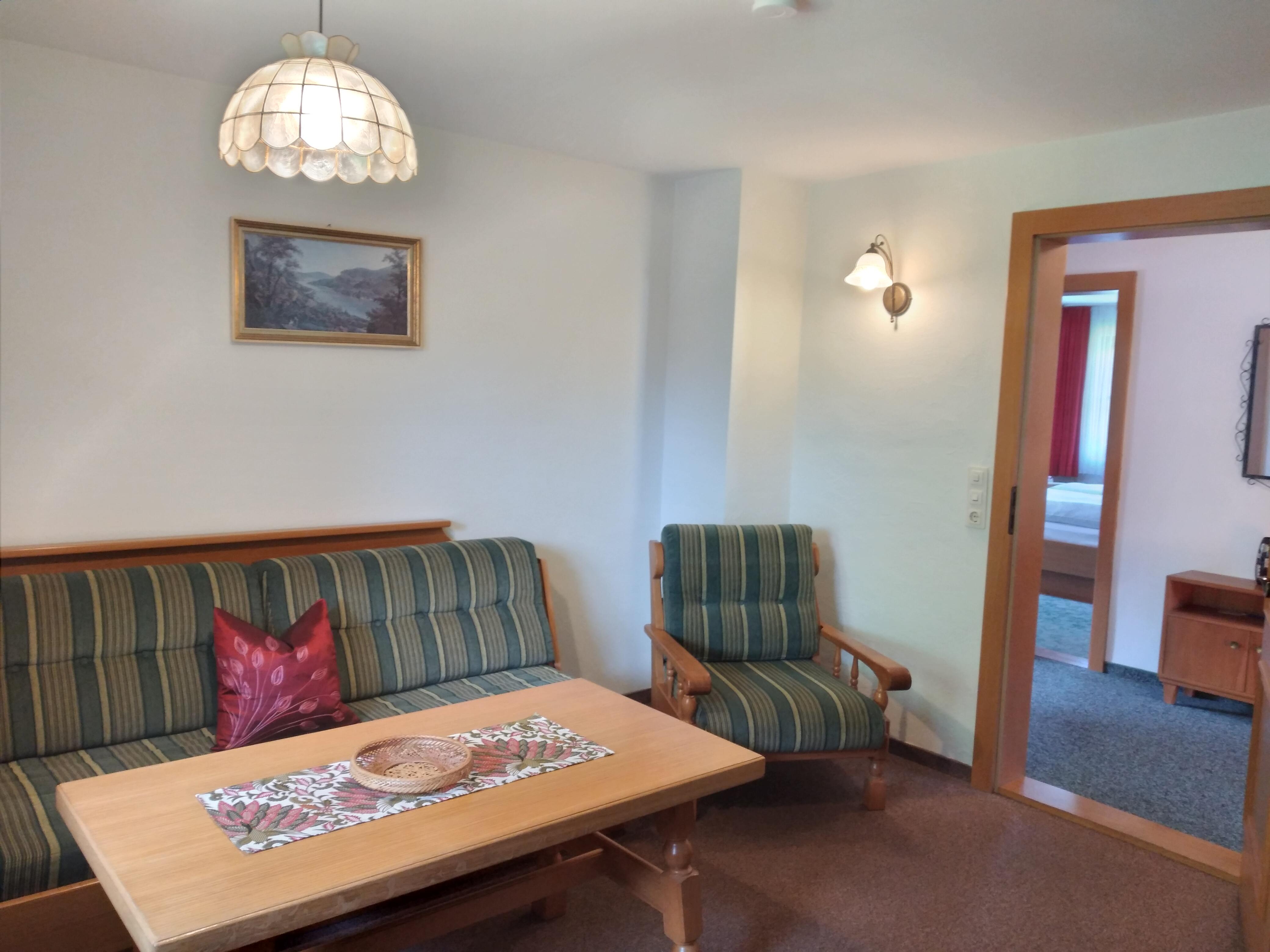 Wohnung 75 qm für 2-4 Personen mit gut ausgestatteter Wohnküche, sep. Wohnzimmer, 1-2 Schlafzimmer, begehbare Dusche, WC, Flur mit Garderobe, Südbalkon mit Bergblick, LCD-Kabel-TV, Wlan, Frühstückservice.