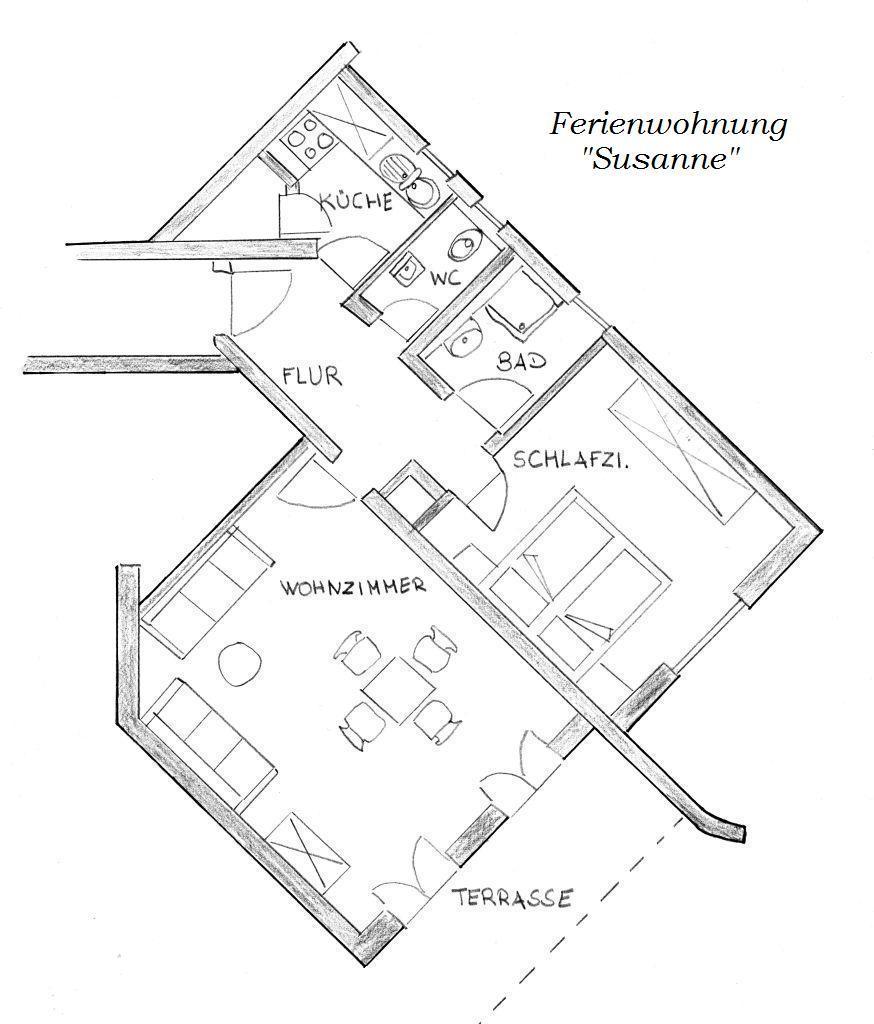Die Ferienwohnung Susanne befindet sich im Tiefparterre unseres Hauses. Im separaten Schlafzimmer ist ein zweiter Fernseher. Das Wohnzimmer ist sehr schön im mediterranen Stil eingerichtet. In der separaten kleinen Küche finden Sie alle wichtigen Geräte. Im Badezimmer ist eine Dusche, Waschbecken und Fön, das WC ist separat. Die Südost-Terrasse eignet sich wunderbar zum Frühstücken oder für ein ungestörtes Sonnenbad.