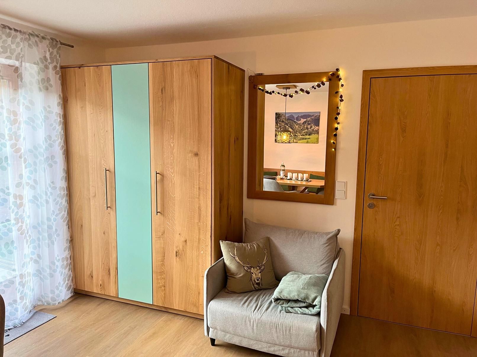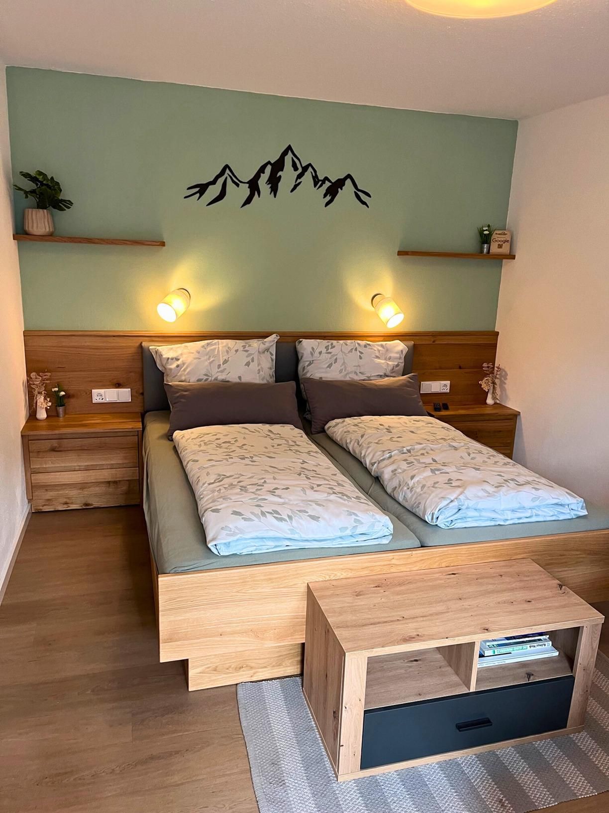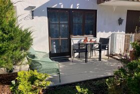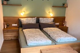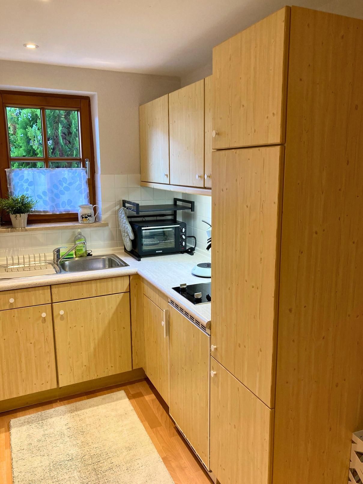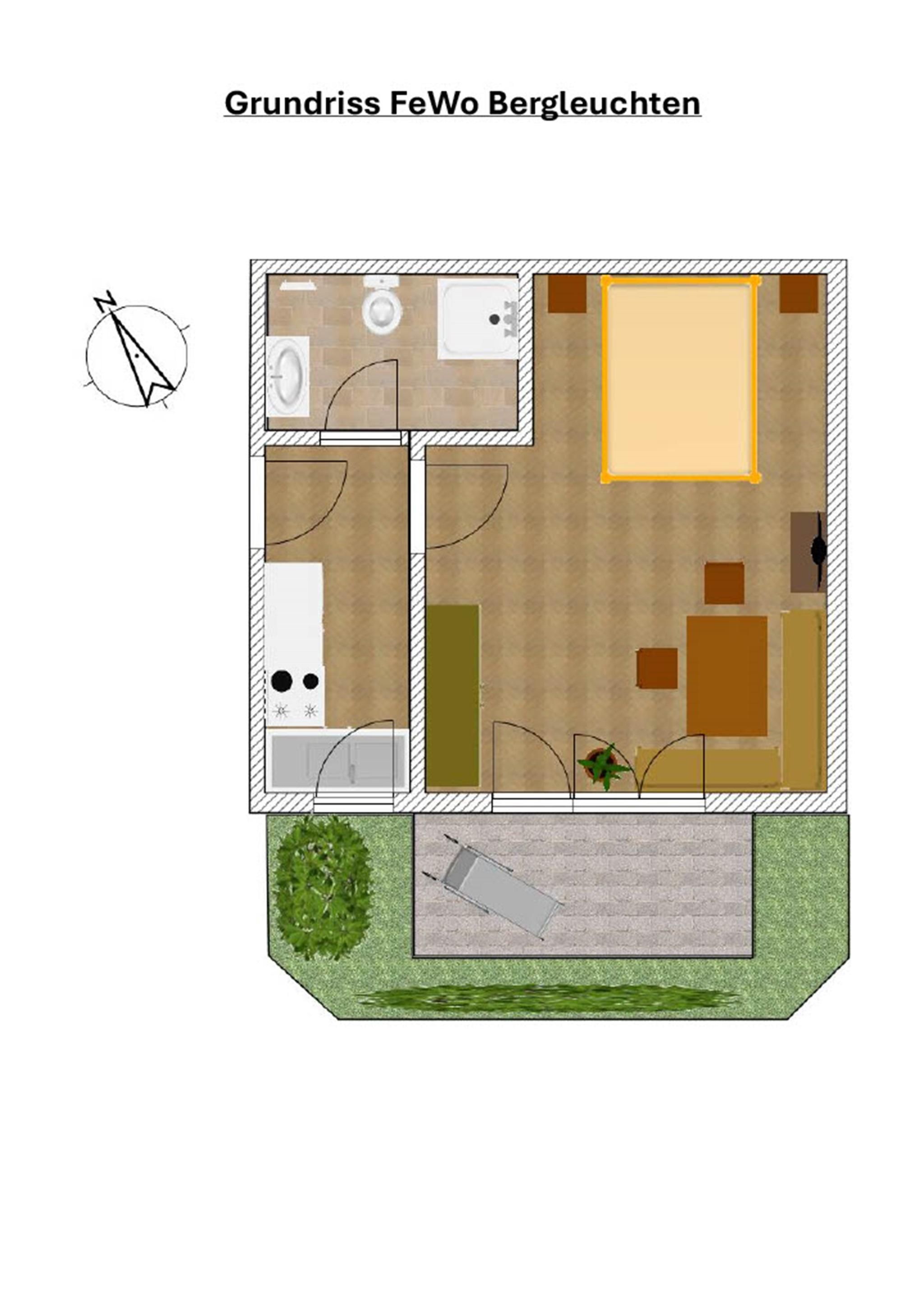 Unsere Ferienwohnung bietet neben einem kleinen Bad (mit Dusche und WC) auch eine seperate, gut ausgestattete Küche, in der Lieblingsspeisen zubereitet werden können. Daneben befindet sich ein kombinierter Schlaf-Wohnbereich (feststehende Betten 180x200) mit großzügiger Essecke und einem geräumigen Schrank. Hier gelangen Sie auch auf Ihre eigene Terrasse mit Sonnenschirm, Sitz- und Liegemöglichkeit, um die frische Bergluft in vollen Zügen zu genießen. Kostenloses WLAN ist vorhanden.