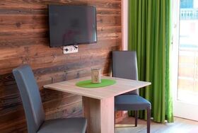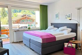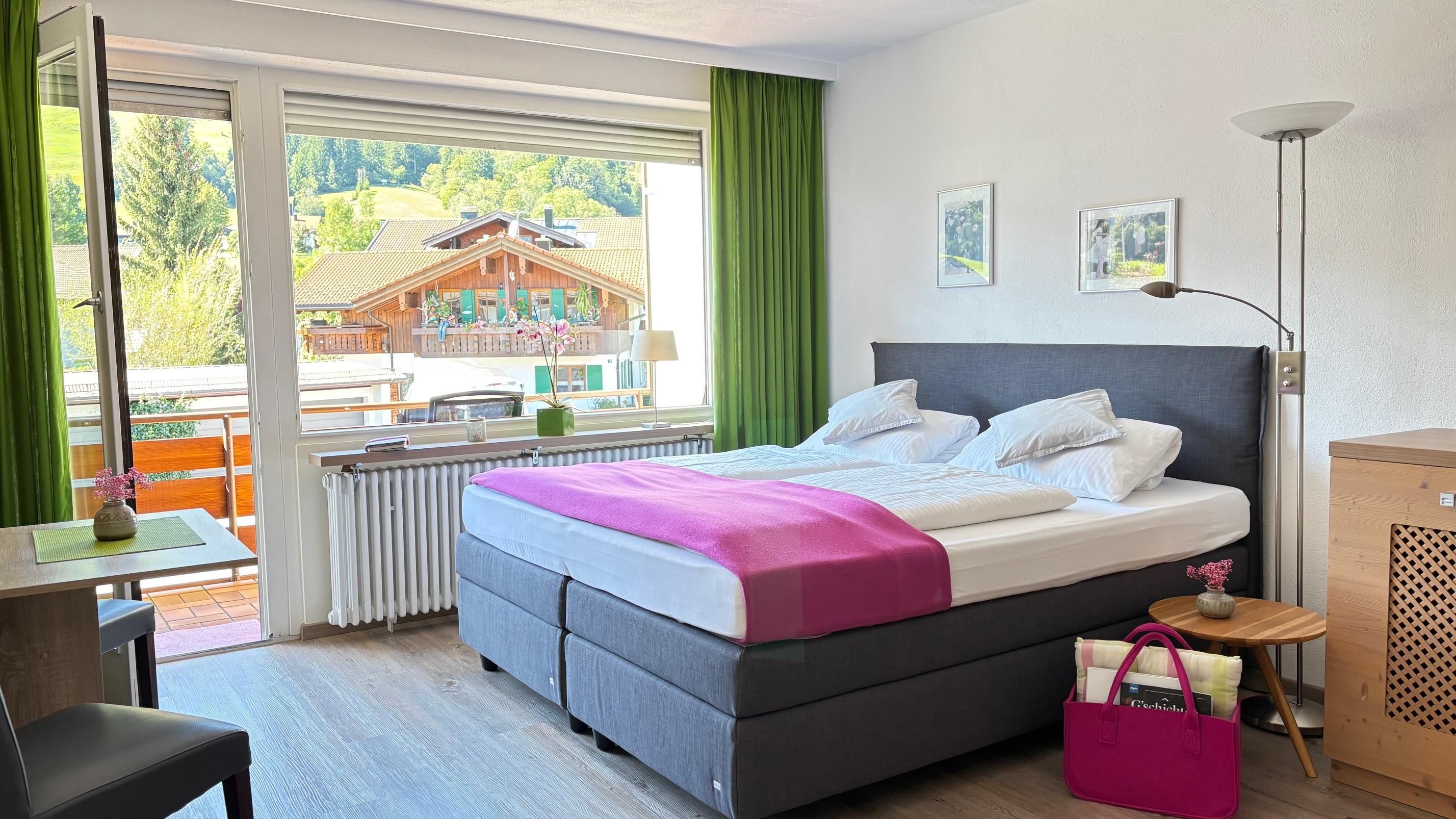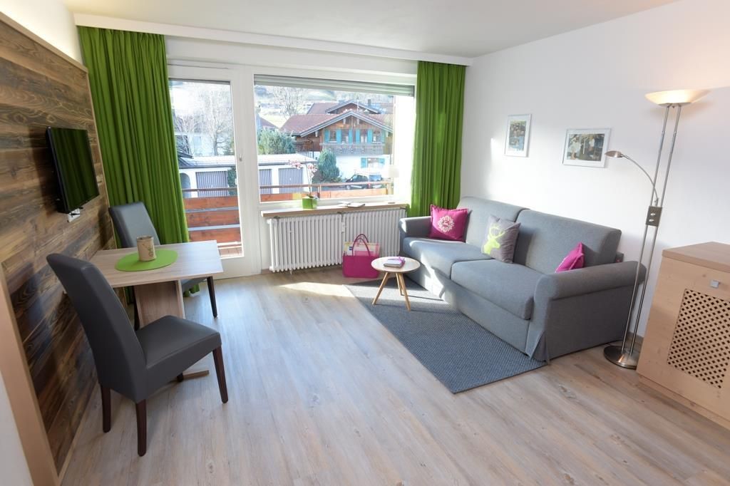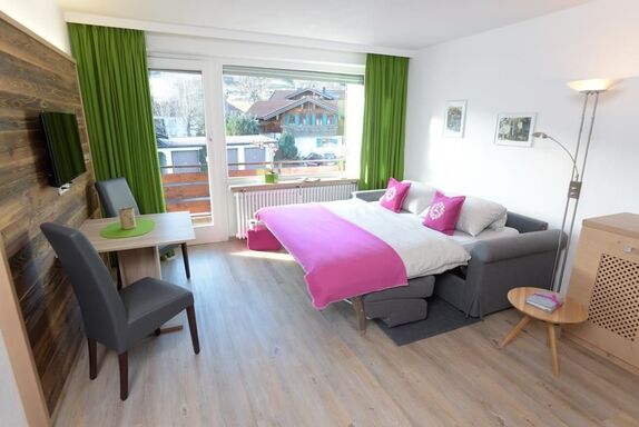 Neu renoviertes 1-Raum-Wohlfühlapartment, 28qm, 1. Etage, im Apartmenthaus in Bolsterlang, Dorfstraße 19, mit kleiner Kochnische, Wohn-Schlafbereich mit bequemer Schlafcouch (180/200), sep. Dusche und WC und Südwestbalkon mit schönem Orts- und Bergblick.