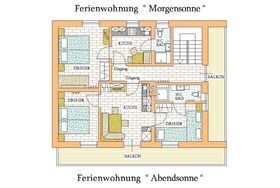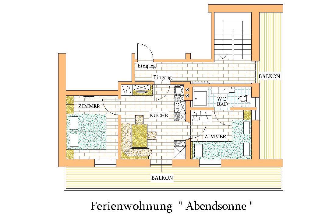 Unsere Ferienwohnung ABENDSONNE ist eine gemütliche und neu möblierte Wohnung mit 48m². Die moderne Wohnküche ist komplett eingerichtet mit einer gemütlicher Sitzmöglichkeit und Satelliten TV. Für den Schlaf gibt es in der Ferienwohnung ein Doppelbettzimmer und kleines Zweibettzimmer mit Durchgang zum neusanierten Badezimmer mit Dusche und WC.