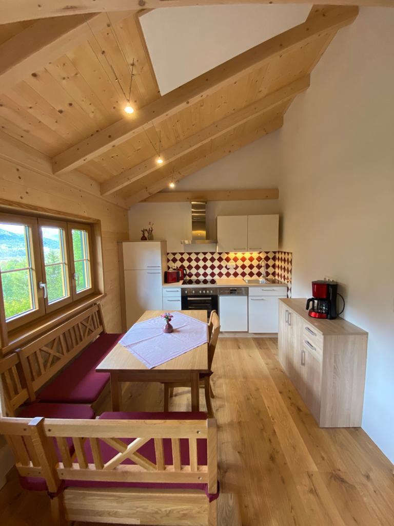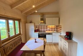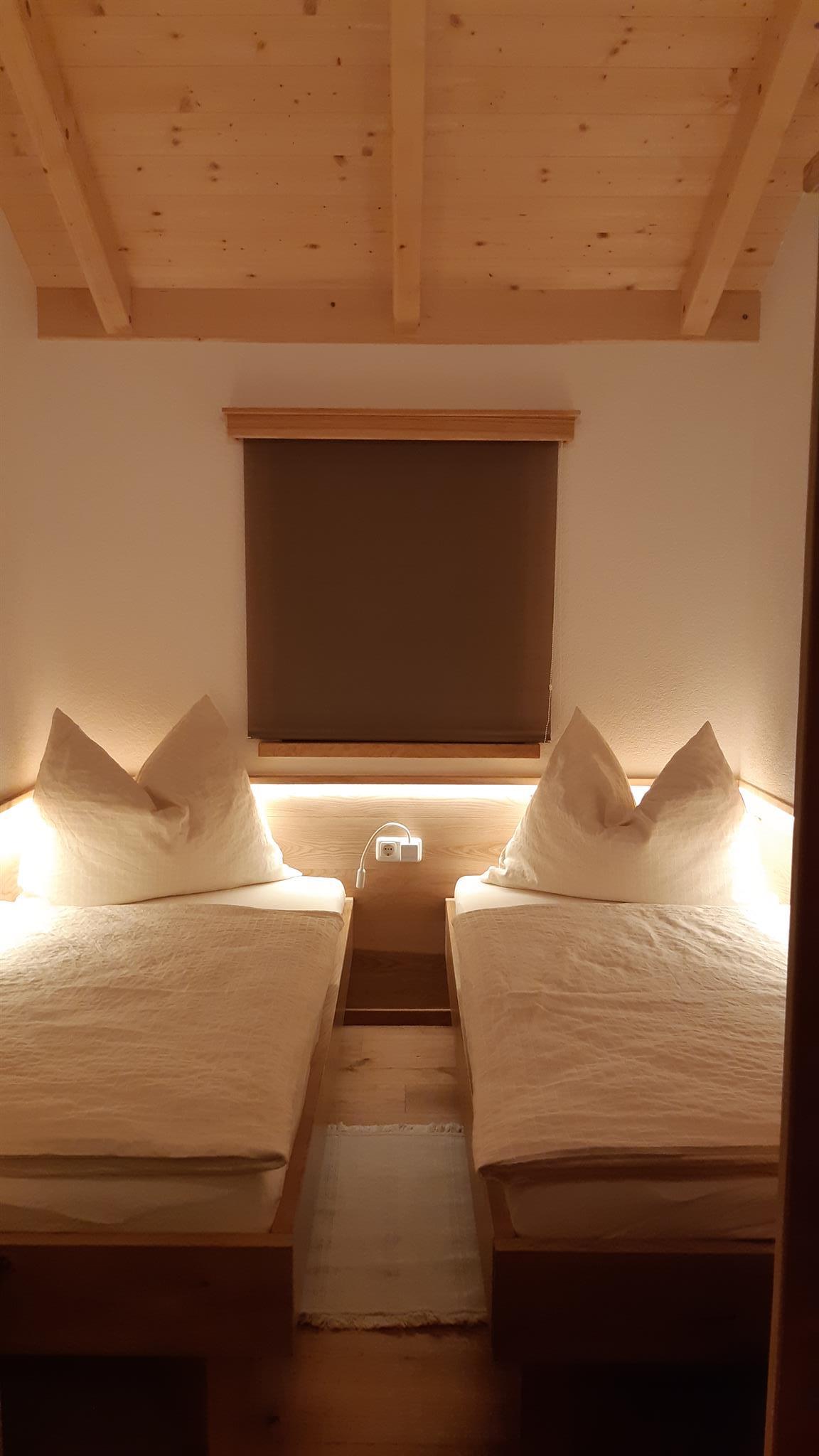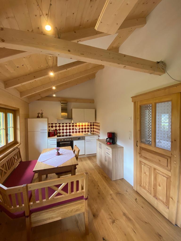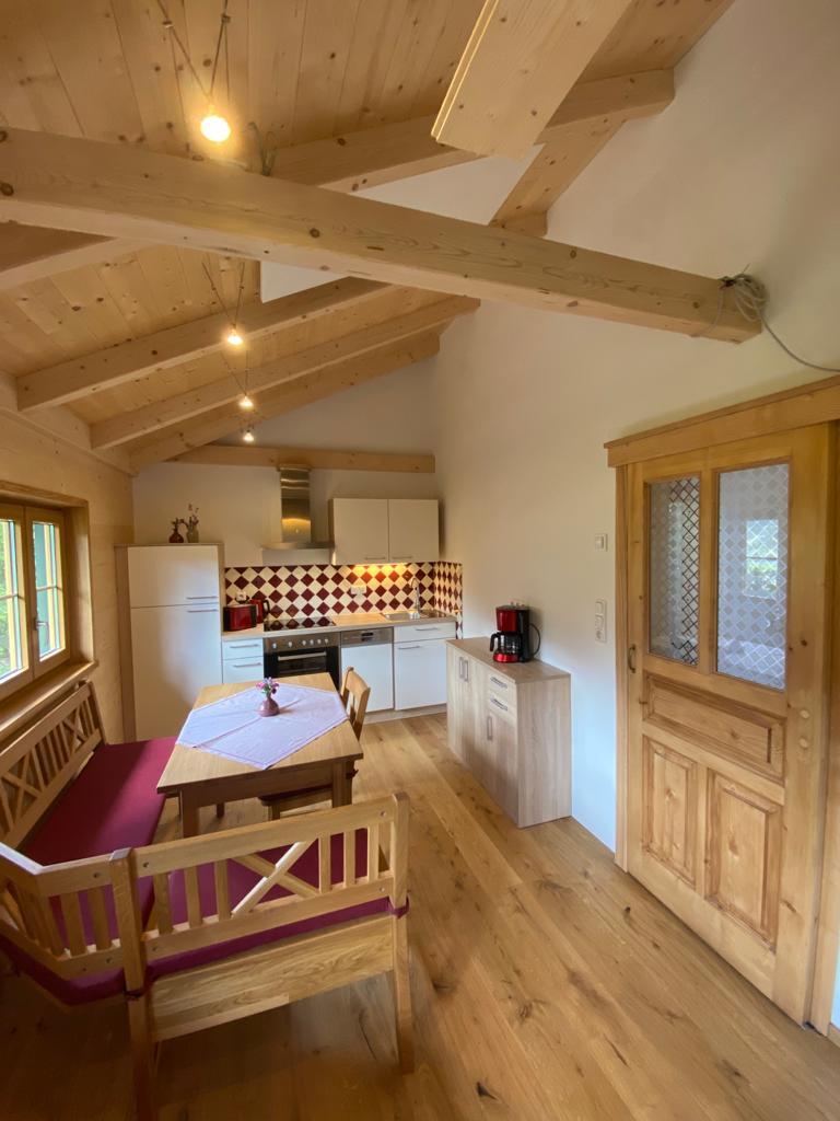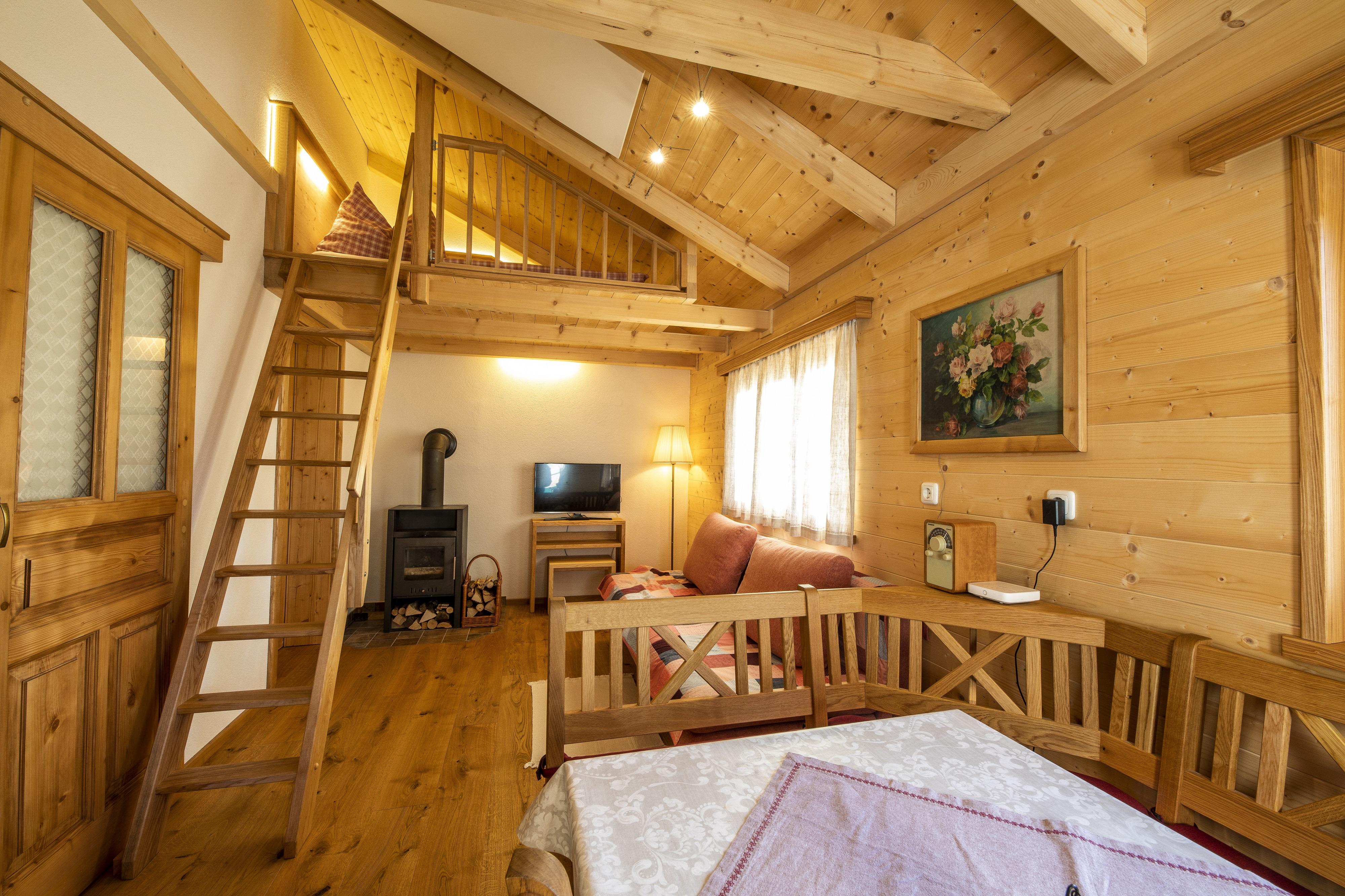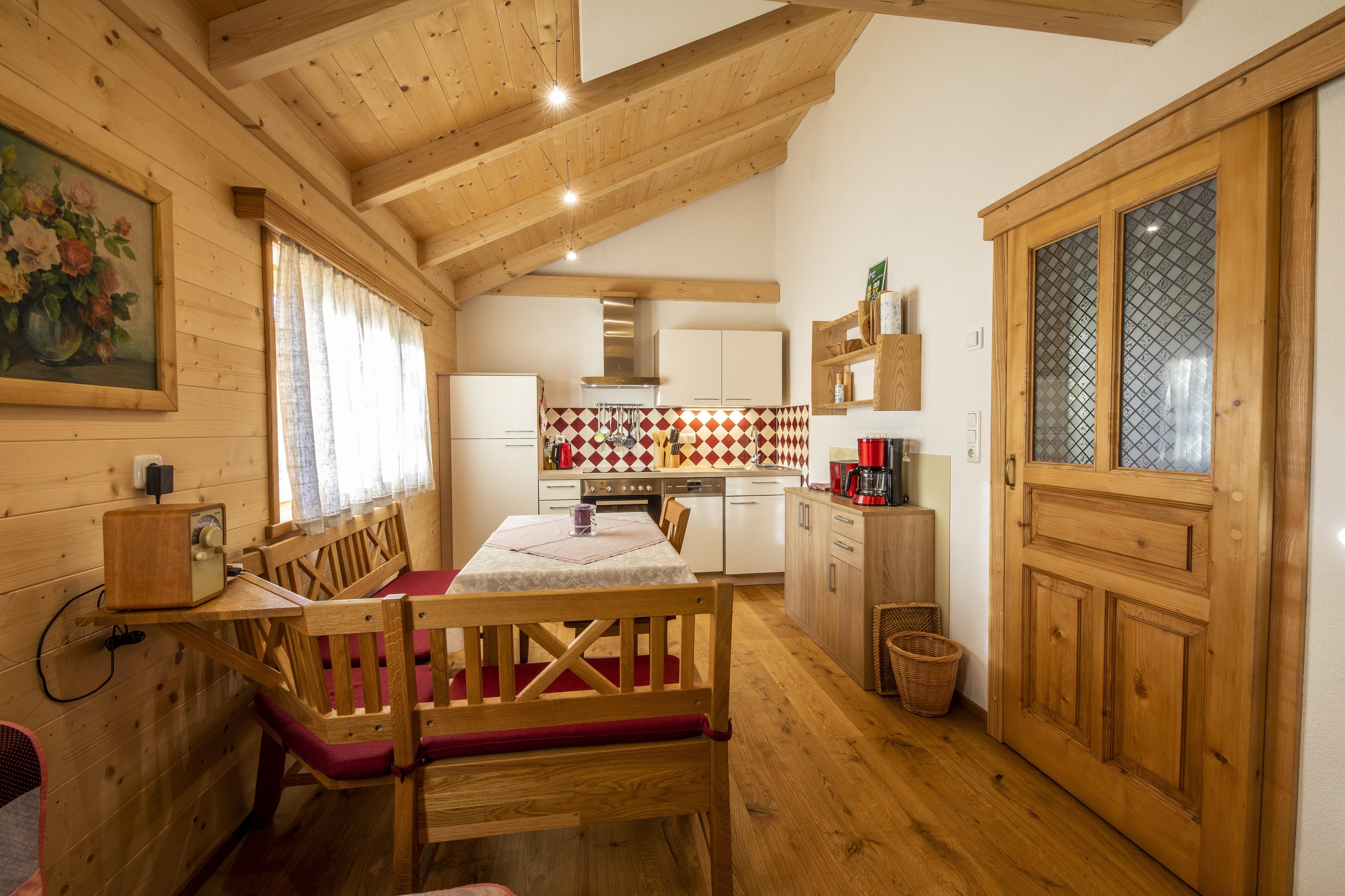Unsere kleine gemütliche Holzriegelhütte mit Charme haben wir mit viel Liebe zum Detail und Vollholzmöbeln neu für unsere Gäste gestaltet. Die Ferienhütte hat eine Wohnfläche von 34m2 besteht aus einem Schlafzimmer mit zwei Betten (0,9 x2,0m) die zusammengeschobern werden können. In der Wohnküche befindet sich eine kleine Galerie (Kuschelnest), die über eine freie Stiege erreicht wird. (Mit einer Schlafmatratze 1,4 x 2,0m). Das Sofa kann auch als Bett ausgezogen werden. Größe 1,4 x 2,0m).
