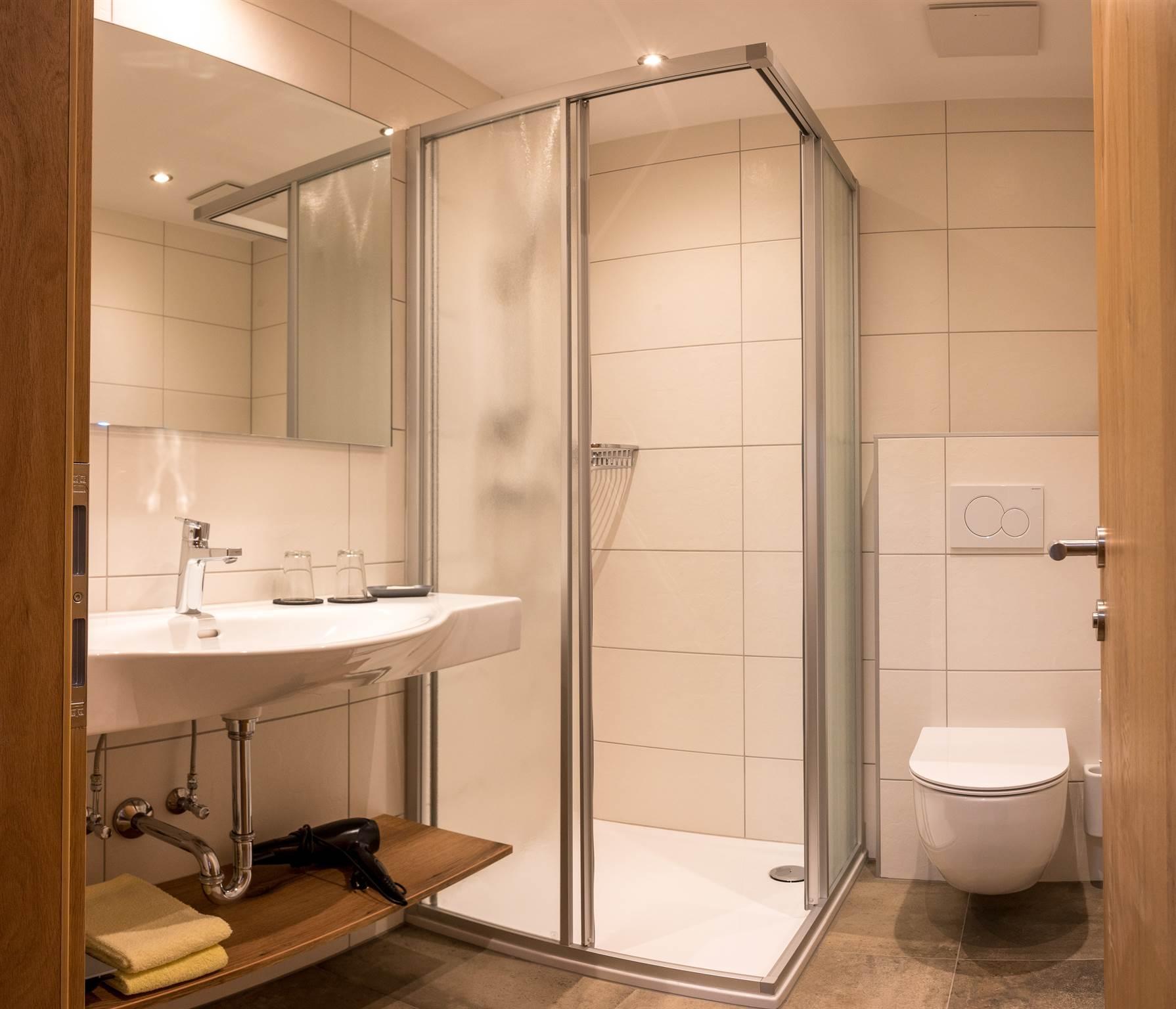 Das Badezimmer verfügt über Dusche, WC, Fön und hochwertige, regionale Kosmetikprodukte.