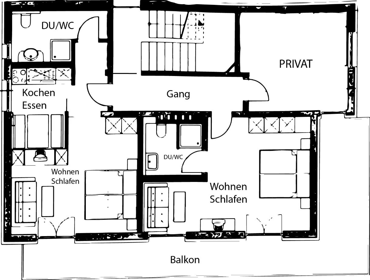 Wohnküche, 2 Schlafzimmer inkl. DU/WC und Balkon. Ausgestattet mit SAT - TV, Bettwäsche,Handtücher, Badetücher, Geschirrtücher, komplett eingerichtete Küche, Kaffeemaschine. Schiraum, Trockenraum für Schibekleidung.