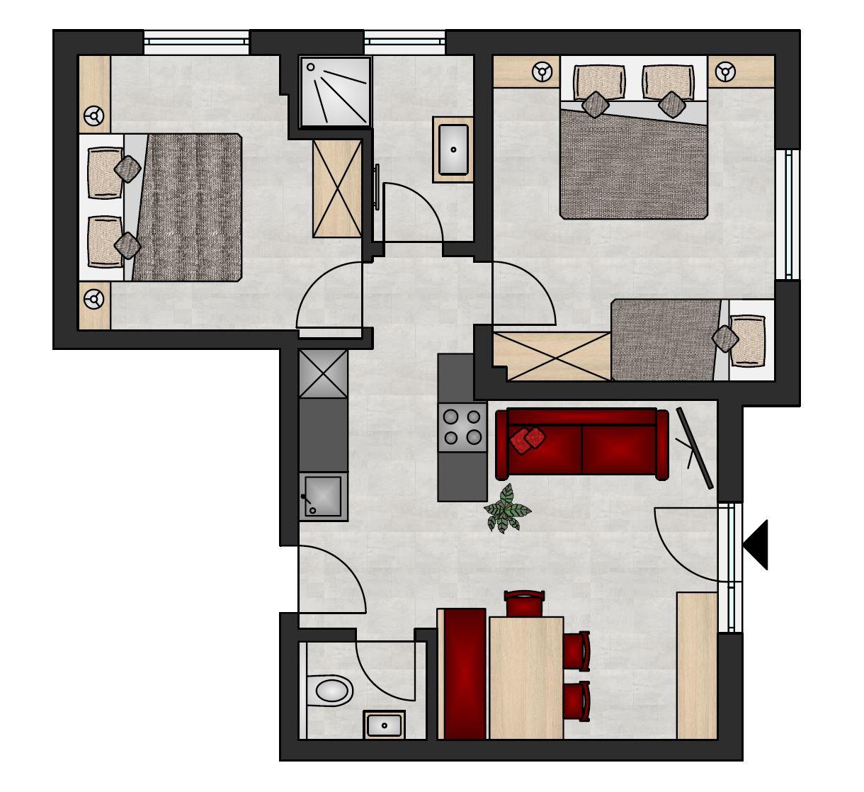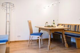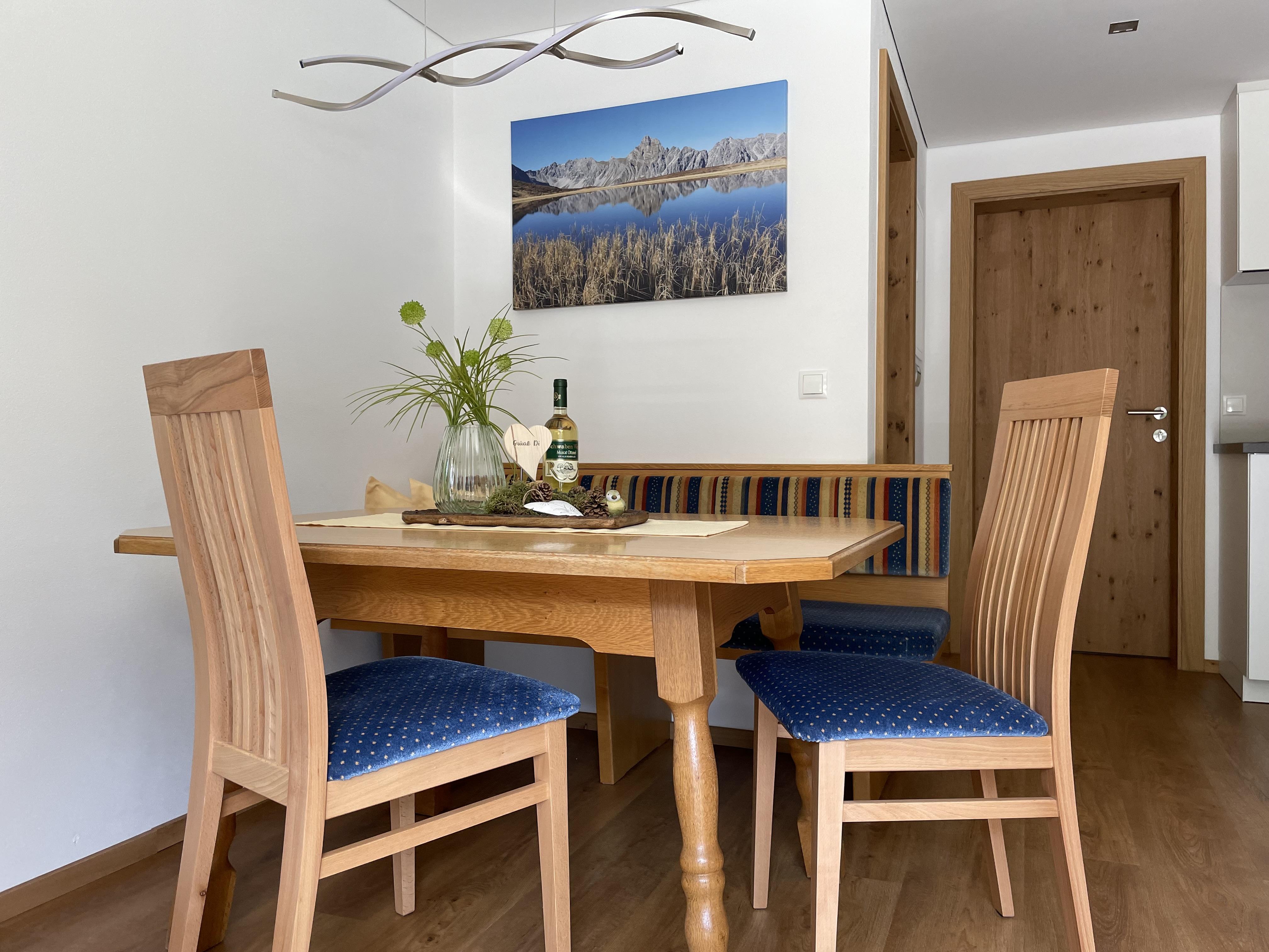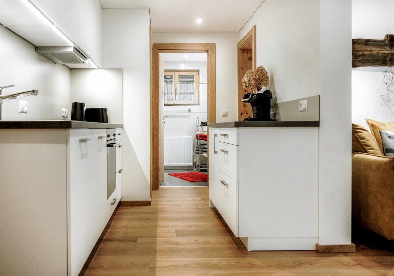 Die Ferienwohnung verfügt über eine Couch, eine Wohnküche mit Sitzecke, Geschirrspüler, Backrohr, Kühlschrank mit Gefrierfach, Kaffeemaschine mit Tabs, Wasserkocher und Toaster. Zwei Schlafzimmer mit einem Doppel- und einem Dreibettzimmer, ein Badezimmer mit Dusche und Seperates WC.
