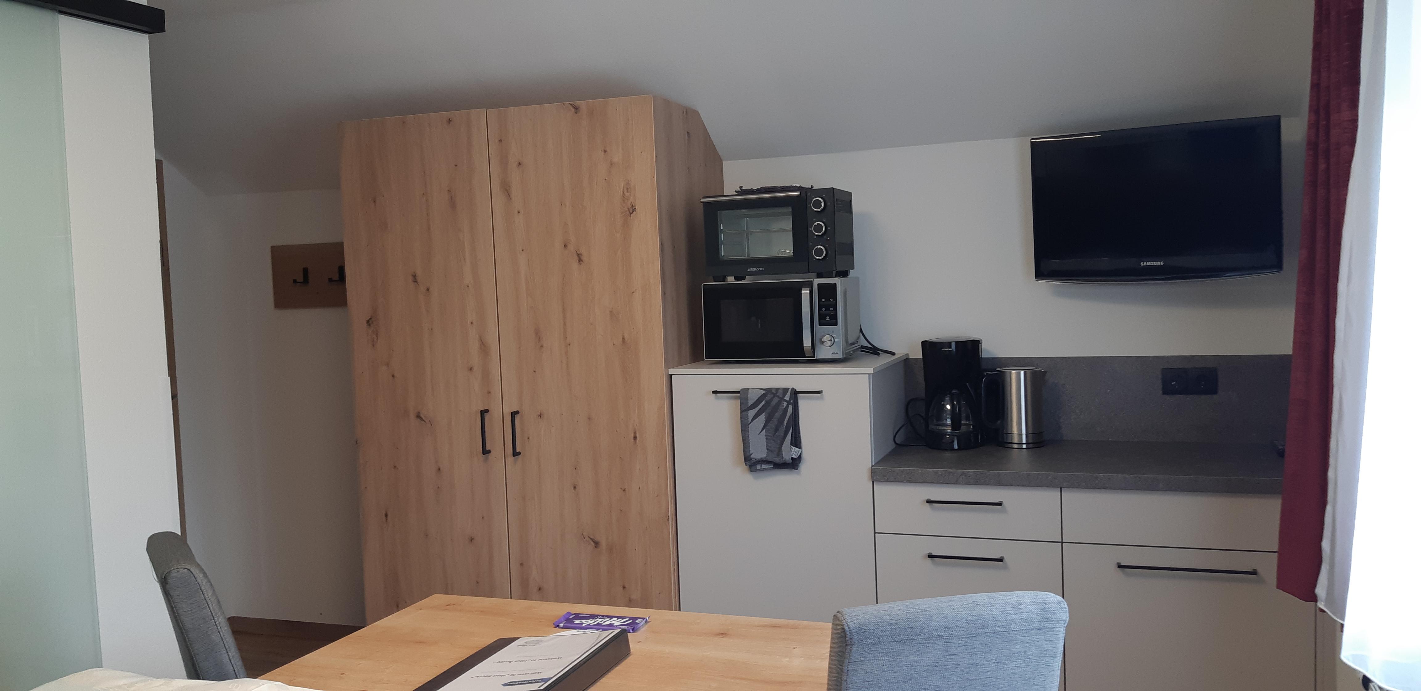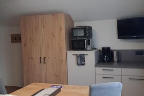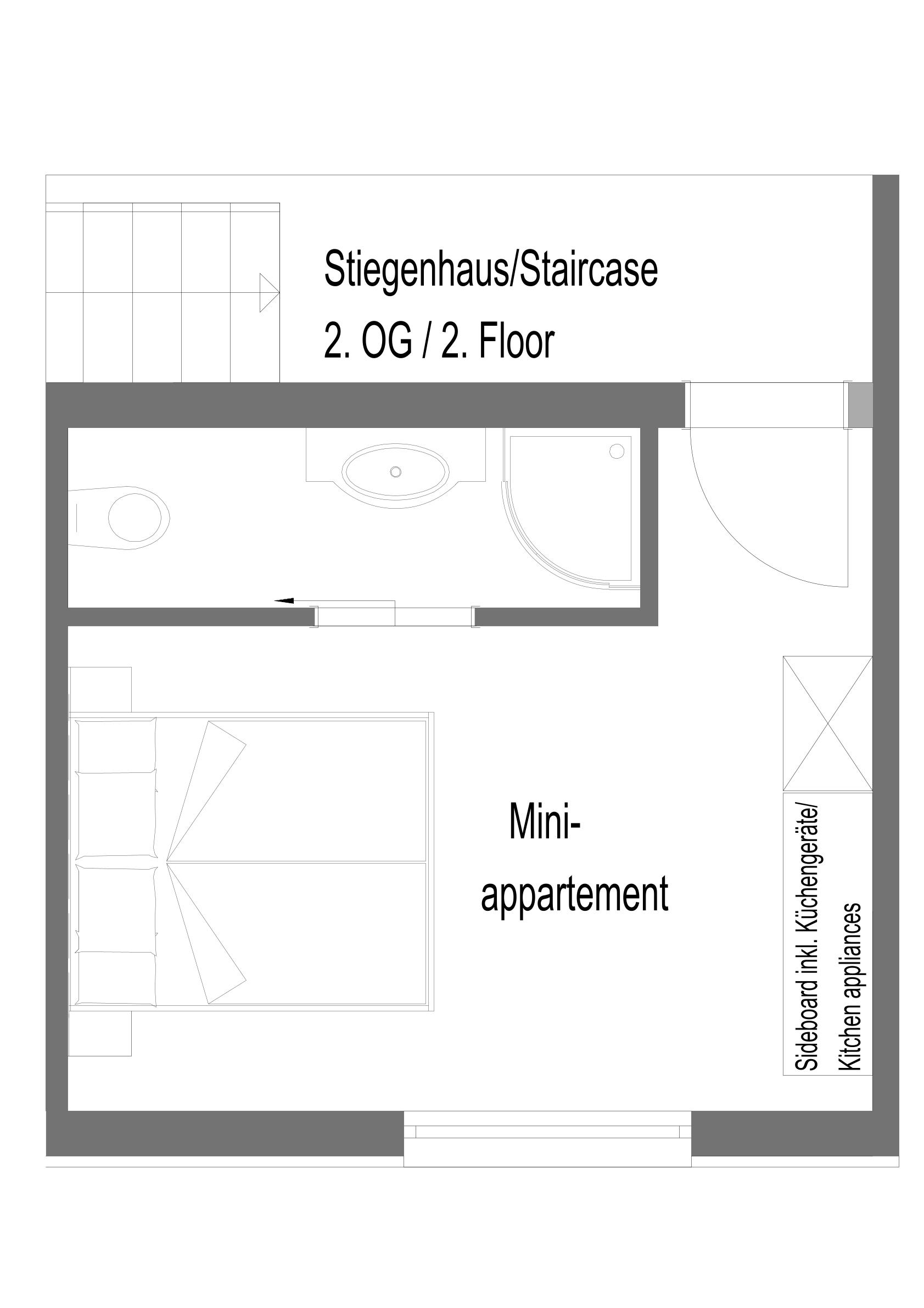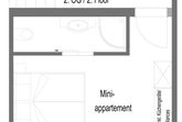 Das Miniappartement verfügt über ein Doppelbett mit Dusche/WC ohne Balkon. Minikühlschrank, Mikrowellenherd, Mini-Backofen, Wasserkocher, Filterkaffeemaschine, Geschirr, Besteck und Geschirrtücher. Bettwäsche und Handtücher inkludiert.