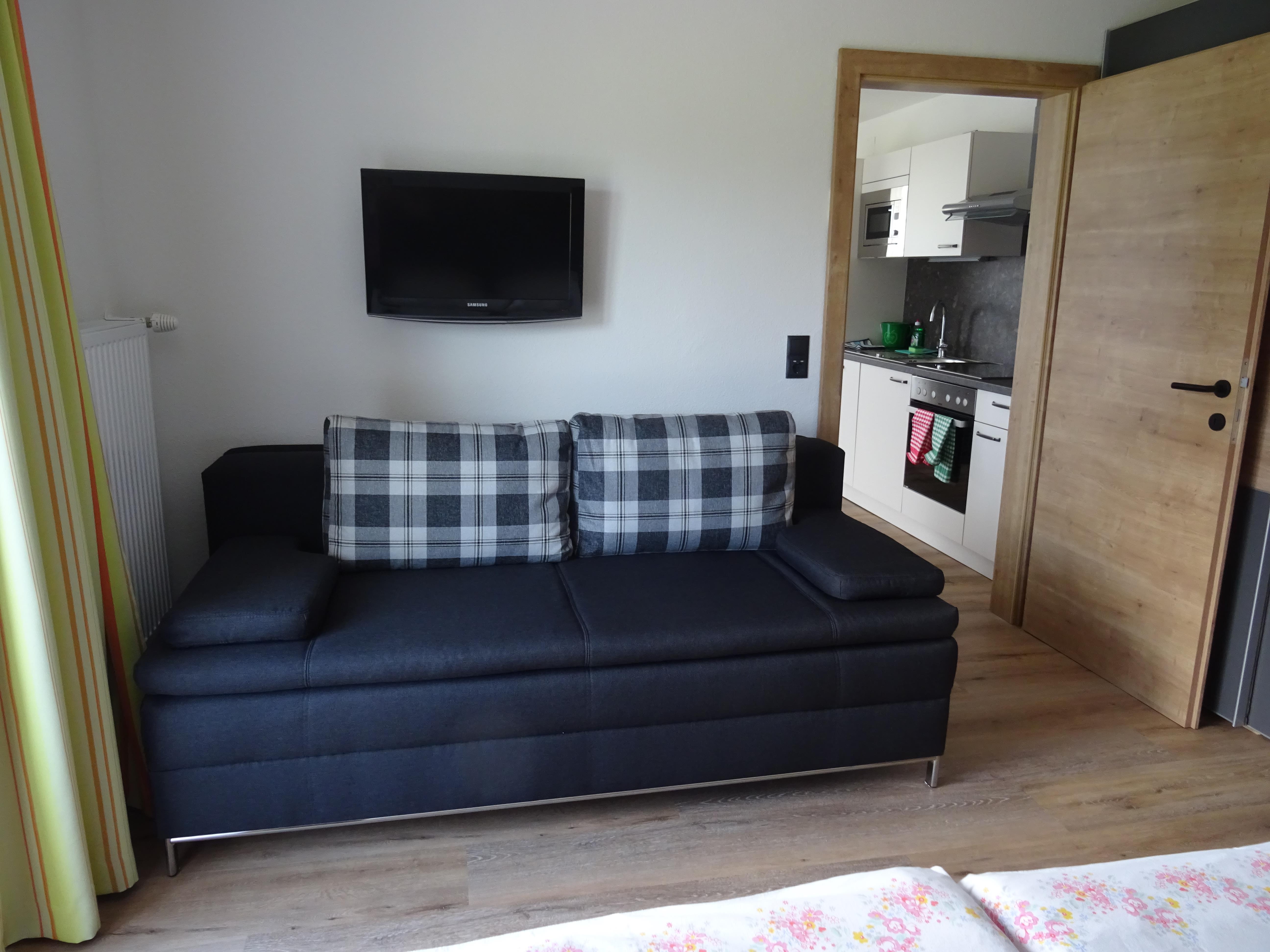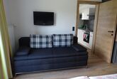 Das Appartement verfügt über einen Balkon, Schlafraum mit Doppelbett, Dusche/WC und ausziehbarer Liegecouch. Wohnküche mit ausziehbarer Liegecouch, Sitzecke, SAT TV, Gratis WLAN. Küche mit Kühlschrank, E-Herd, Mikrowellenherd, Filterkaffeemaschine, Wasserkocher, Geschirrspüler, Geschirr und Besteck, Küchenutensilien, Geschirrtücher, Töpfe und Pfannen. Bettwäsche und Handtücher inkludiert.