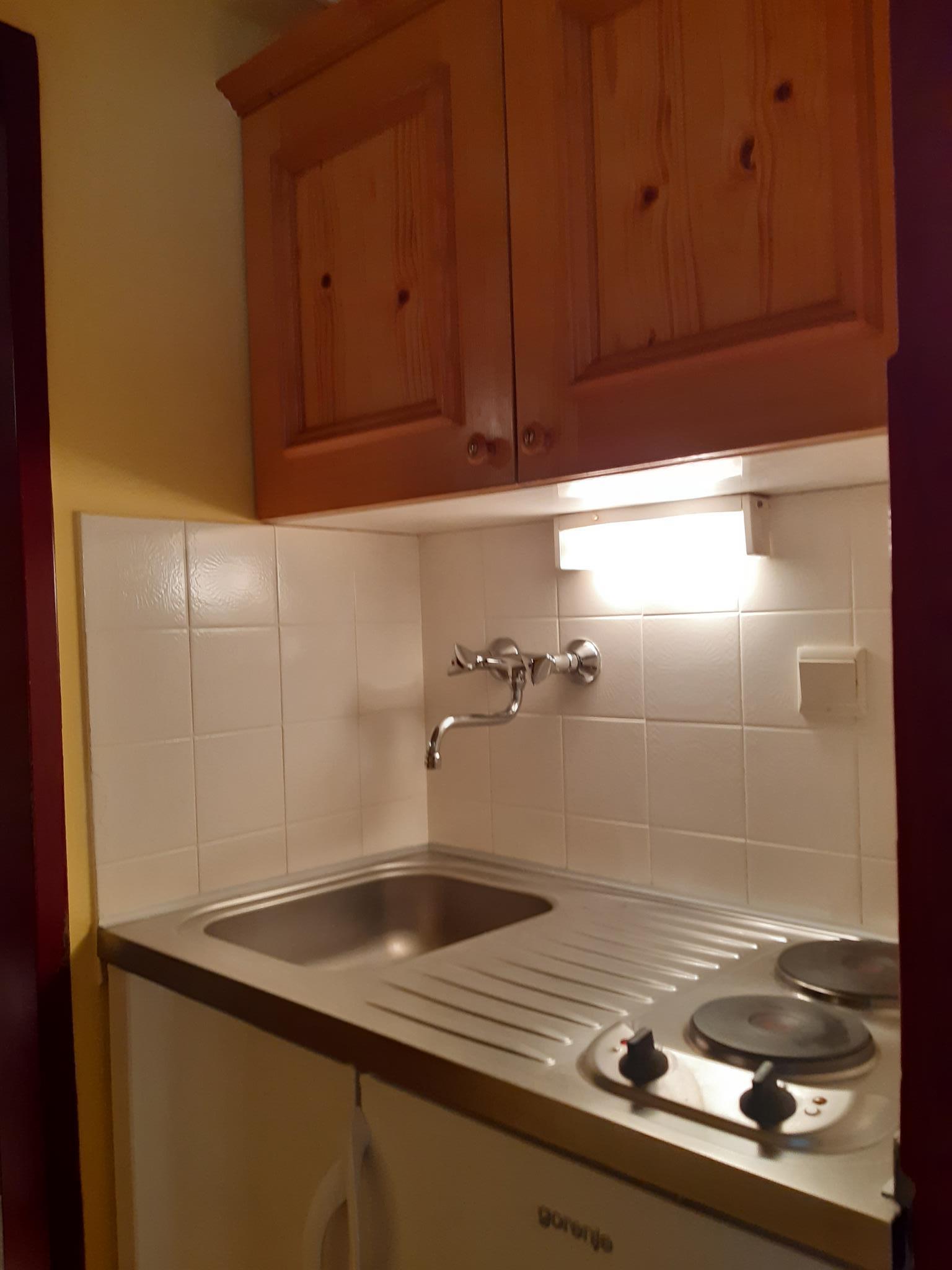 Gemütliches, kleines Studio im Aparthotel Alpine mit Sauna und Fitnessraum. Wohn-Schlafraum mit Doppelbett, Esstisch, Schränke, Kabel-TV, Miniküche mit Spüle, Kühlschrank, Kochplatten, Wasserkocher, Dusche, WC. Bettwäsche, Dusch- und Handtücher im Appartement.