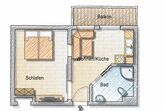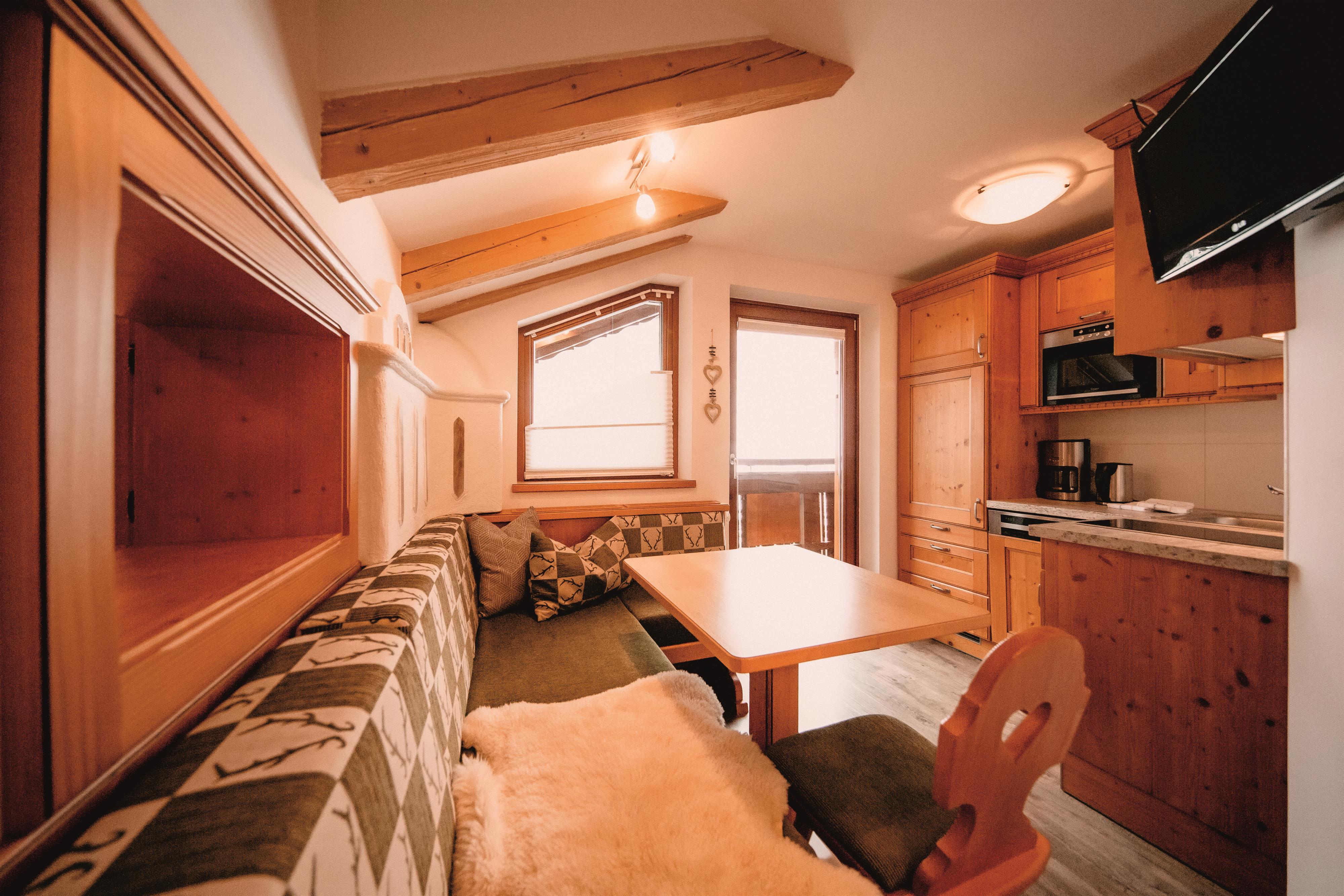 kleines Appartement im Stammhaus mit Doppelzimmer, einer gemütlichen Küche mit Esstisch und Kachelofen. Der Balkon nach Süden lässt die Morgensonne durch die Räume fluten.