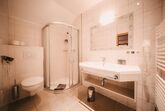 Zwei separate Badezimmer mit Dusche und WC. Ausblick vom Balkon nach Westen mit Dachstein Panorama.