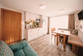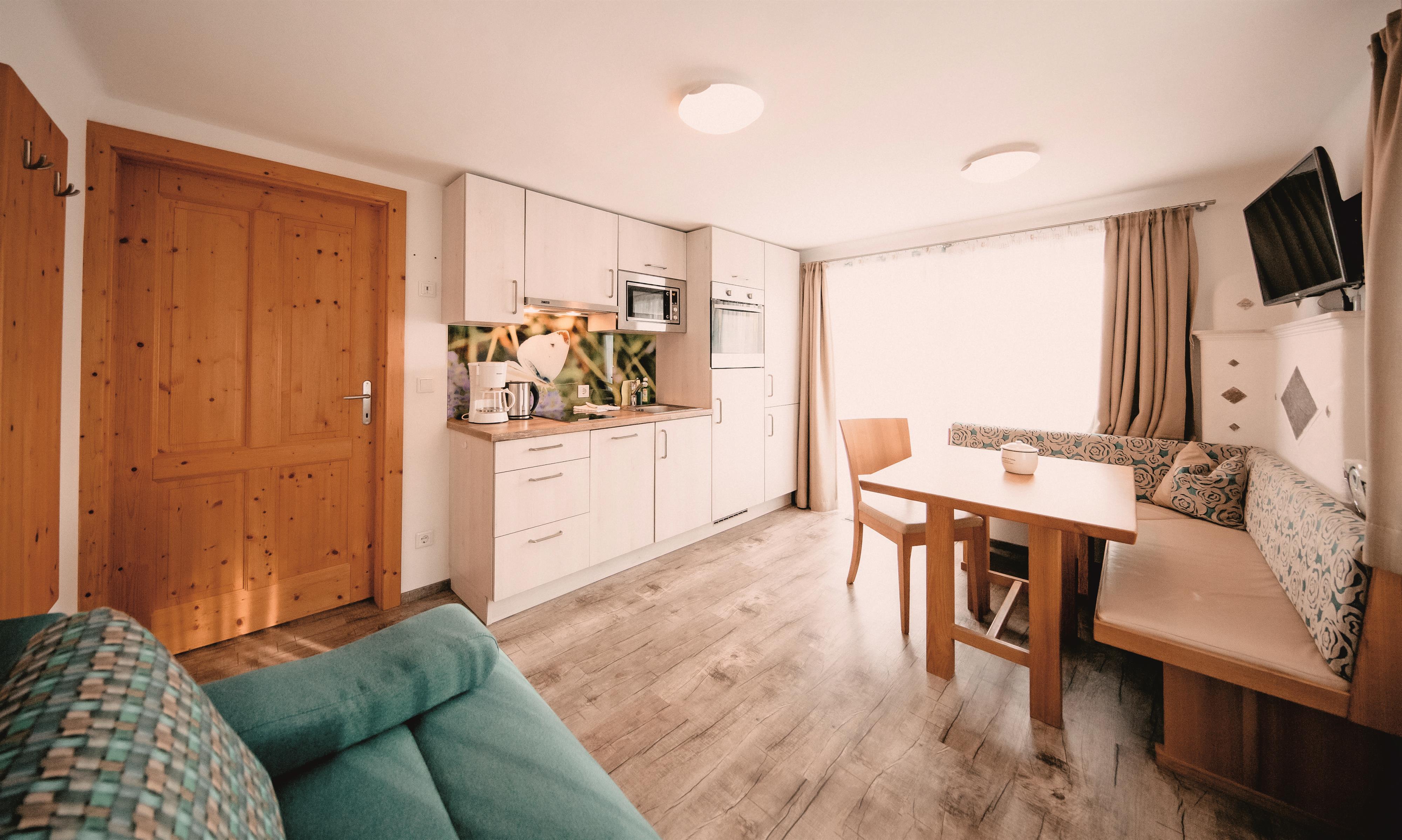 kleines Appartement im Bauerhaus mit Doppelzimmer, einer gemütlichen Wohnküche mit Esstisch, Schlafsofa und Kachelofen.
