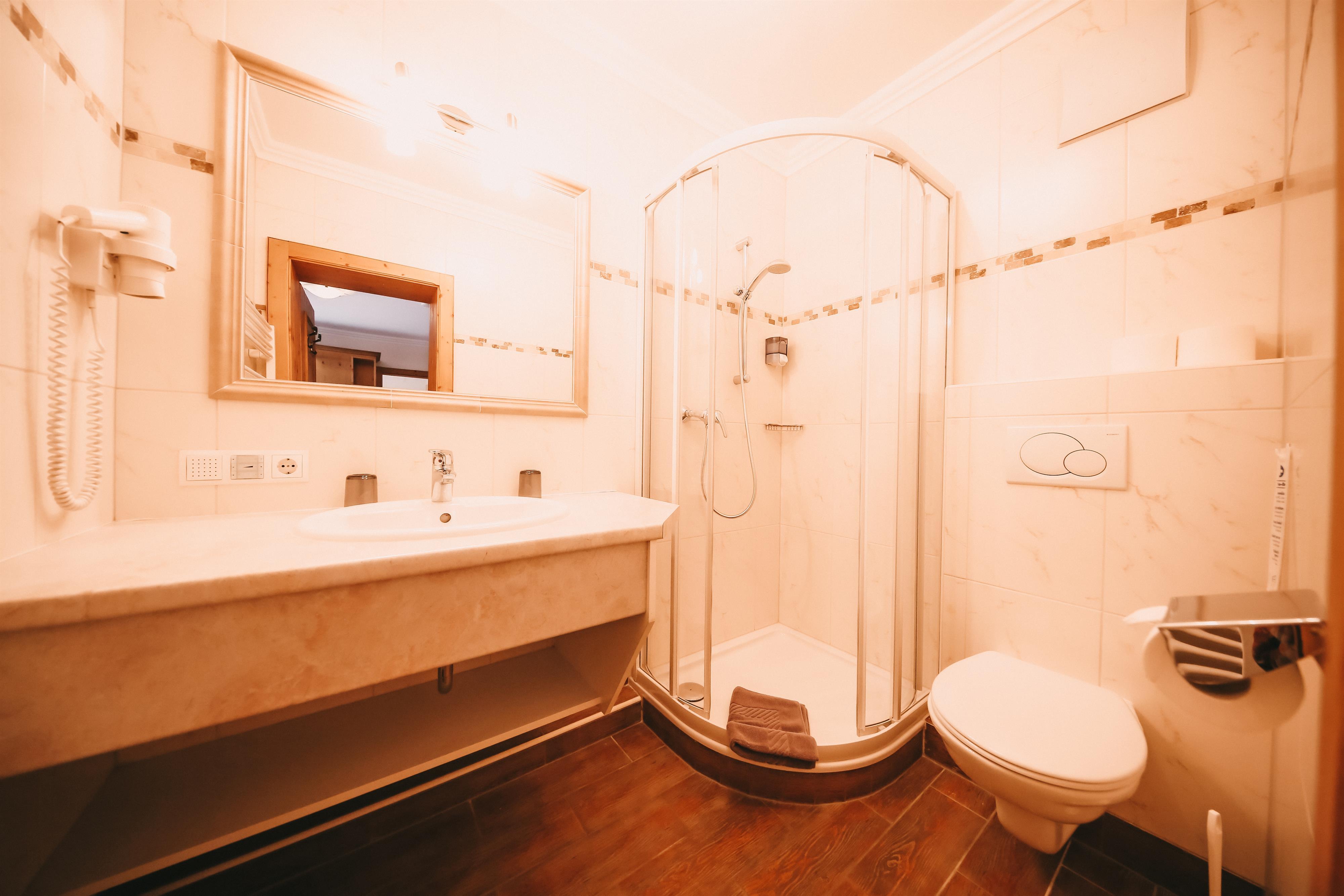 Zwei separate Badezimmer mit Dusche und WC. Ausblick vom Balkon nach Westen mit Dachstein Panorama.