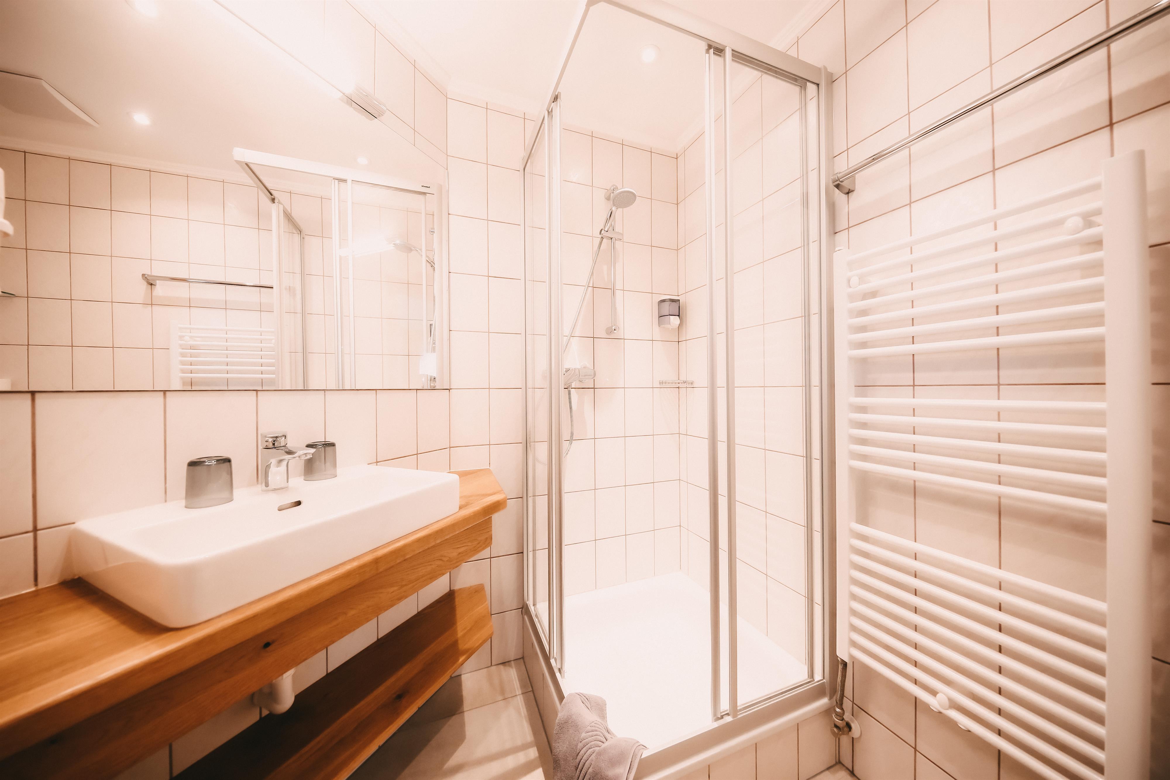 traditionelles Doppelzimmer im Stammhaus mit Balkon, Dusche und WC.