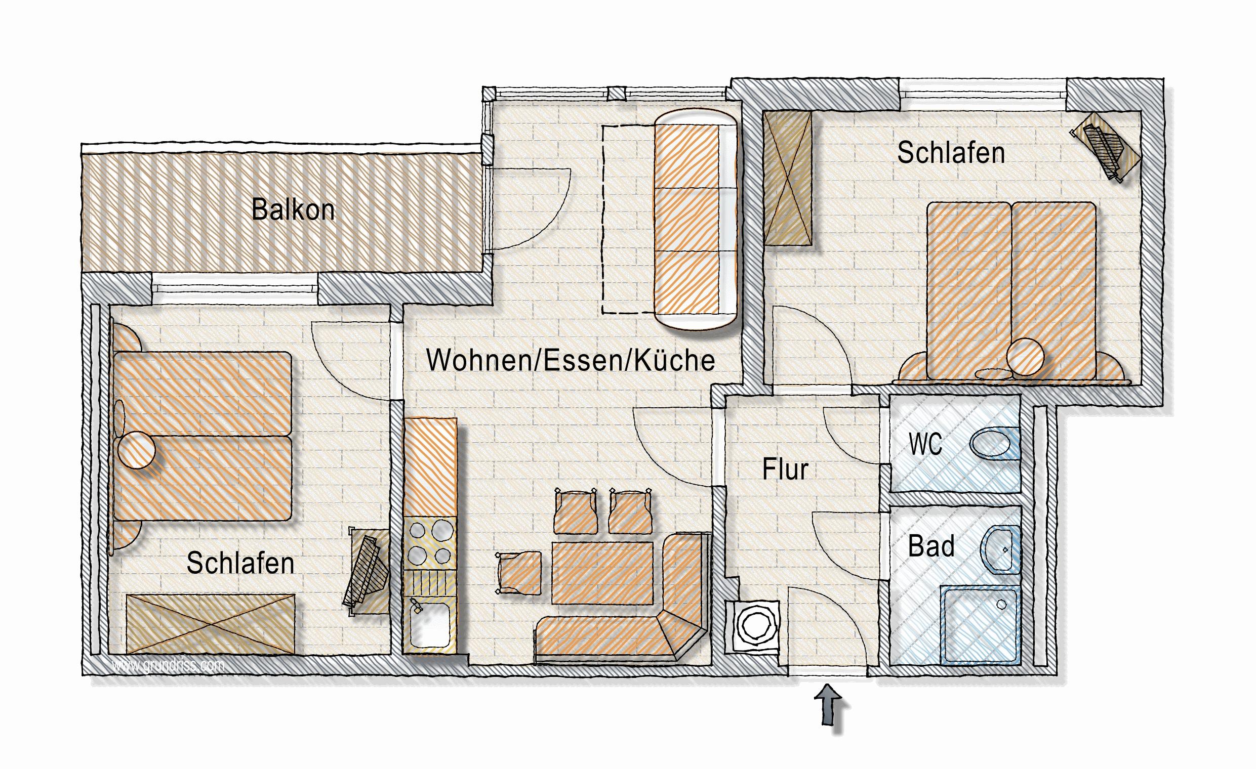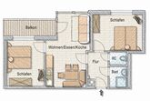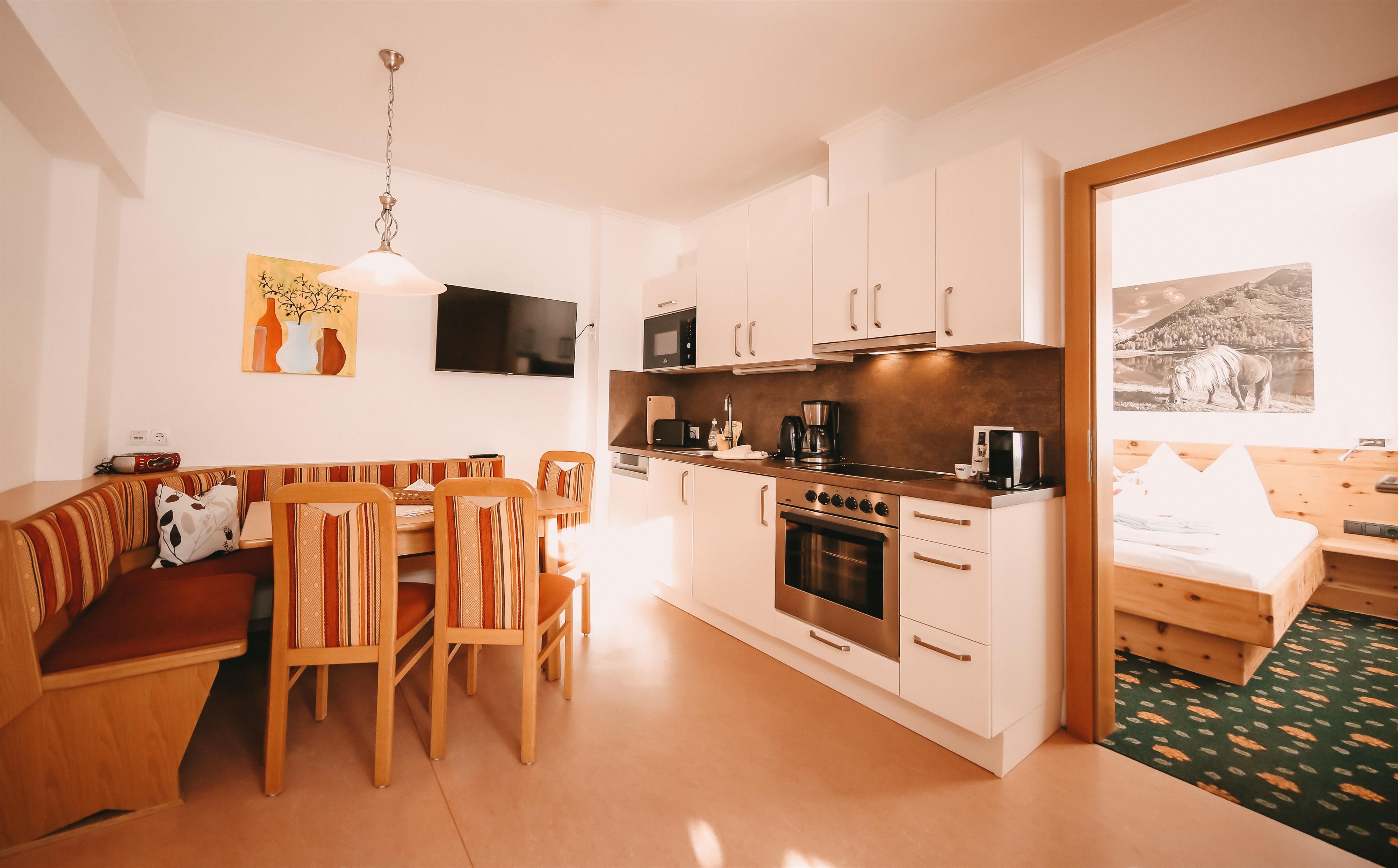 geräumiges Appartement im Appartementhaus mit zwei Doppelzimmern. Wenn man das Sofa in der Wohnküche mitbenützt, bietet das Wintergartl platz für bis zu 6 Personen. Der Ausblick nach Süden vom Wintergarten und vom Balkon lässt die Morgensonne ins Zimmer scheinen