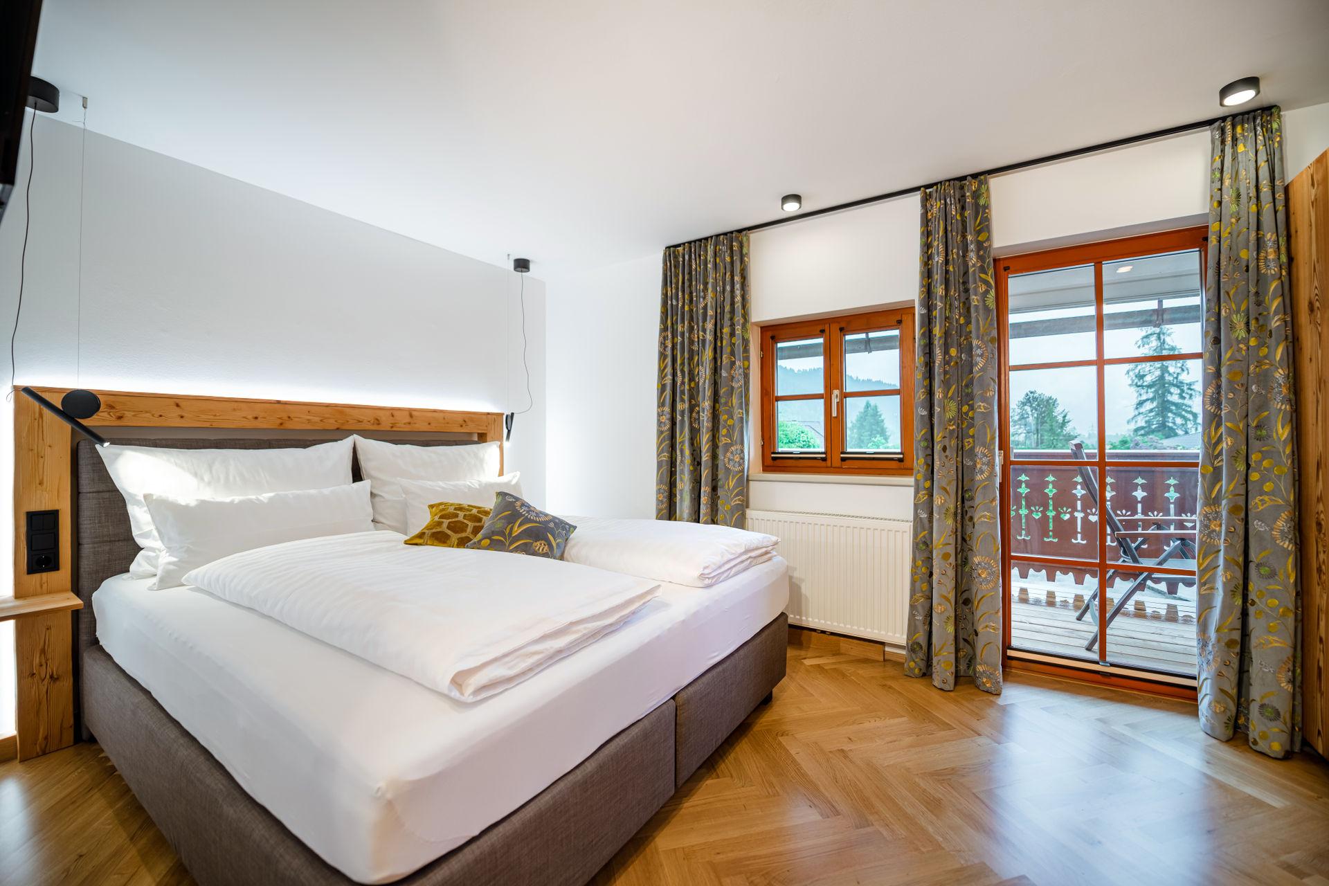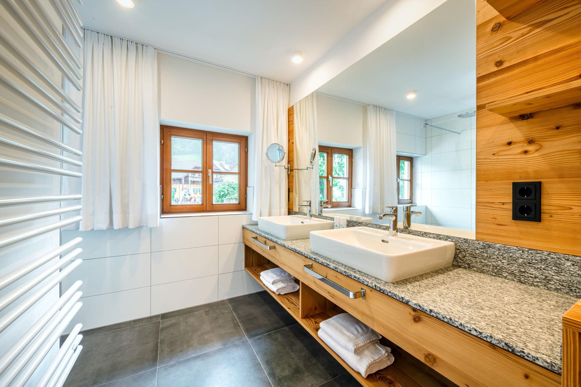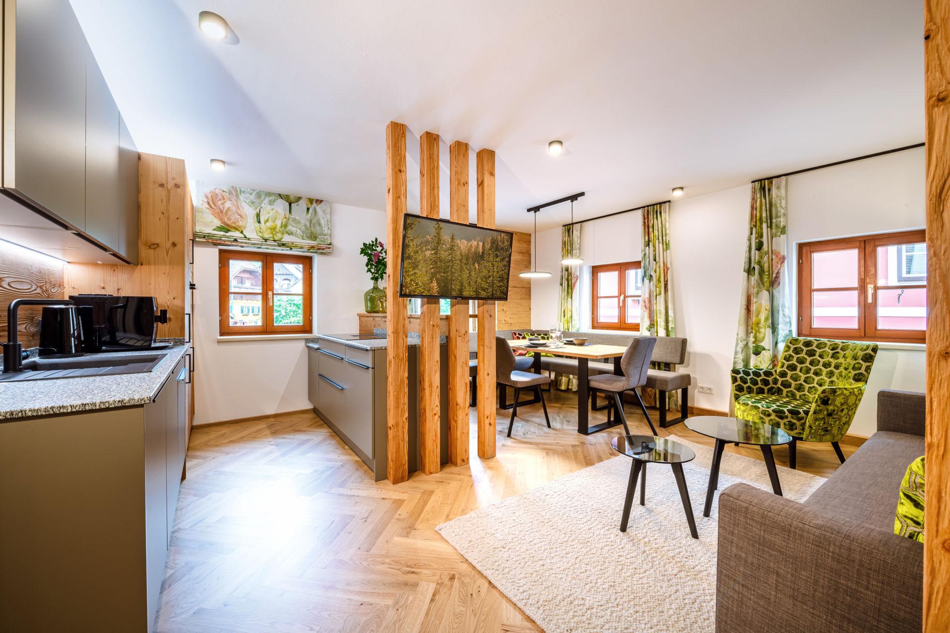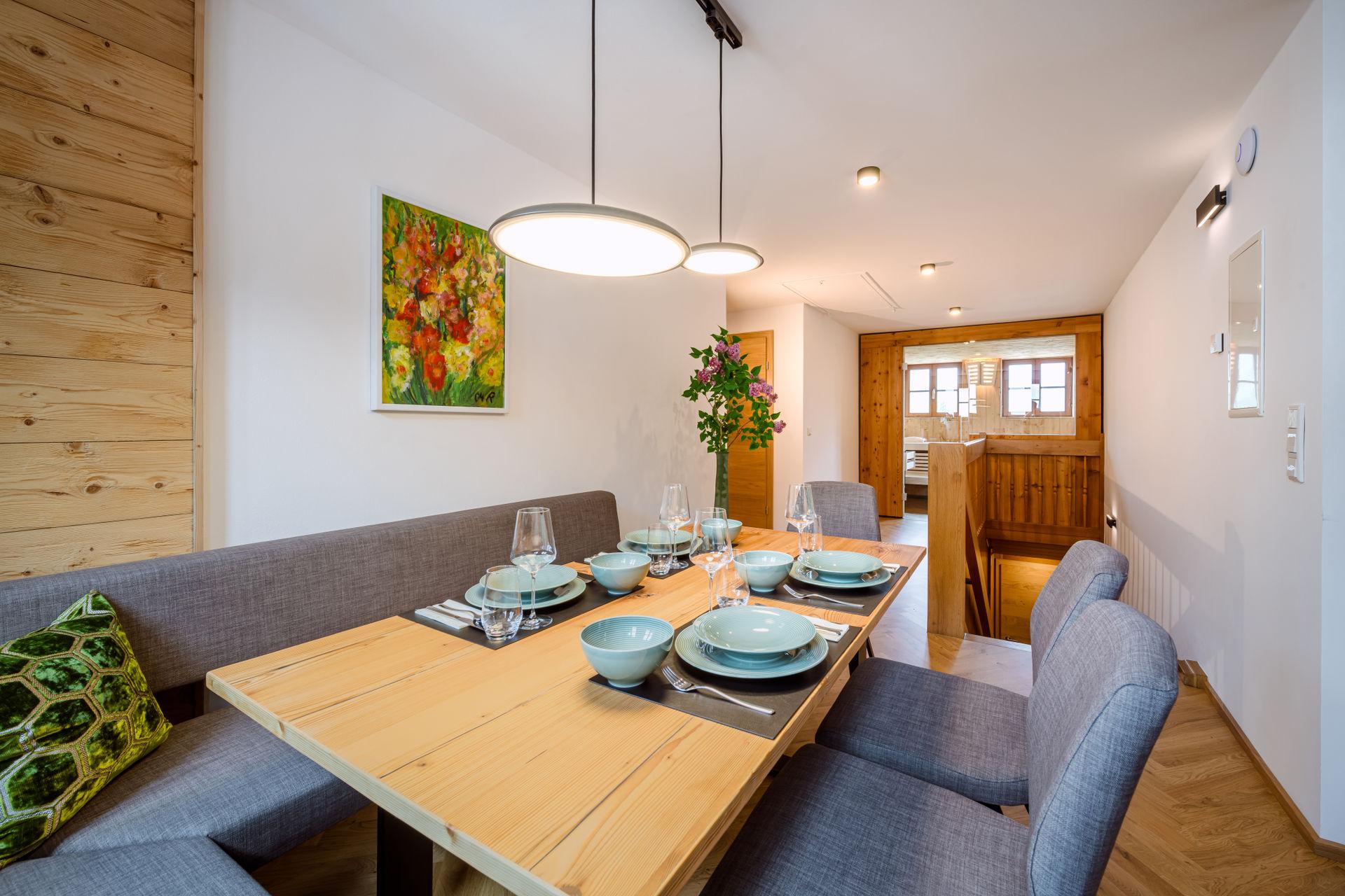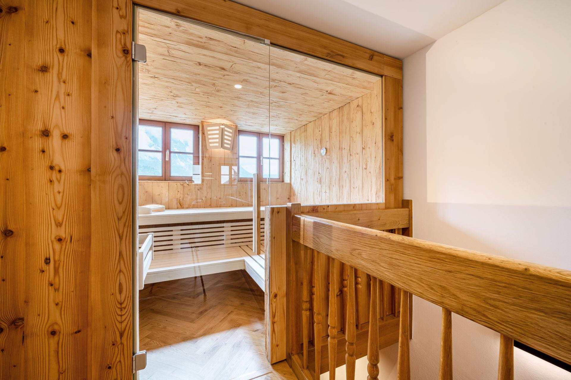 Sie wohnen in einer charmanten Haushälfte im 1. Stock mit einem herrlichen Balkon mit Blick auf den historischen Kirchplatz und den Grimming. Die Verwendung von natürlichen Materialien und regionale Handwerkskünste verleihen dem Interieur eine behagliche Atmosphäre. Eine ansprechende Auswahl an edlen Stoffen, Farben und Mustern verbindet stilvolles Design mit komfortablem Wohnen. Der hochwertige Parkettboden und das moderne Beleuchtungskonzept runden das luxuriöse Ambiente ab. Ein besonderes Highlight ist die eigene Sauna aus heimischem Fichtenholz, die für eine entspannte Auszeit sorgt.