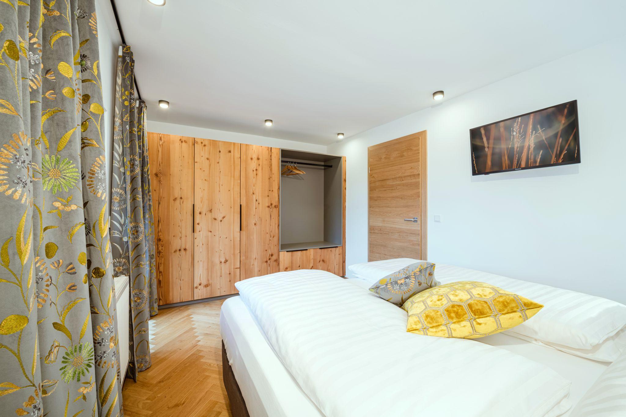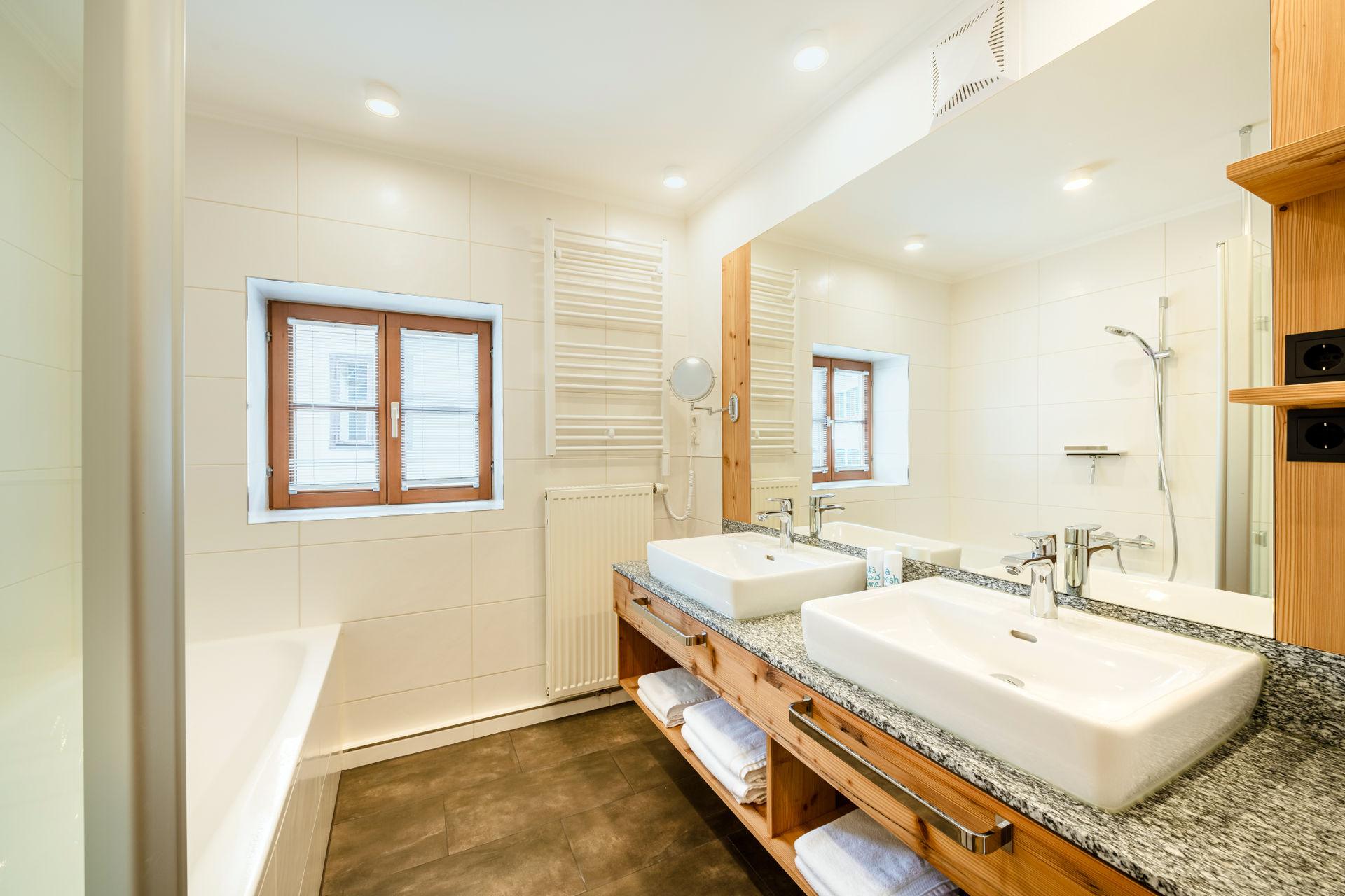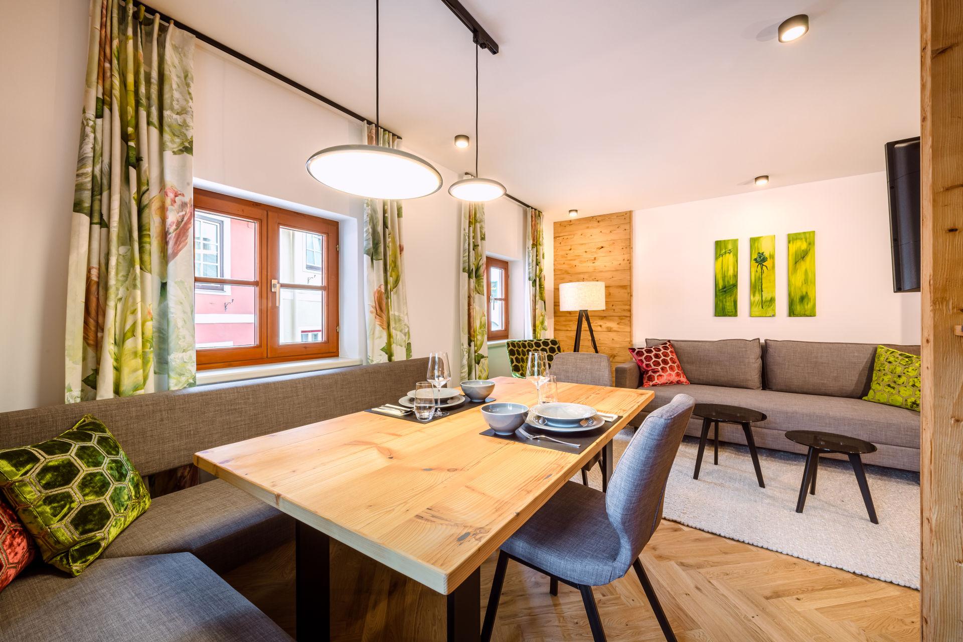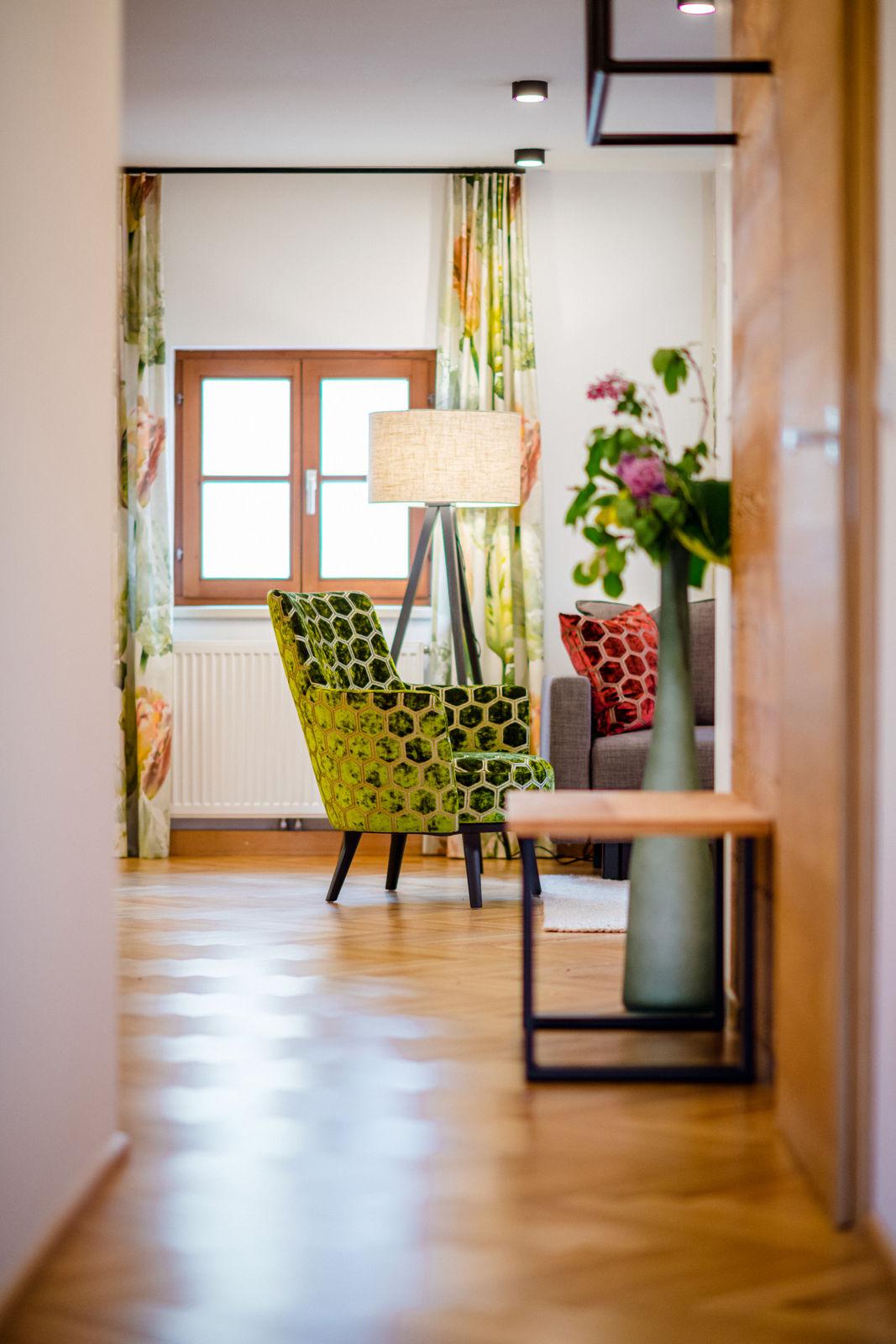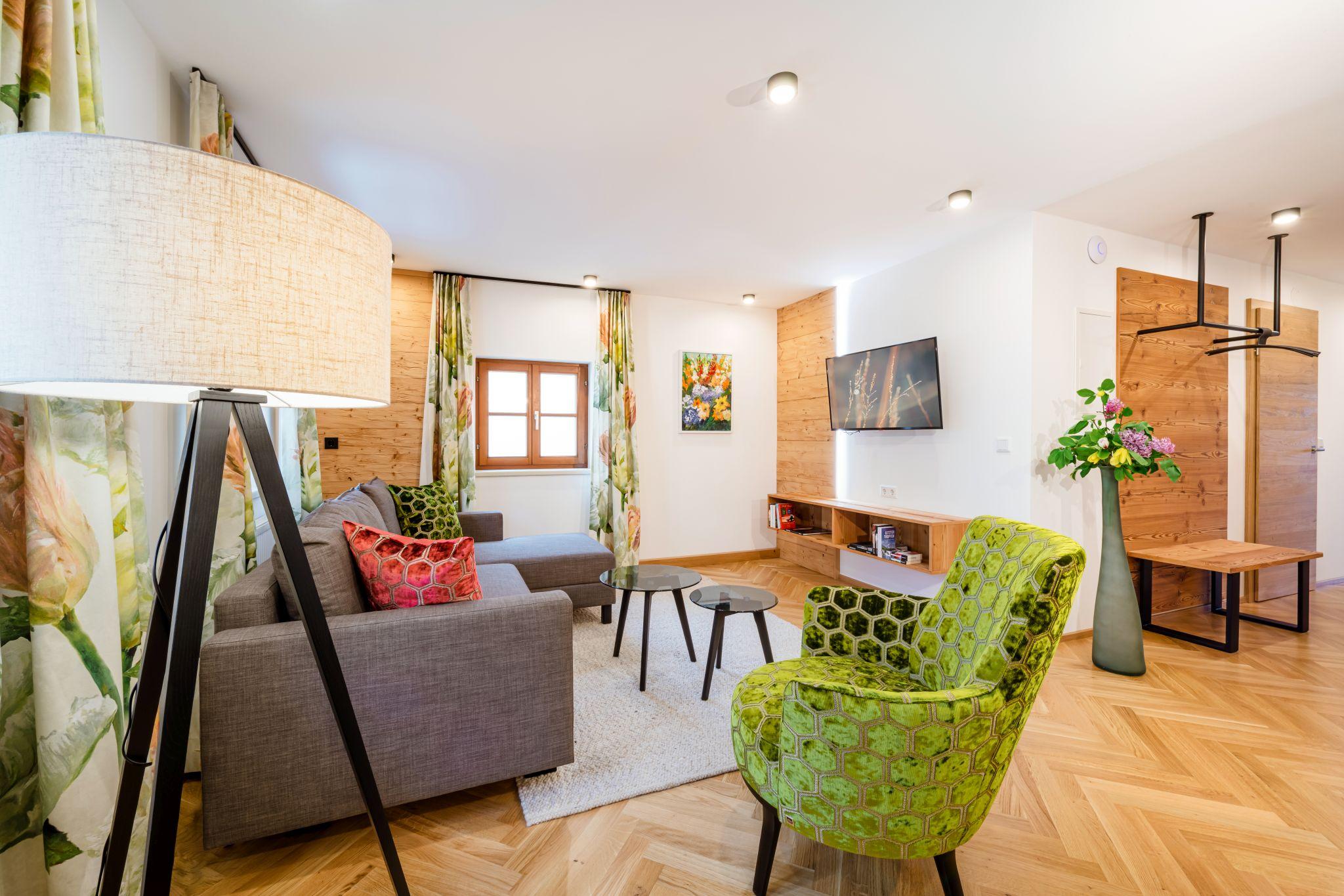Sie wohnen in einer charmanten Haushälfte im 1. Stock mit einem herrlichen Balkon mit Blick auf den historischen Kirchplatz und den Grimming. Die Verwendung von natürlichen Materialien und regionale Handwerkskünste verleihen dem Interieur eine behagliche Atmosphäre. Eine ansprechende Auswahl an edlen Stoffen, Farben und Mustern verbindet stilvolles Design mit komfortablem Wohnen. Der hochwertige Parkettboden und das moderne Beleuchtungskonzept runden das luxuriöse Ambiente ab. Ein besonderes Highlight ist die eigene Sauna aus heimischem Fichtenholz, die für eine entspannte Auszeit sorgt.